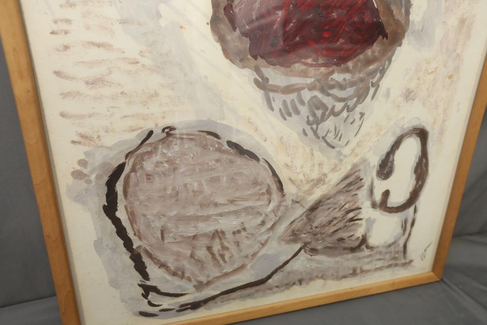 Items includes artwork: Oil on framed canvas, abstract art. Title on back "Night Cometh"; Oil on canvas, abstract art. Title on back "Far Edge". Signature on front appears to read "Syd Weinstein"; Oil on Canvas, abstract herd of horses. Signed in middle of painting. Written on back "Les Affectueux - II 1998"; Oil on canvas framed. Aquatic ship scene; Color etching and aquatint on paper. Titled "Sound of a Forest Brook" Signed lower right " Karl Schrag 86' " numbered 7/40; Print on paper framed. Signed "Amen" in lower right corner. Lower left reads "AP The City" ; Mixed Media Collage on paper. Signed lower left corner "William McGee 1989" Title "By the Sea"; Two framed Egyptian prints on Papyrus. "Nefertari and Hathor" and "Ramsess II Moving into Battle" and much more! Items are located in Pleasant Valley, NY.