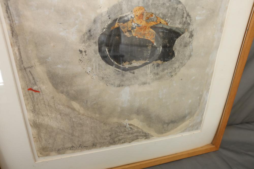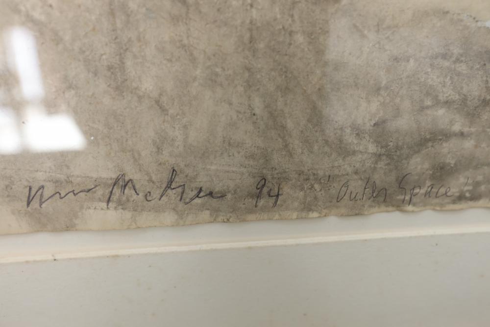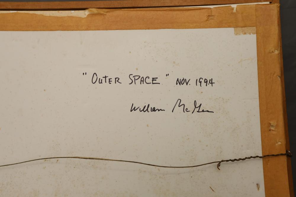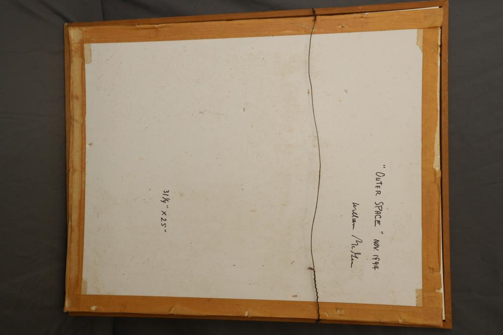 Mixed Media Collage on paper framed. Signed and titled "William McGee 94 Outer Space" 31 1/4"x25". Pickup only.