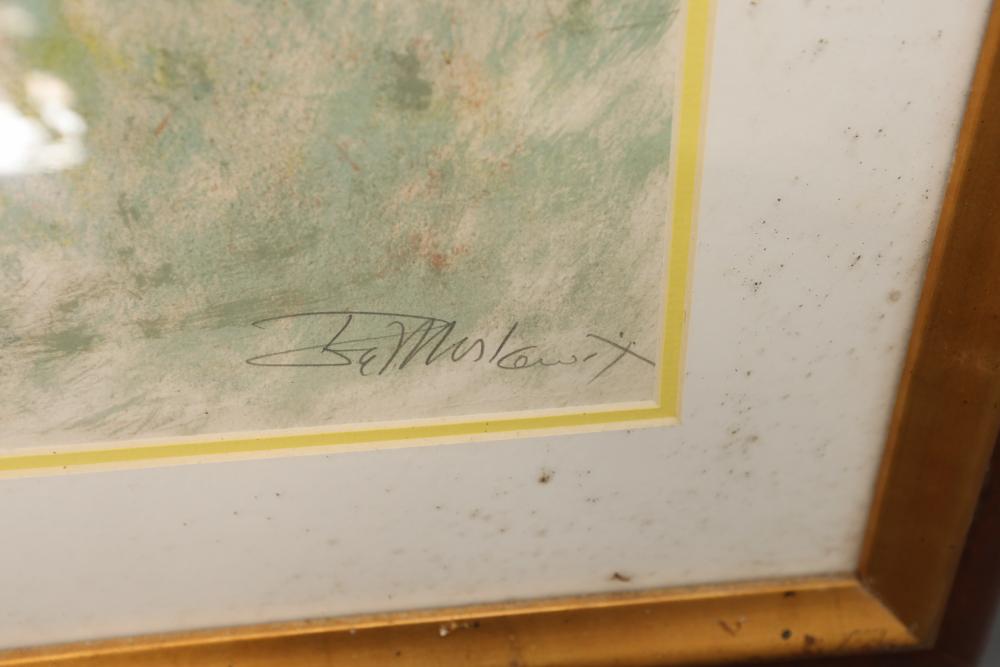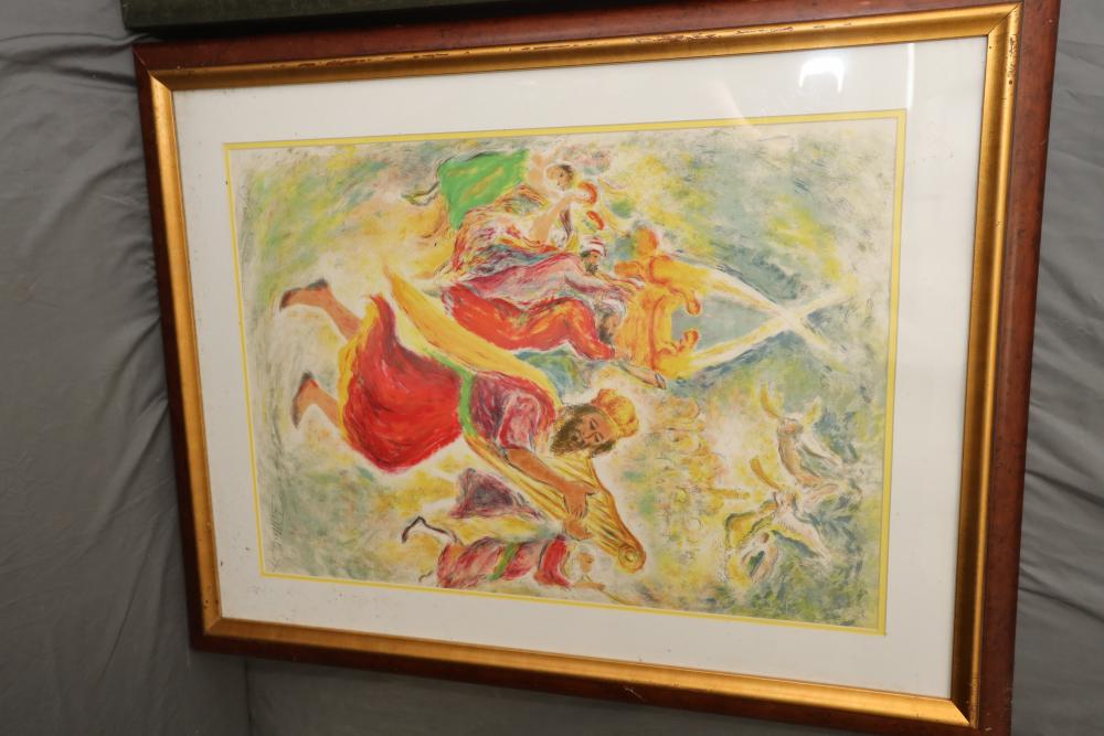 Items includes artwork: Oil on framed canvas, abstract art. Title on back "Night Cometh"; Oil on canvas, abstract art. Title on back "Far Edge". Signature on front appears to read "Syd Weinstein"; Oil on Canvas, abstract herd of horses. Signed in middle of painting. Written on back "Les Affectueux - II 1998"; Oil on canvas framed. Aquatic ship scene; Color etching and aquatint on paper. Titled "Sound of a Forest Brook" Signed lower right " Karl Schrag 86' " numbered 7/40; Print on paper framed. Signed "Amen" in lower right corner. Lower left reads "AP The City" ; Mixed Media Collage on paper. Signed lower left corner "William McGee 1989" Title "By the Sea"; Two framed Egyptian prints on Papyrus. "Nefertari and Hathor" and "Ramsess II Moving into Battle" and much more! Items are located in Pleasant Valley, NY.