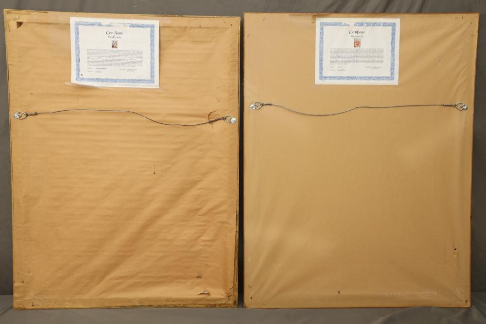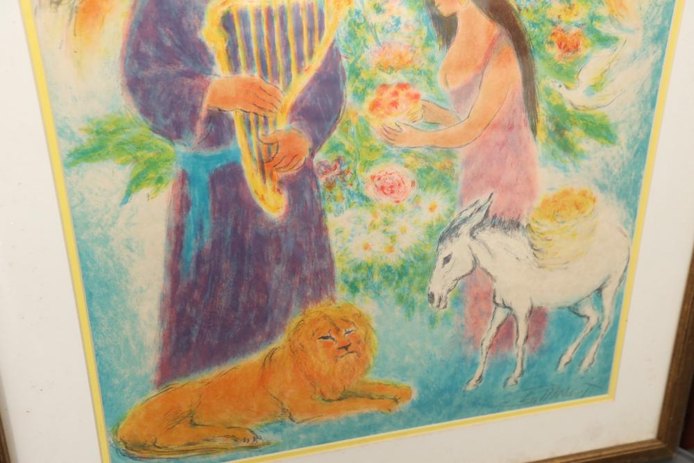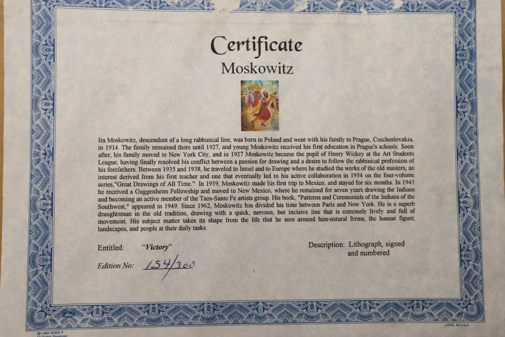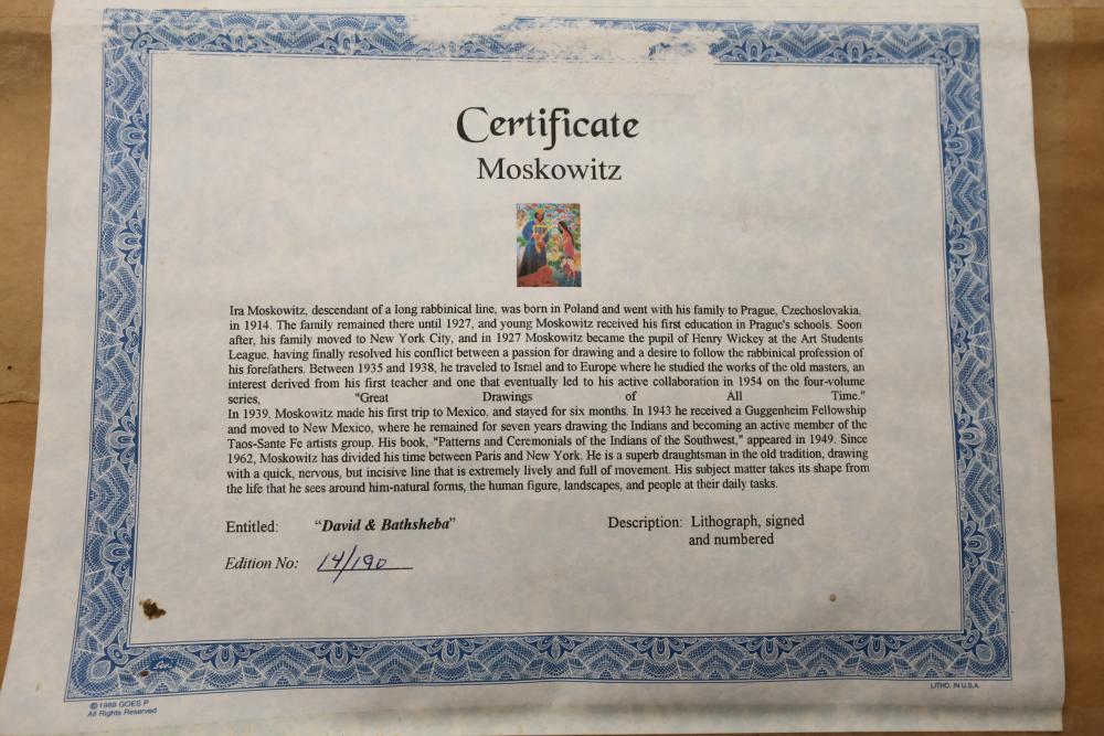 Two Lithographs on paper framed. Both signed "Ira Moskowitz" Titled "David & Bathsheba" numbered 14/190 38"x29" and "Victory" numbered 154/300. 39"x30". Pickup only.