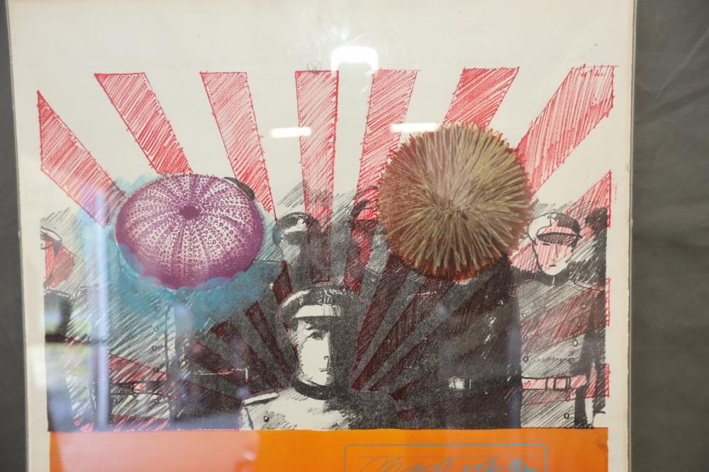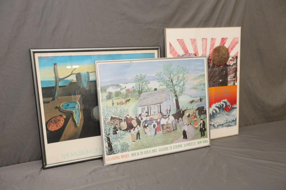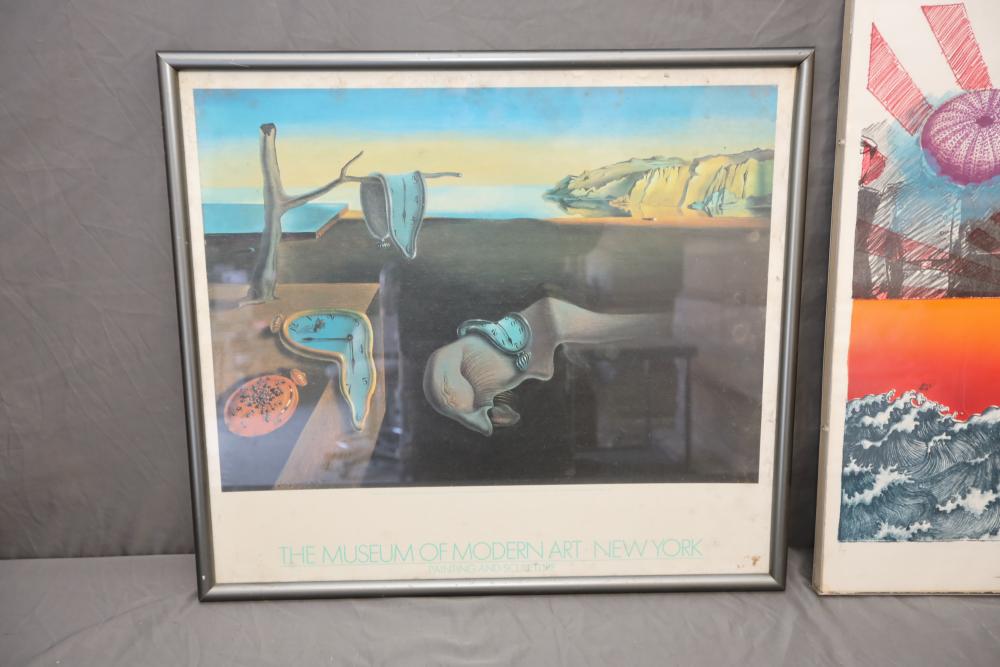 Three framed posters incl; Rising sun with soldier, Salvador Dhali melting clocks, depiction of classical greenscape. Pickup only.