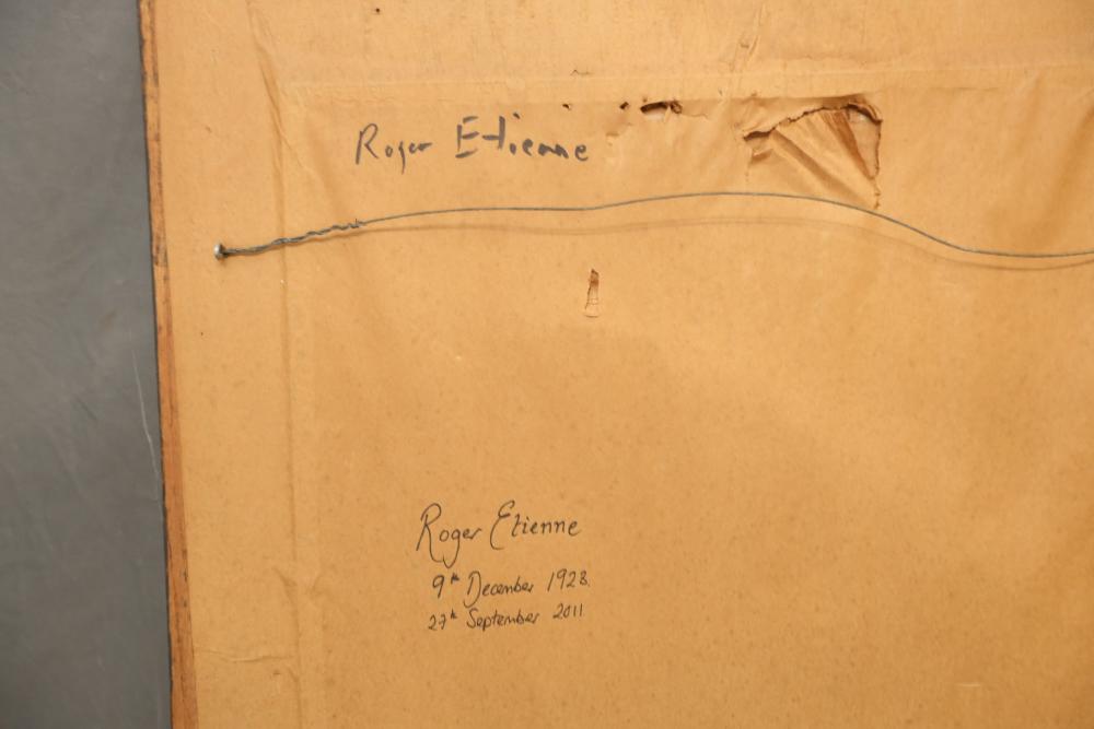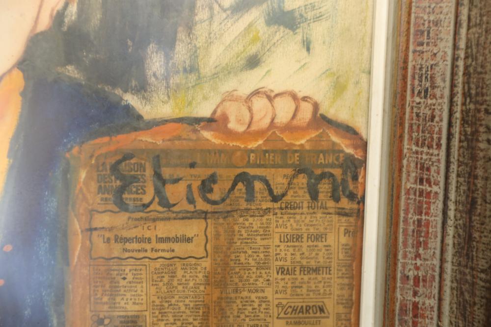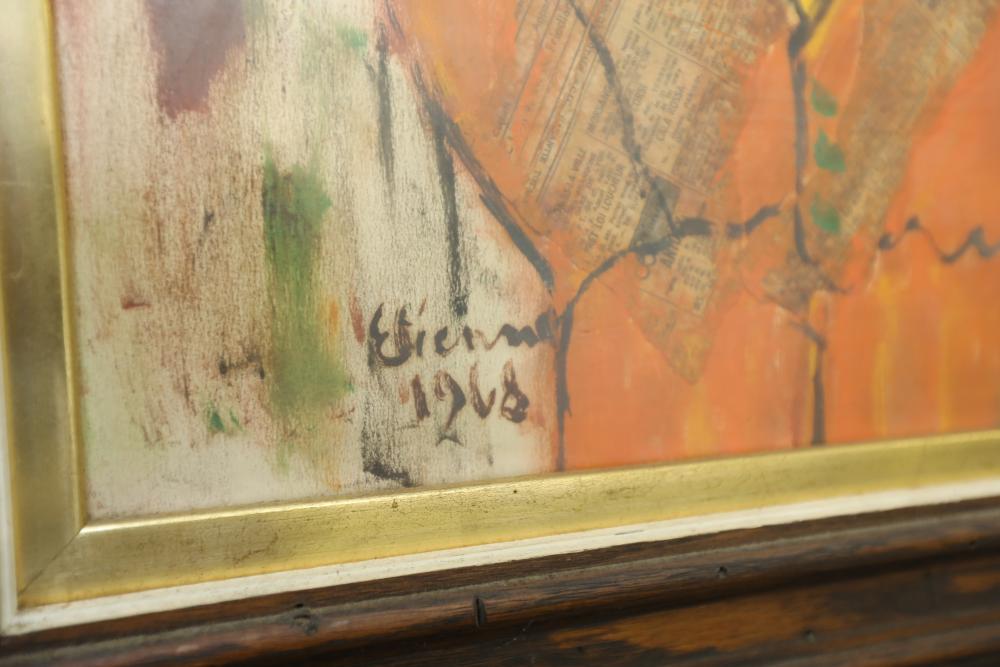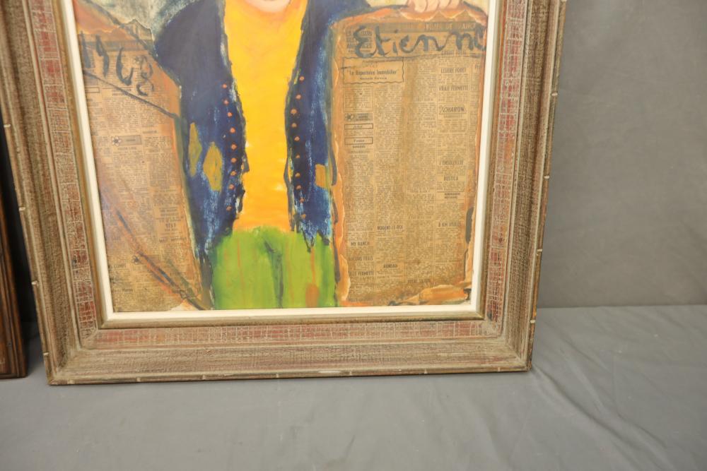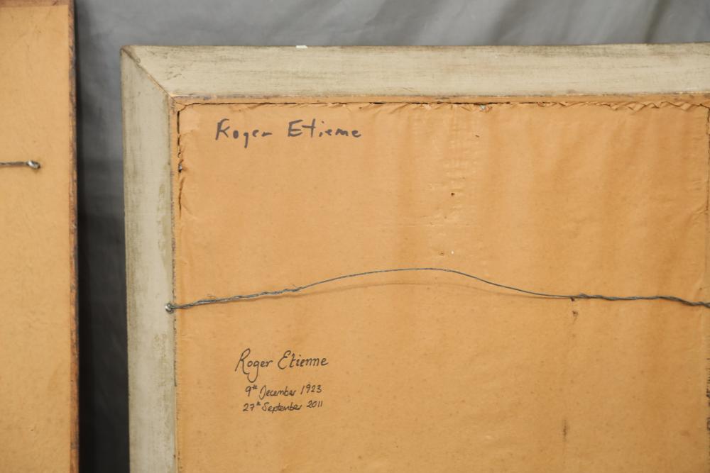 Two Mix Media collages on paper. Framed. Signed and dated "Roger Etinne 1968" within the piece. Signed on back as well with birth and death dates.. Pickup only.