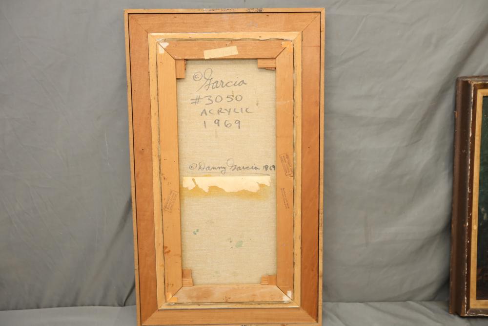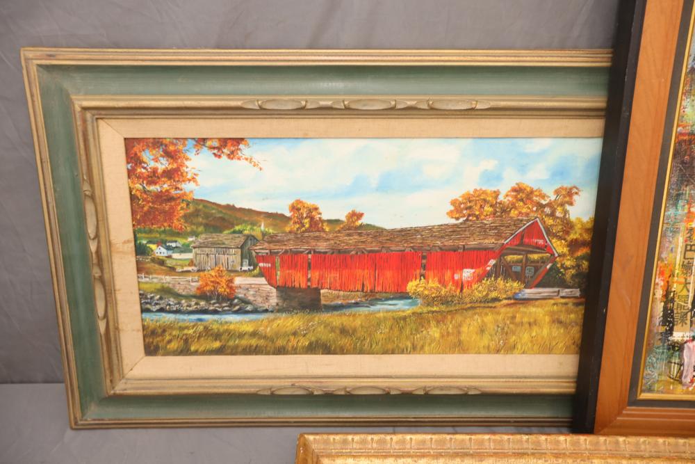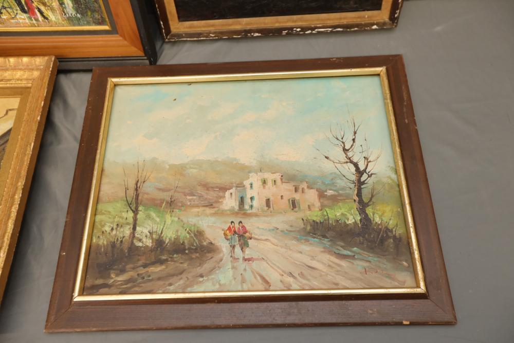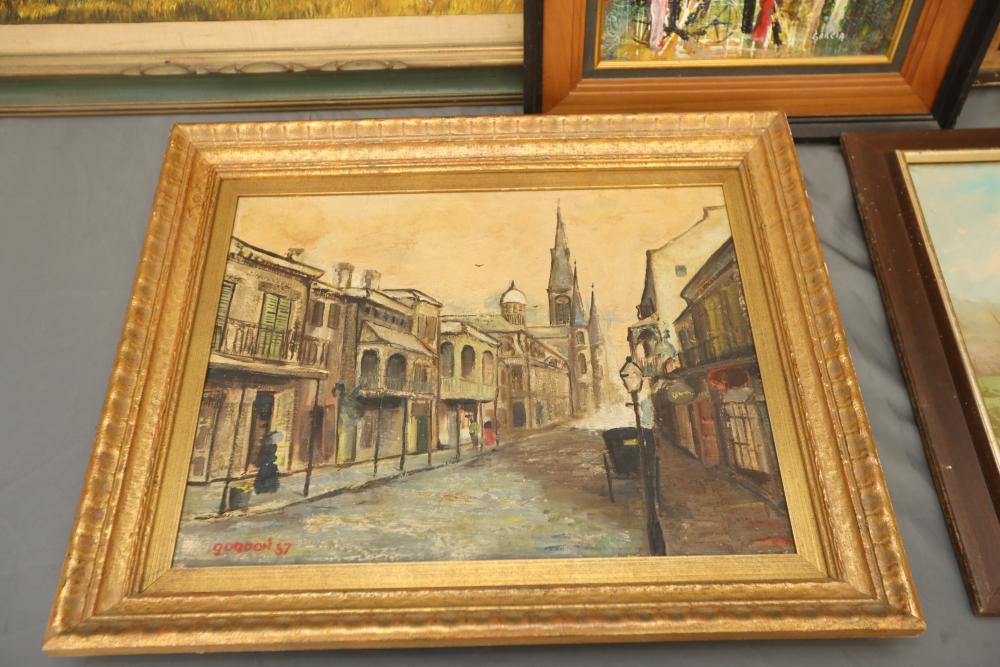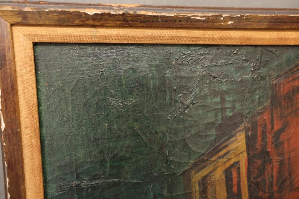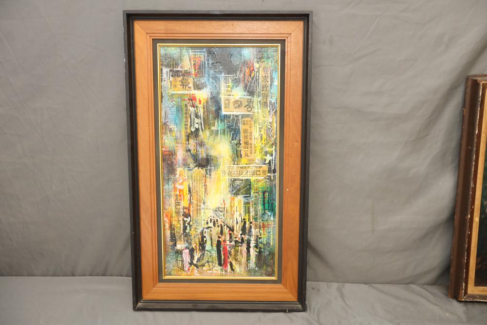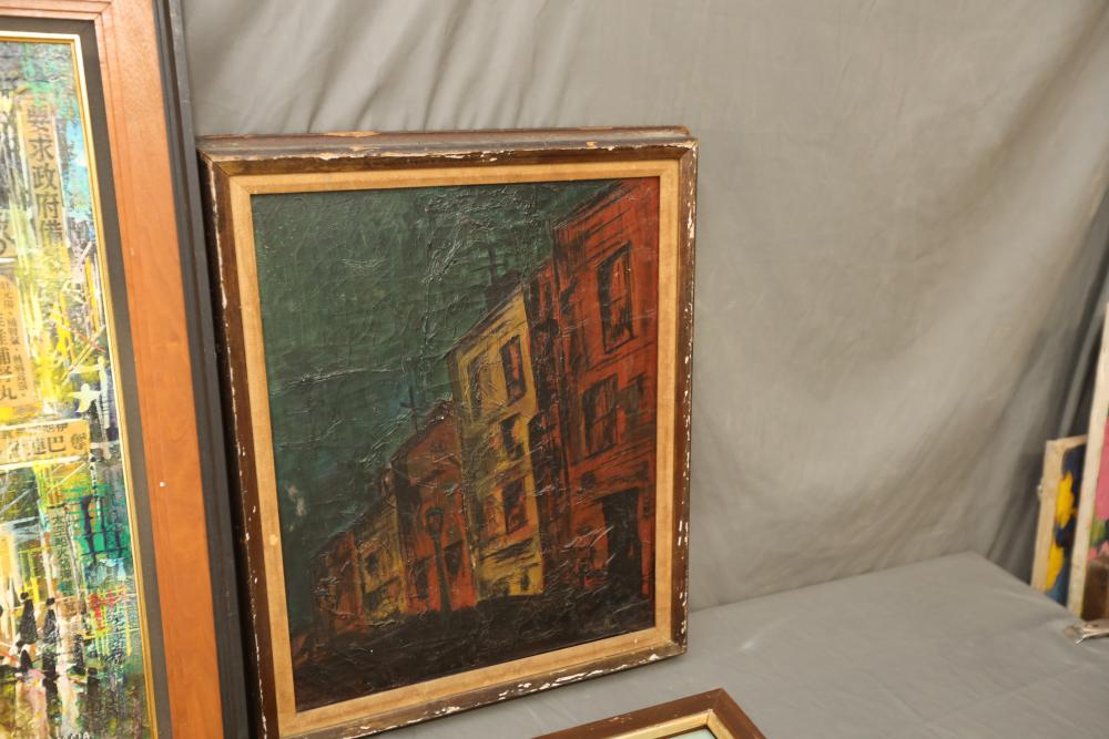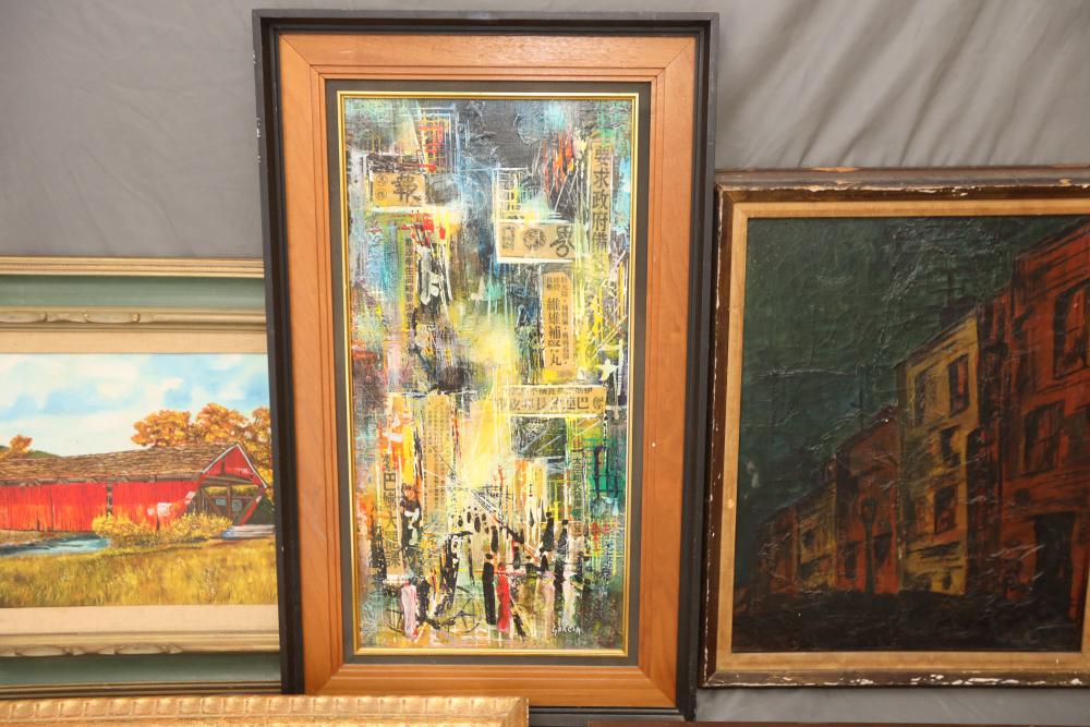 Items includes artwork: Oil on framed canvas, abstract art. Title on back "Night Cometh"; Oil on canvas, abstract art. Title on back "Far Edge". Signature on front appears to read "Syd Weinstein"; Oil on Canvas, abstract herd of horses. Signed in middle of painting. Written on back "Les Affectueux - II 1998"; Oil on canvas framed. Aquatic ship scene; Color etching and aquatint on paper. Titled "Sound of a Forest Brook" Signed lower right " Karl Schrag 86' " numbered 7/40; Print on paper framed. Signed "Amen" in lower right corner. Lower left reads "AP The City" ; Mixed Media Collage on paper. Signed lower left corner "William McGee 1989" Title "By the Sea"; Two framed Egyptian prints on Papyrus. "Nefertari and Hathor" and "Ramsess II Moving into Battle" and much more! Items are located in Pleasant Valley, NY.