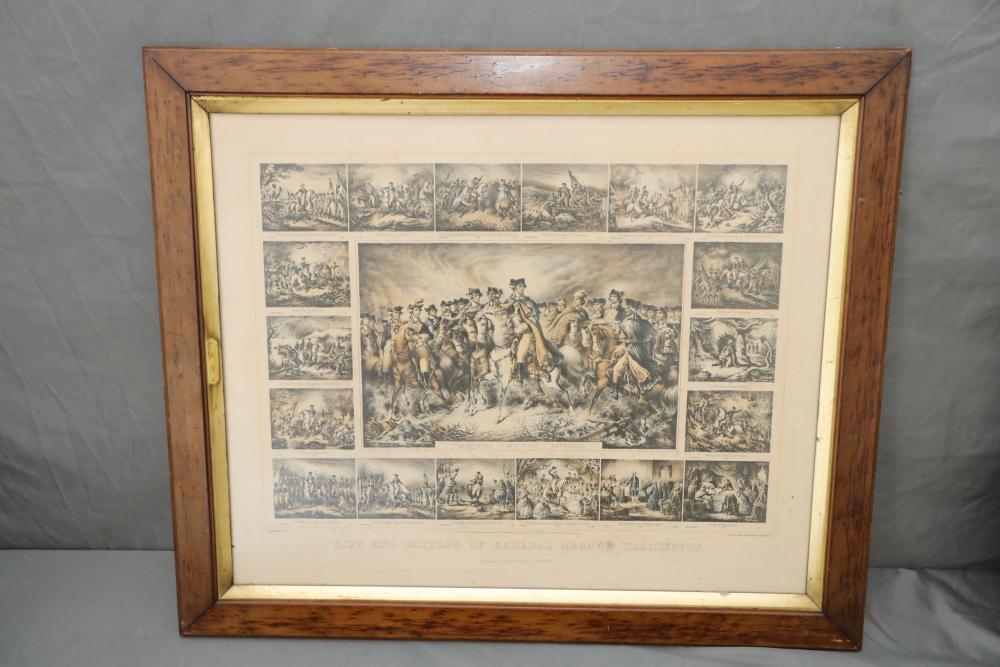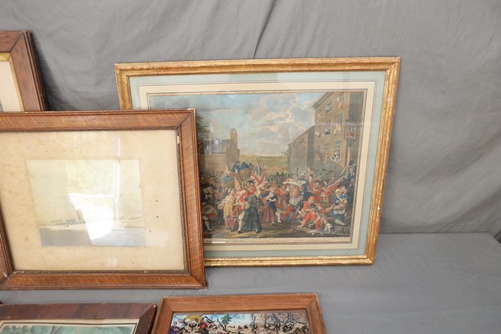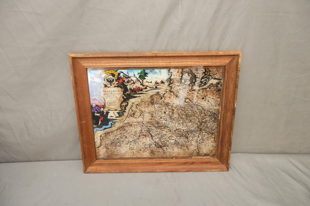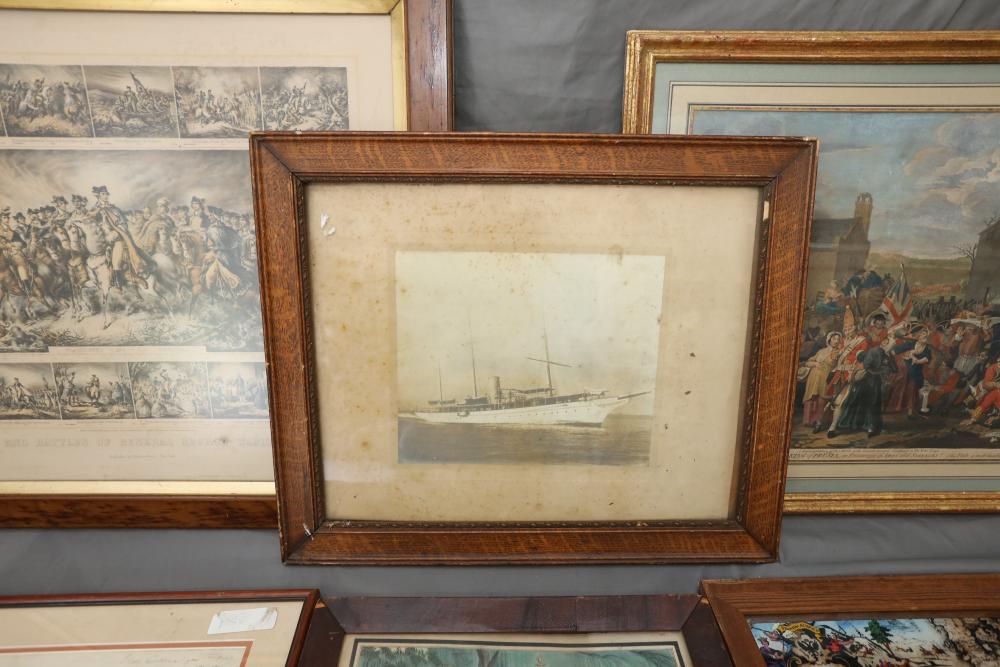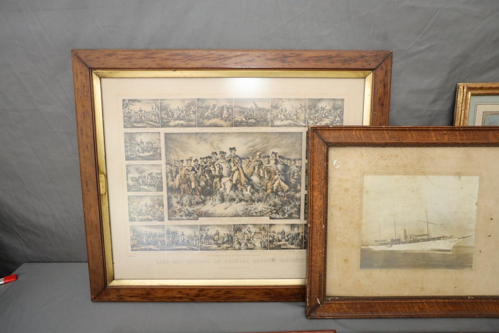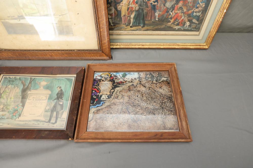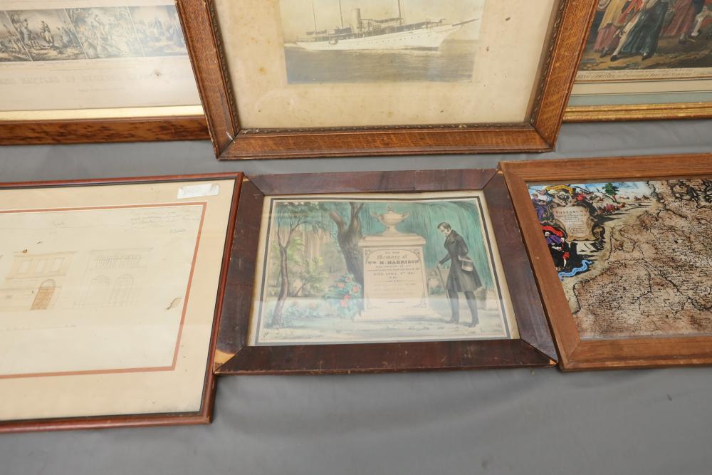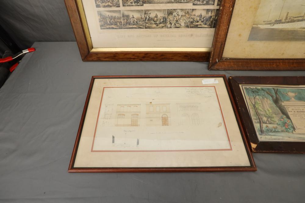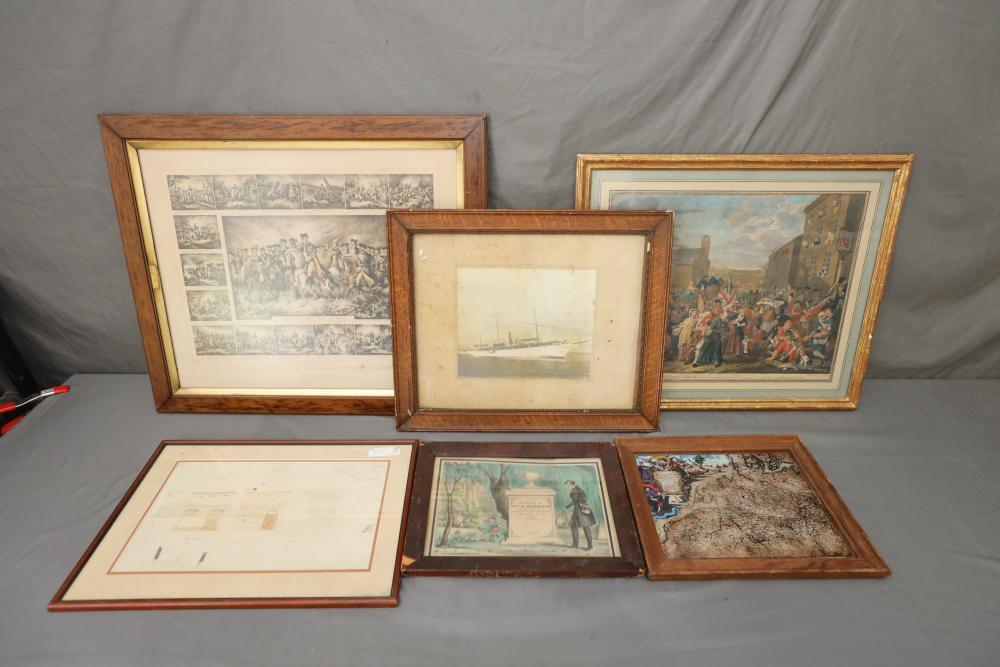 Six various historical prints framed. Including building plans, historic moments, and map. Largest one being 32"x26". Pickup only.