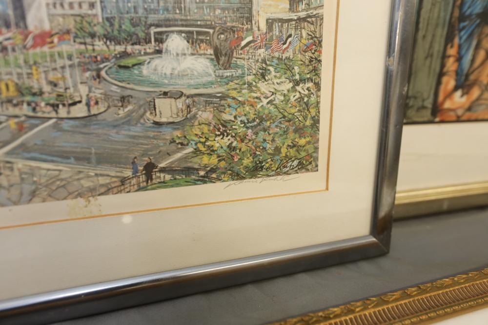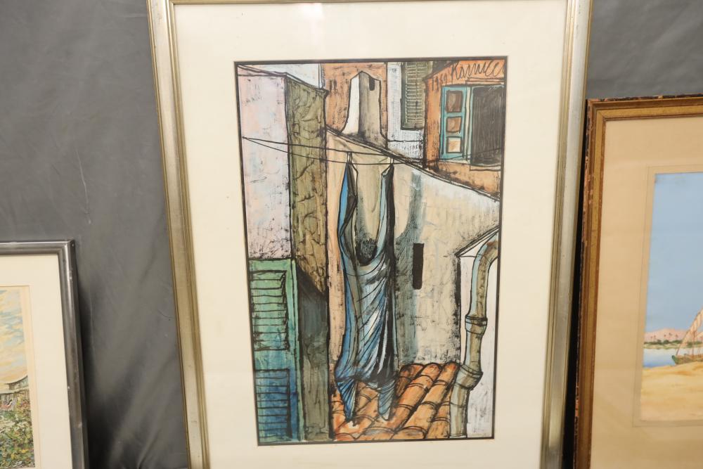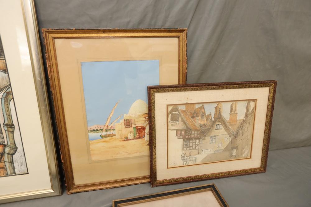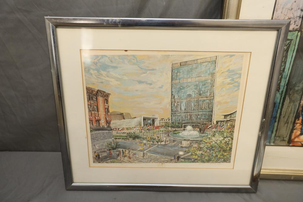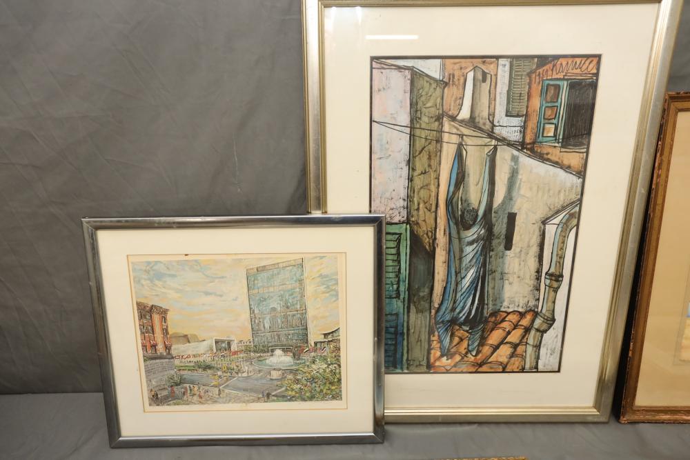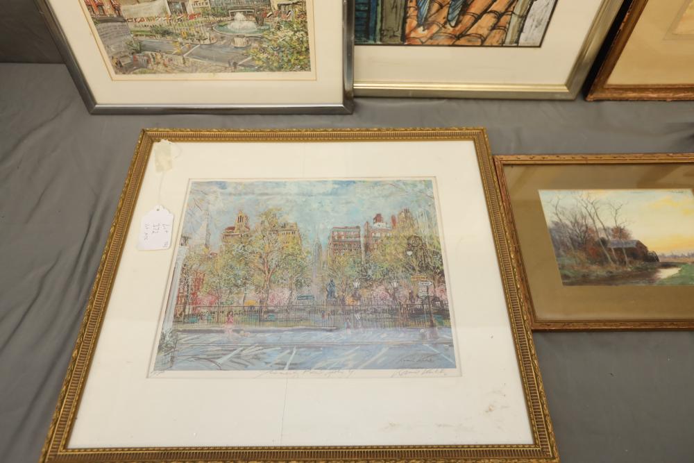Seven various works on paper framed. Including artist proof prints of cityscapes, watercolor and painting. Largest piece being 27"x20". Pickup only.