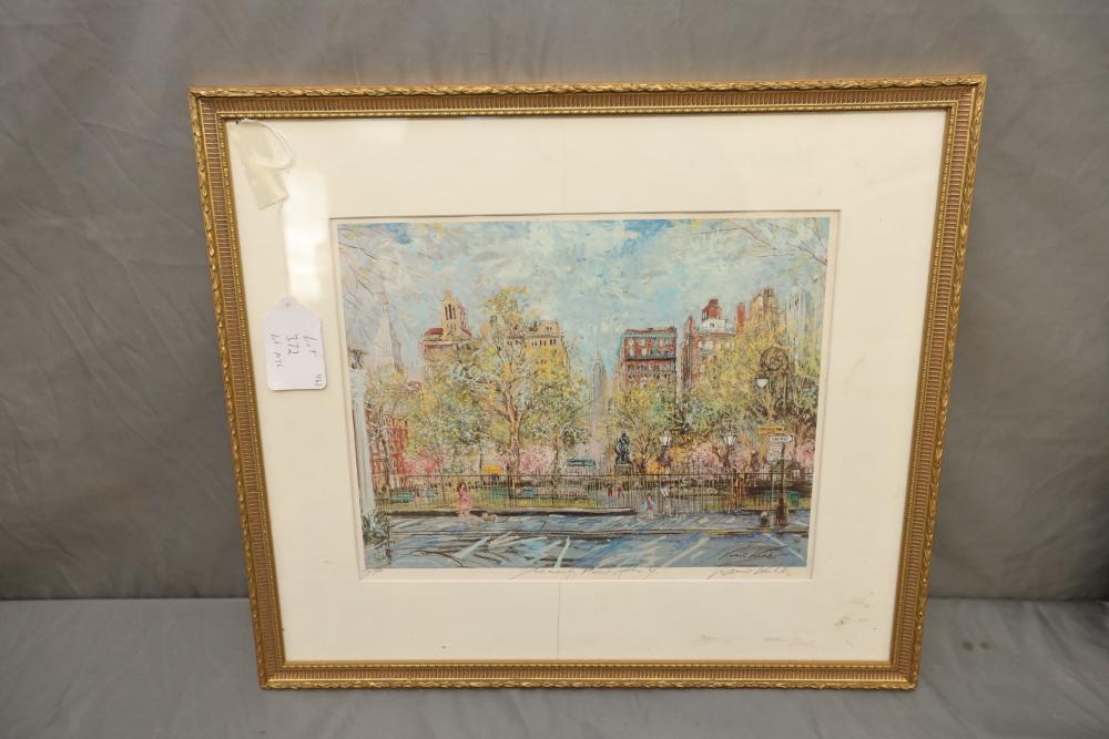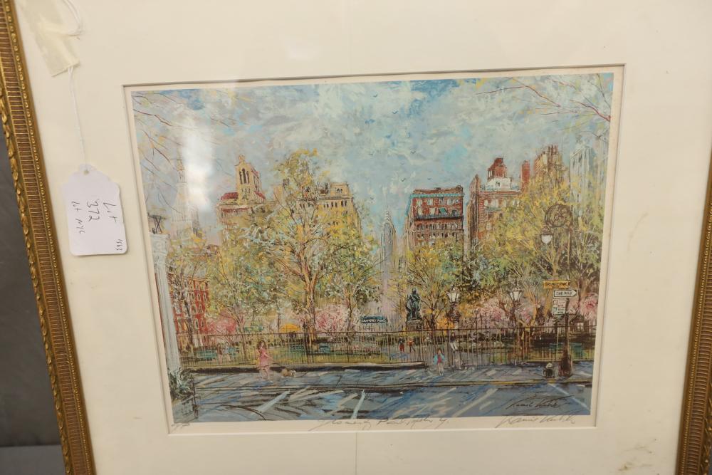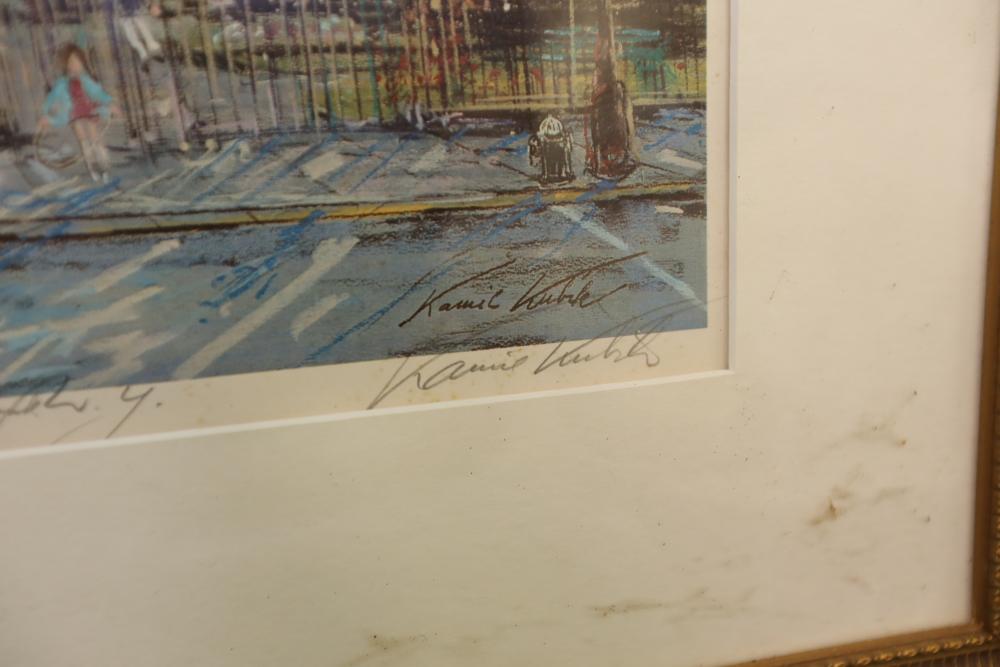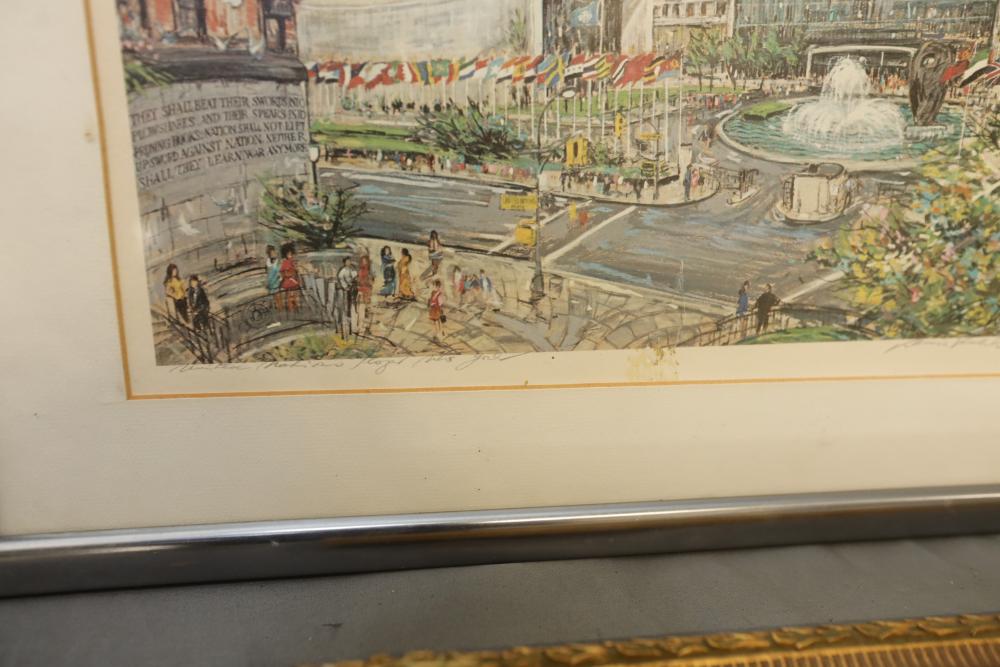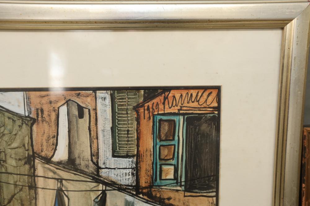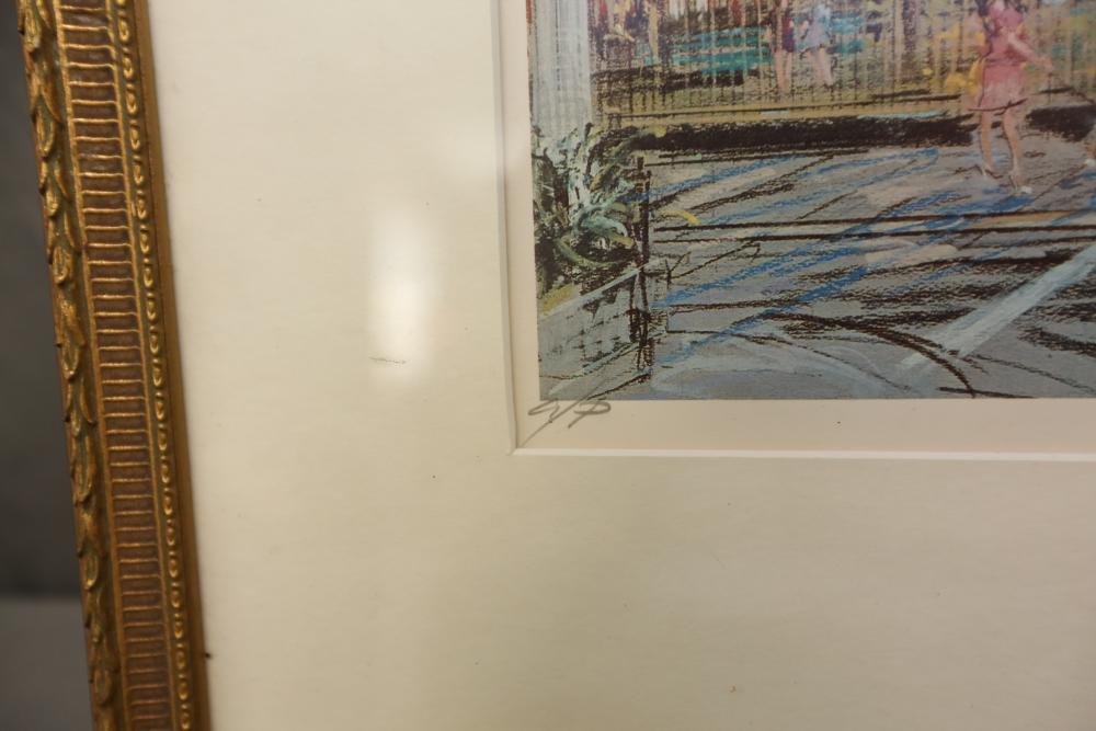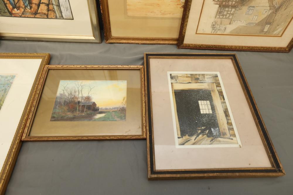 Seven various works on paper framed. Including artist proof prints of cityscapes, watercolor and painting. Largest piece being 27"x20". Pickup only.