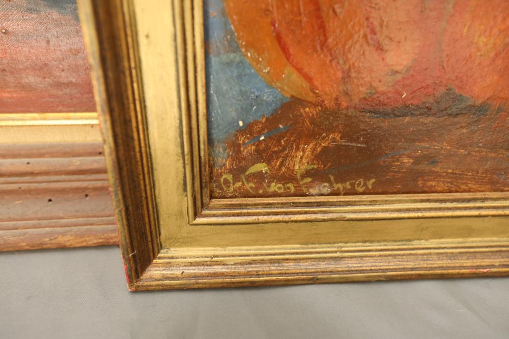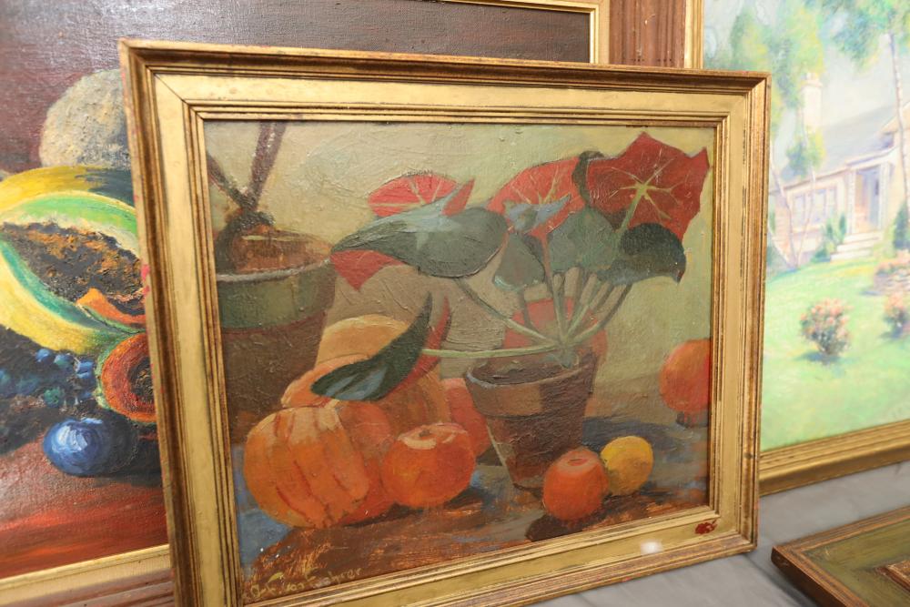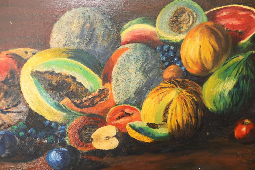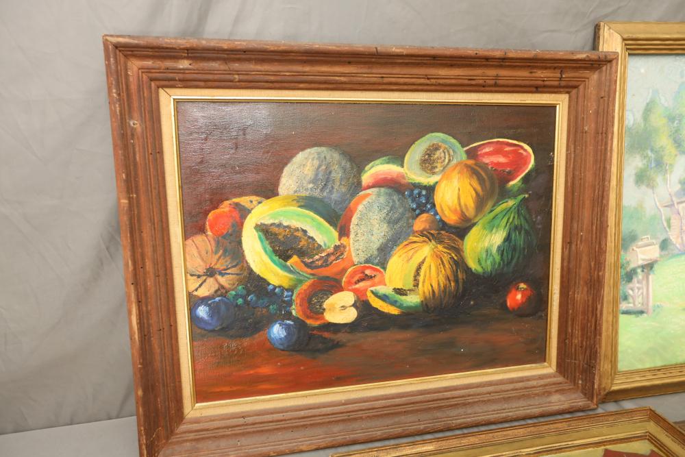 Three framed oil paintings and one framed print. Depicting fruits and floral elements. Largest being 31"x25". Pickup only.