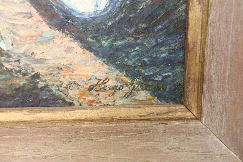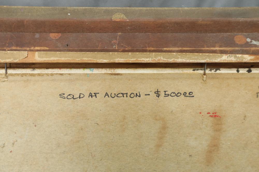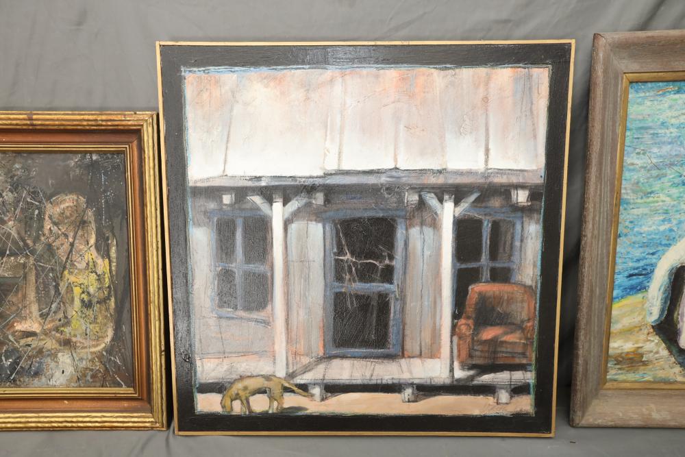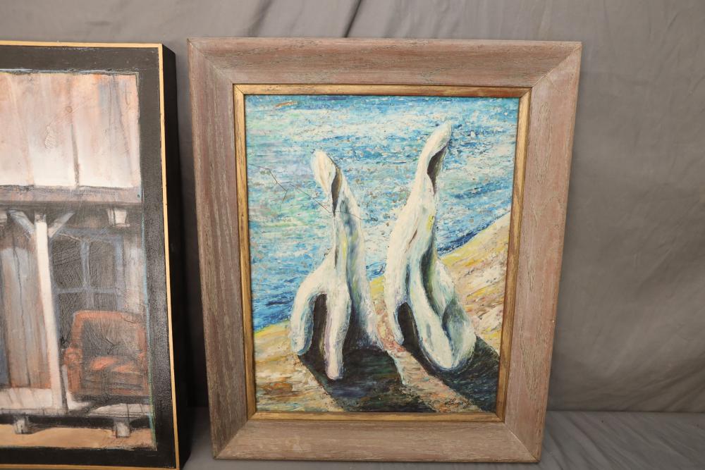 Items includes artwork: Oil on framed canvas, abstract art. Title on back "Night Cometh"; Oil on canvas, abstract art. Title on back "Far Edge". Signature on front appears to read "Syd Weinstein"; Oil on Canvas, abstract herd of horses. Signed in middle of painting. Written on back "Les Affectueux - II 1998"; Oil on canvas framed. Aquatic ship scene; Color etching and aquatint on paper. Titled "Sound of a Forest Brook" Signed lower right " Karl Schrag 86' " numbered 7/40; Print on paper framed. Signed "Amen" in lower right corner. Lower left reads "AP The City" ; Mixed Media Collage on paper. Signed lower left corner "William McGee 1989" Title "By the Sea"; Two framed Egyptian prints on Papyrus. "Nefertari and Hathor" and "Ramsess II Moving into Battle" and much more! Items are located in Pleasant Valley, NY.