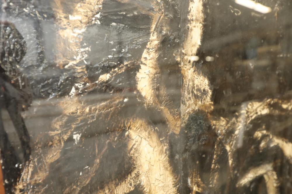 Items includes artwork: Oil on framed canvas, abstract art. Title on back "Night Cometh"; Oil on canvas, abstract art. Title on back "Far Edge". Signature on front appears to read "Syd Weinstein"; Oil on Canvas, abstract herd of horses. Signed in middle of painting. Written on back "Les Affectueux - II 1998"; Oil on canvas framed. Aquatic ship scene; Color etching and aquatint on paper. Titled "Sound of a Forest Brook" Signed lower right " Karl Schrag 86' " numbered 7/40; Print on paper framed. Signed "Amen" in lower right corner. Lower left reads "AP The City" ; Mixed Media Collage on paper. Signed lower left corner "William McGee 1989" Title "By the Sea"; Two framed Egyptian prints on Papyrus. "Nefertari and Hathor" and "Ramsess II Moving into Battle" and much more! Items are located in Pleasant Valley, NY.
