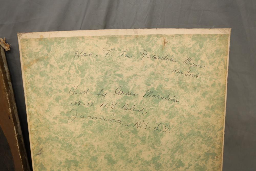 Items includes artwork: Oil on framed canvas, abstract art. Title on back "Night Cometh"; Oil on canvas, abstract art. Title on back "Far Edge". Signature on front appears to read "Syd Weinstein"; Oil on Canvas, abstract herd of horses. Signed in middle of painting. Written on back "Les Affectueux - II 1998"; Oil on canvas framed. Aquatic ship scene; Color etching and aquatint on paper. Titled "Sound of a Forest Brook" Signed lower right " Karl Schrag 86' " numbered 7/40; Print on paper framed. Signed "Amen" in lower right corner. Lower left reads "AP The City" ; Mixed Media Collage on paper. Signed lower left corner "William McGee 1989" Title "By the Sea"; Two framed Egyptian prints on Papyrus. "Nefertari and Hathor" and "Ramsess II Moving into Battle" and much more! Items are located in Pleasant Valley, NY.