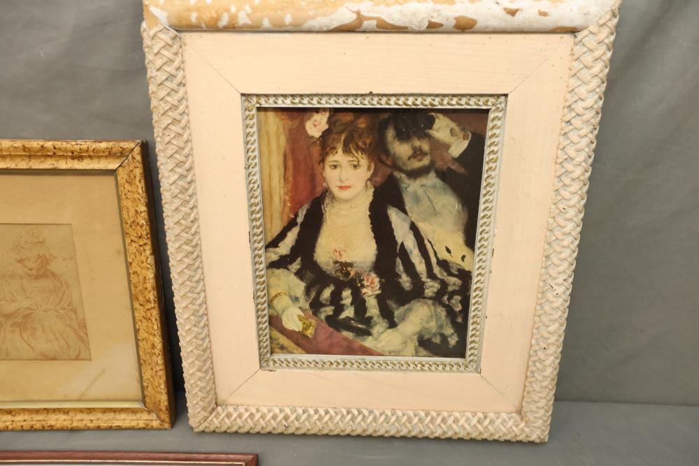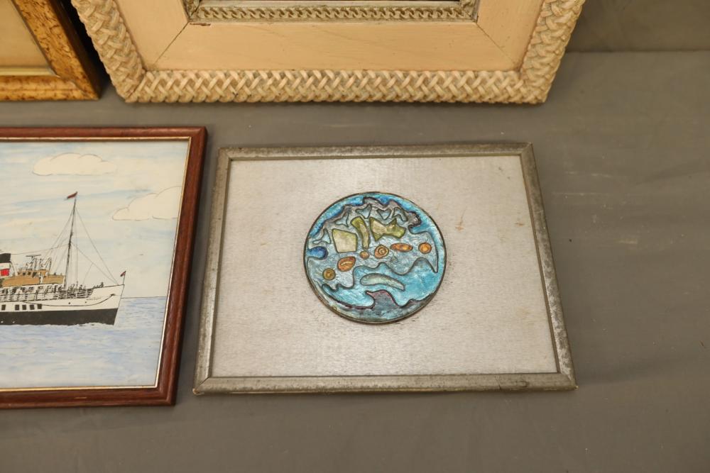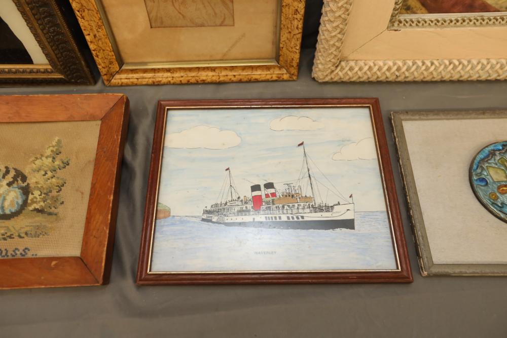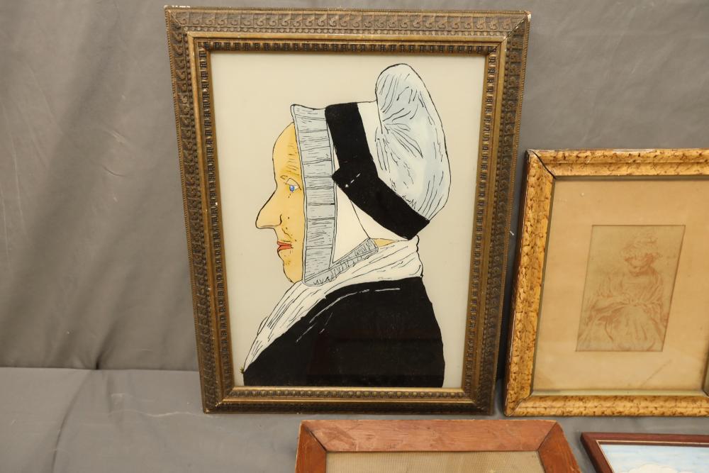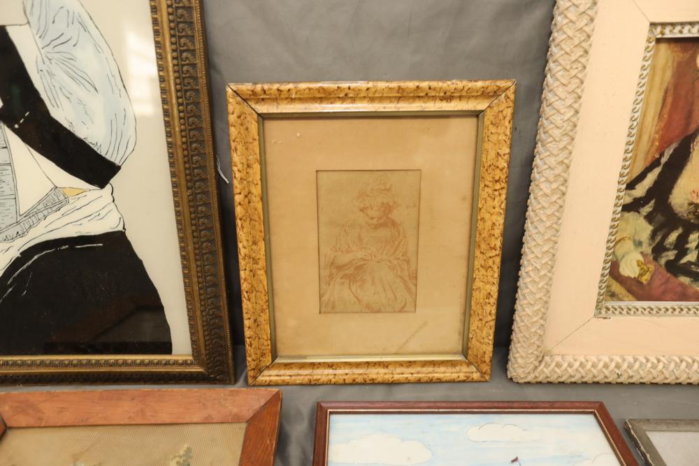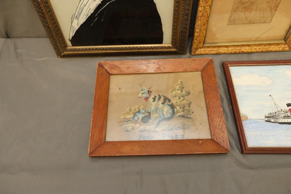 Six various small pieces of framed art. Including a crewelwork, drawing, and mixed media. Pickup Only.