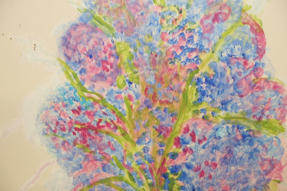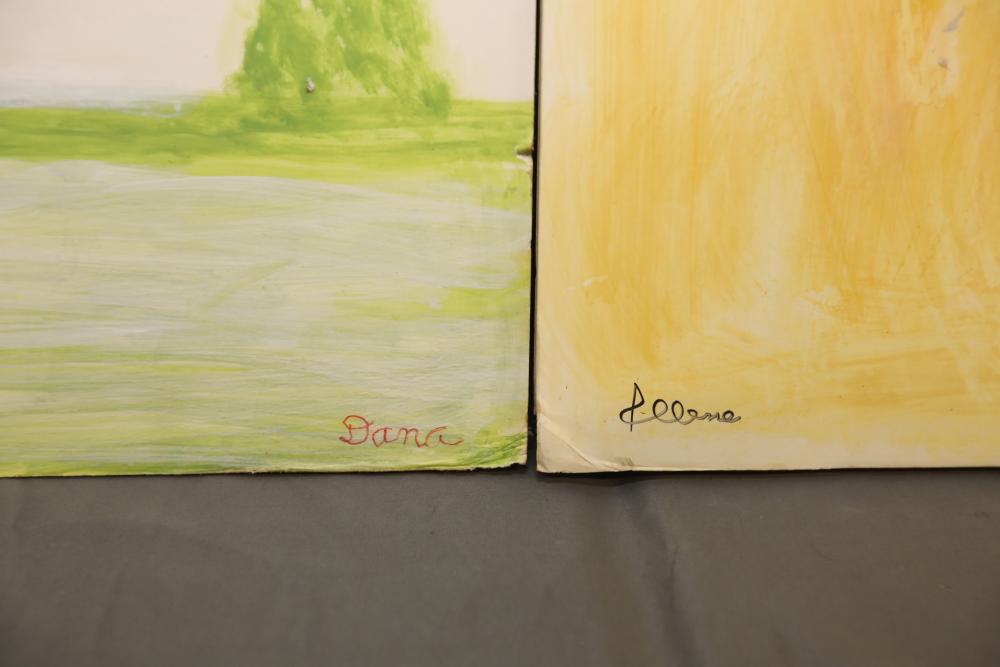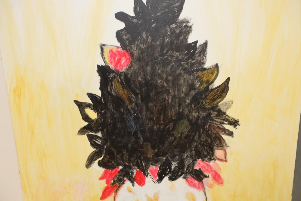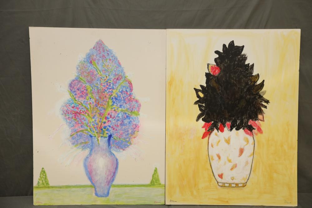 Two Floral Paintings on paper mounted on foam boards. Signed along the bottom of the paintings. 38"x30". Pickup only.
