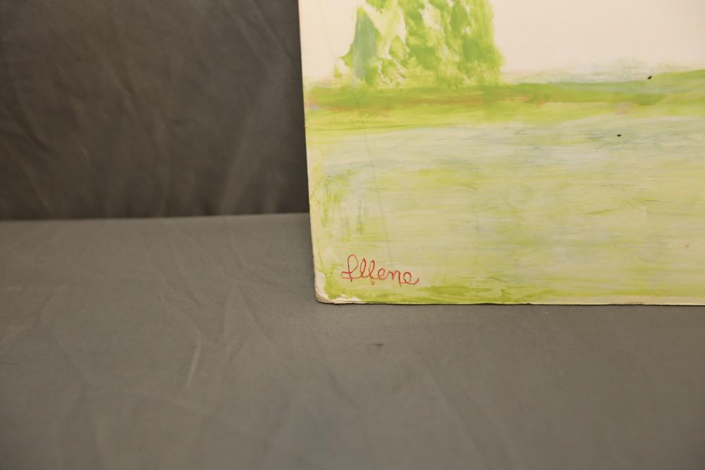 Items includes artwork: Oil on framed canvas, abstract art. Title on back "Night Cometh"; Oil on canvas, abstract art. Title on back "Far Edge". Signature on front appears to read "Syd Weinstein"; Oil on Canvas, abstract herd of horses. Signed in middle of painting. Written on back "Les Affectueux - II 1998"; Oil on canvas framed. Aquatic ship scene; Color etching and aquatint on paper. Titled "Sound of a Forest Brook" Signed lower right " Karl Schrag 86' " numbered 7/40; Print on paper framed. Signed "Amen" in lower right corner. Lower left reads "AP The City" ; Mixed Media Collage on paper. Signed lower left corner "William McGee 1989" Title "By the Sea"; Two framed Egyptian prints on Papyrus. "Nefertari and Hathor" and "Ramsess II Moving into Battle" and much more! Items are located in Pleasant Valley, NY.