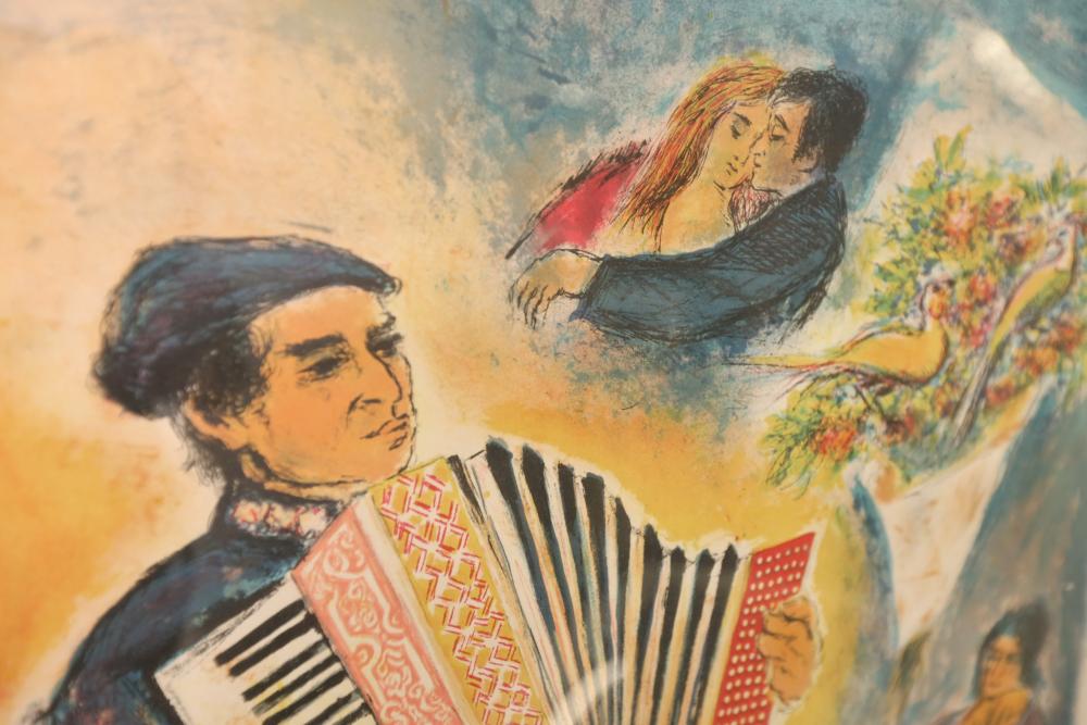 Three various pieces of art on paper framed .Including a print of festive scene and abstract paintings on paper. Pickup only.