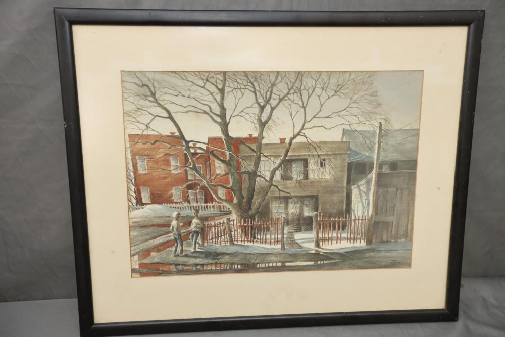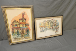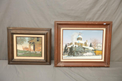 Two Watercolor Prints on paper. Barn with market sign and Winter Town with picket fence. Signed in lower right. 28"x22 1/2 29"x22". Pickup only.