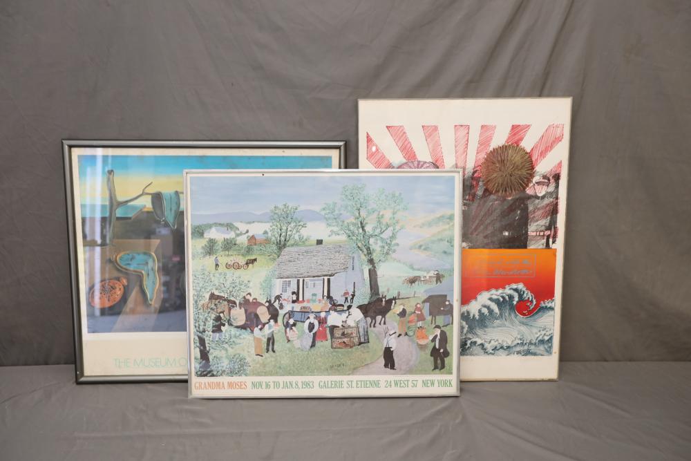Three framed posters incl; Rising sun with soldier, Salvador Dhali melting clocks, depiction of classical greenscape. Pickup only.
