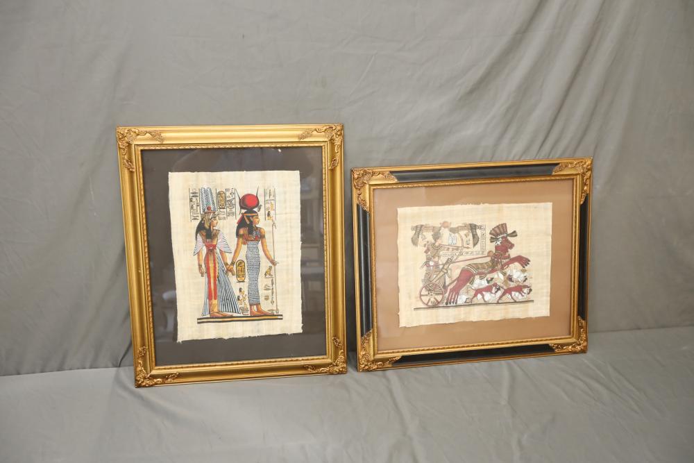 Two framed Egyptian prints on Papyrus. "Nefertari and Hathor" and "Ramsess II Moving into Battle". Pickup only.