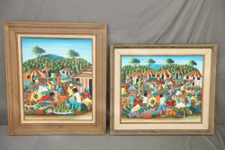 Two Oil paintings on canvas of vibrant market scene, contemporary styled. Signature appears to read "Gaston Paul" in lower middle of piece. Pickup Only.