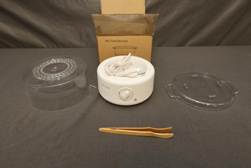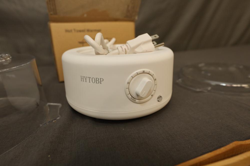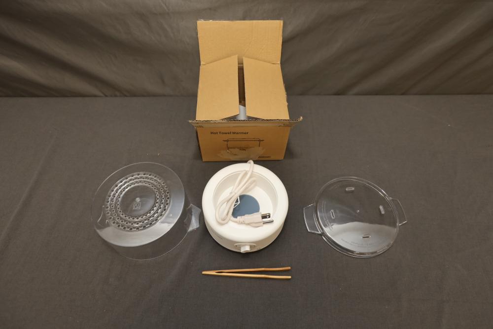 HYTOBP Hot towel warmer/steamer with tongs, Mo.# ZG-001WH. Appearing to be new in box. Pickup only.