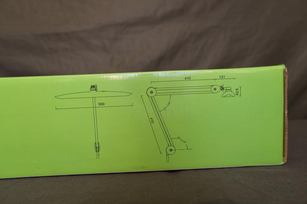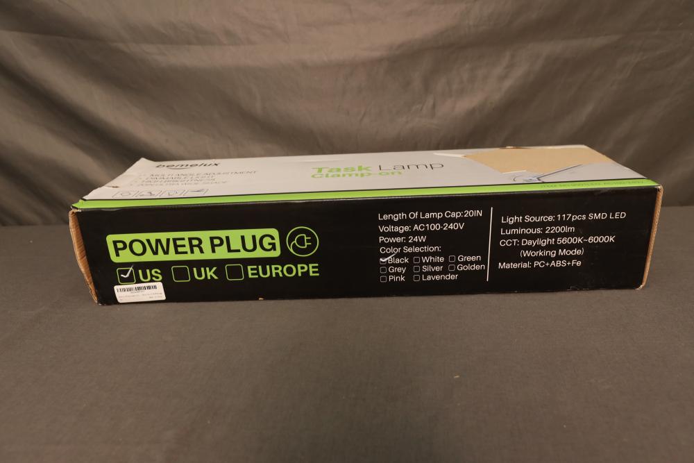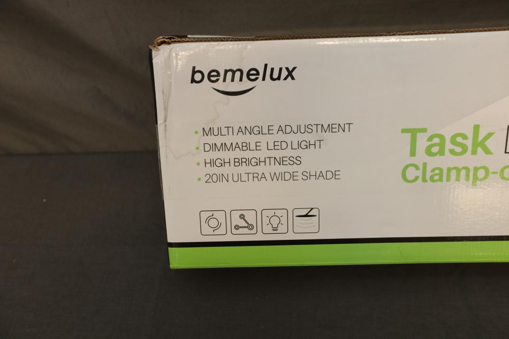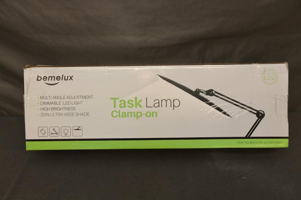 Bemelux clamp-on dimmable task lamp with multi-angle adjustment and 20in ultra wide shade 2200LM IN# 9501LED. Appearing to be new in box. Pickup only.