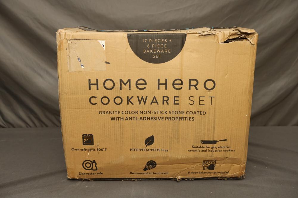 Home Hero Cookware 23pc with granite color and non-stick stone coating. Appearing to be new in box. Pickup only.
