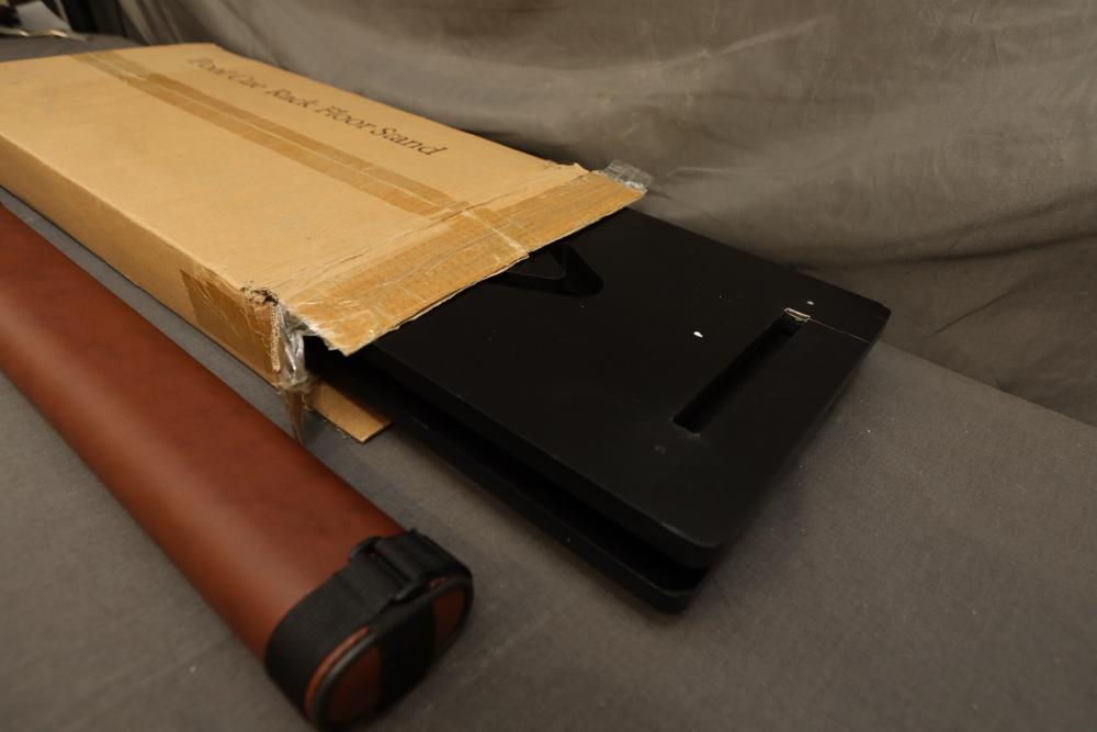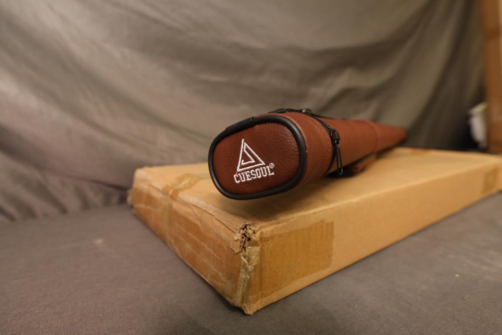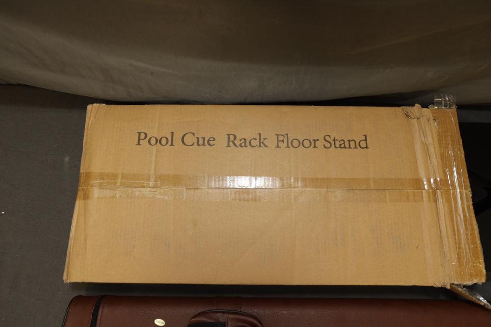 Cuesoul bag with black floor standing pool cue rack, holds 9 cues. Appearing to be new in box. Pickup only.