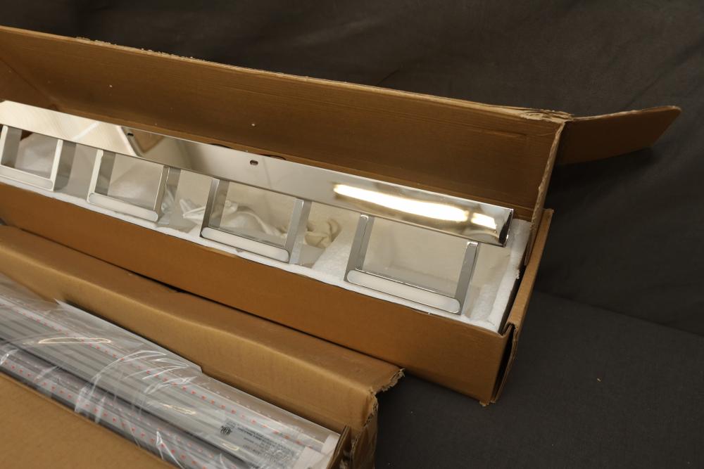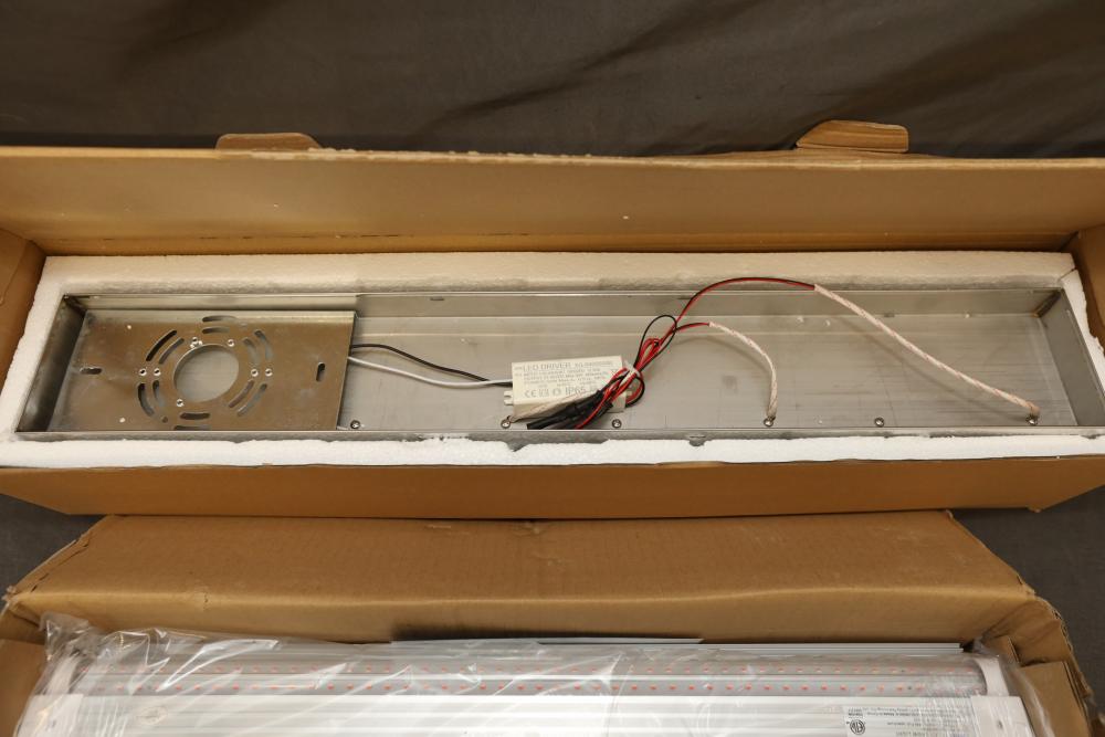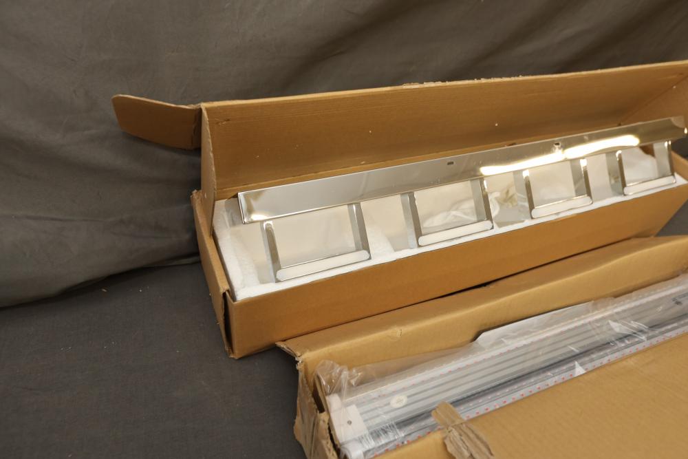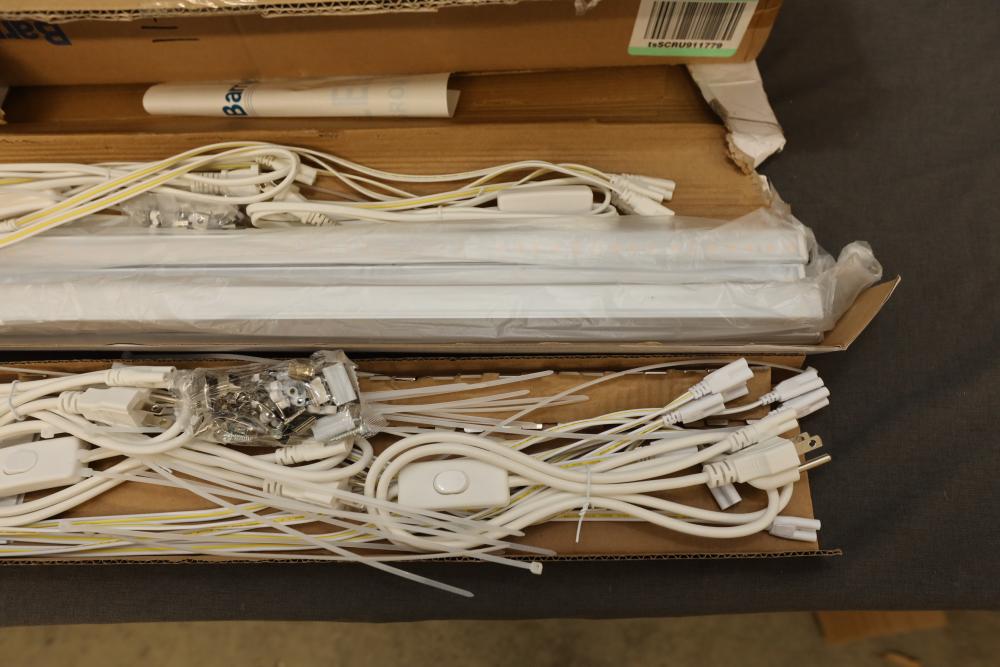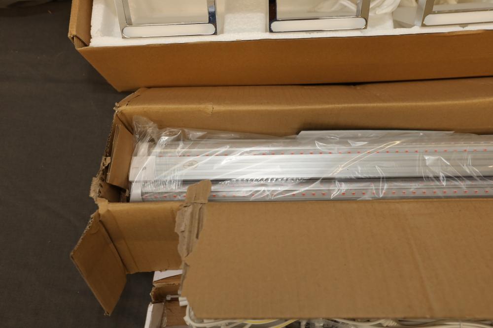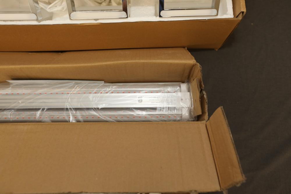 Three boxes containing; Barrina T5 grow lights Mo.# INWT504005650Fc, Barrina T8 LED grow lights Mo.# INWT80240665Hc, Tipace modern theme 4-light LED over-mirror fixture. Appearing to be new in box.