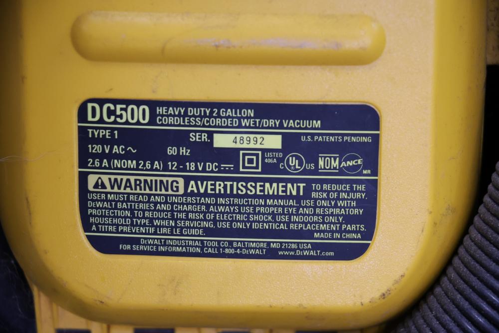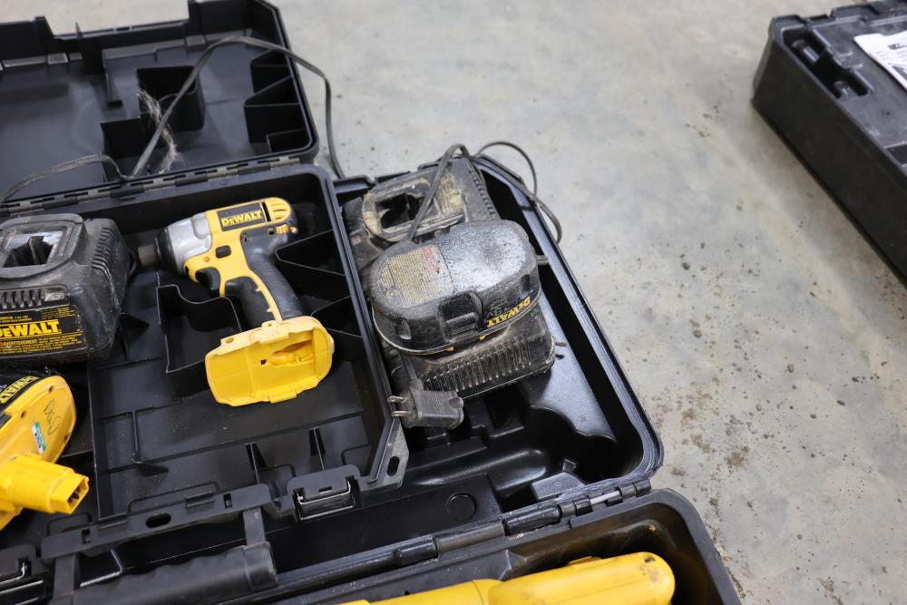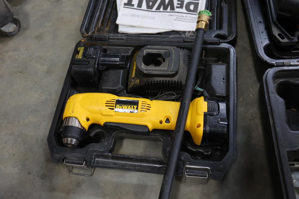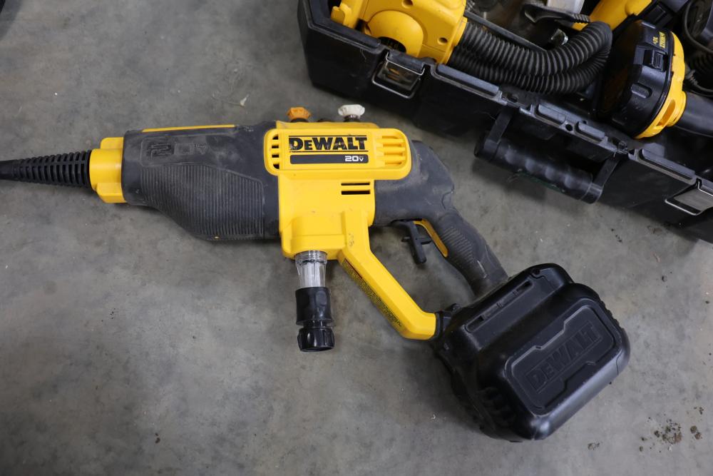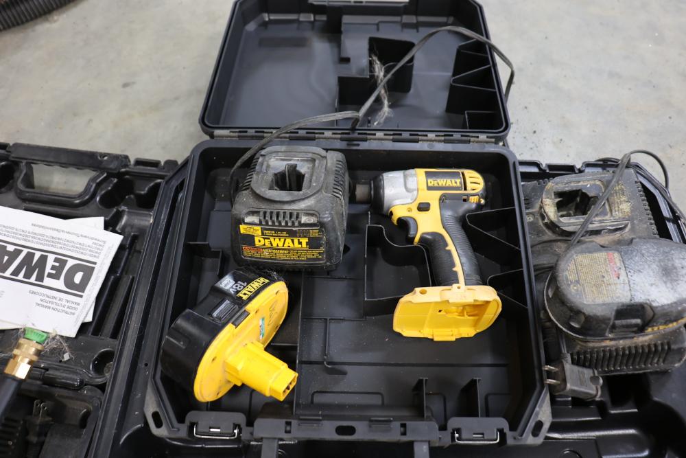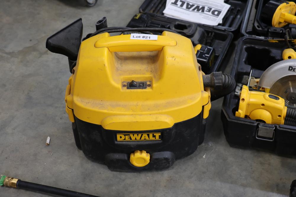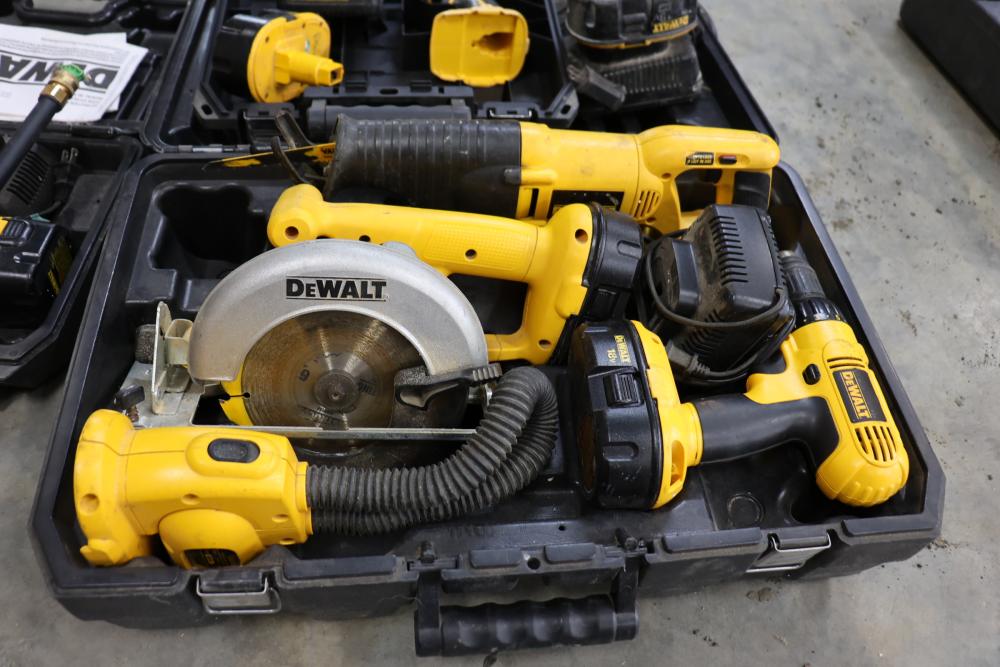 DeWalt power tools set including Heavy Duty 2 gallon vacuum model DC500, 20V cordless pressure washer model DCPW550, cordless right angle drill, 18V cordless circular saw model DW939, 18V cordless light model DW919, 18V cordless reciprocating saw, 18V 1/2" VSR cordless drill driver, 18V cordless impact driver model DC825, etc. Boxes included.