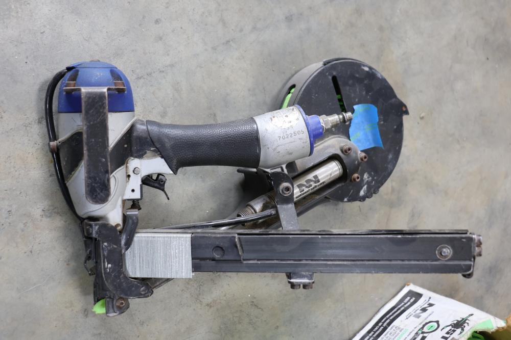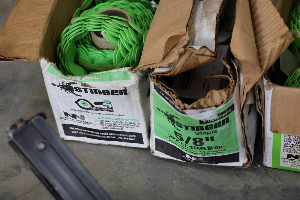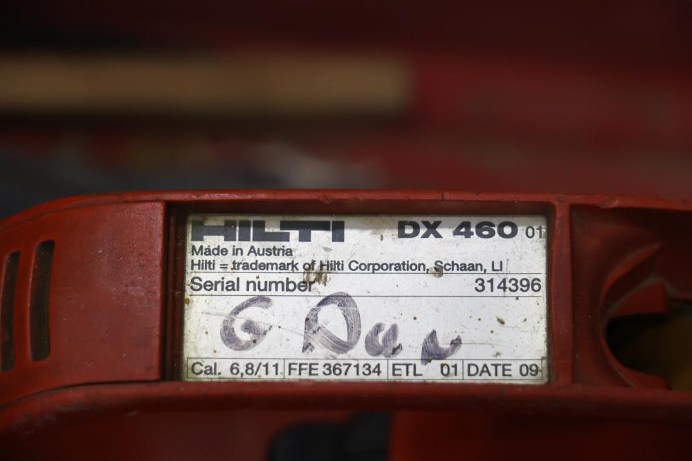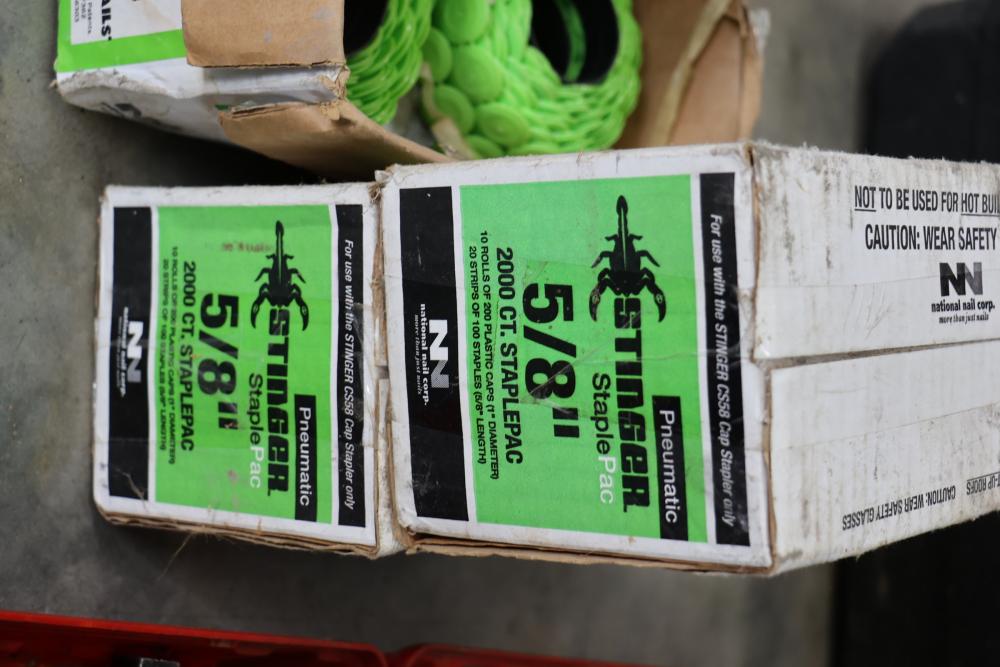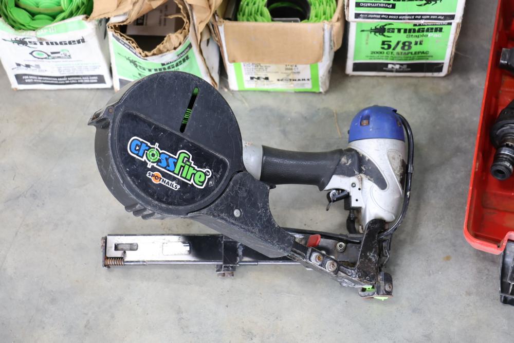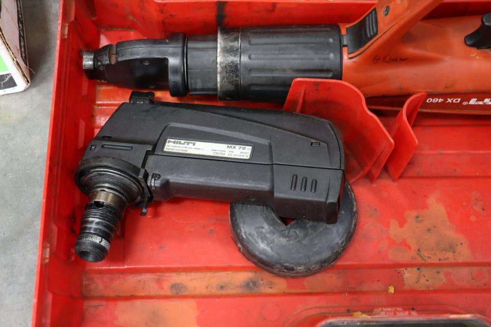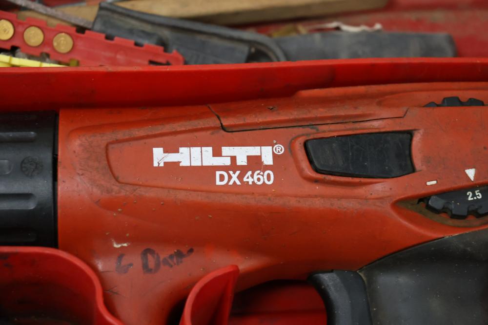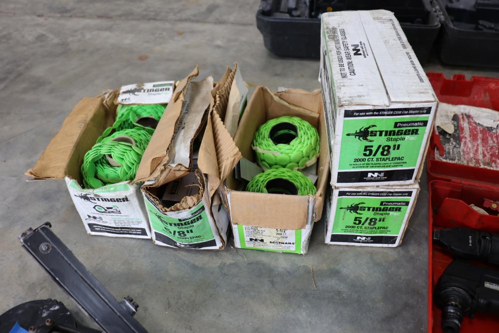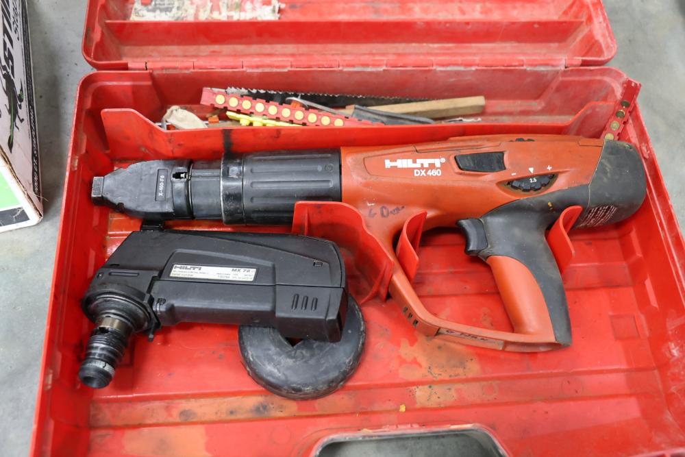 Hilti DX460 fully automatic powder-actuated fastening nail gun and National nail Corp pneumatic stapler model TCS6832 with crossfire Spotnails an boxes of pneumatic stinger staple pacs, also includes Hilti model MX 72 01 magazine.