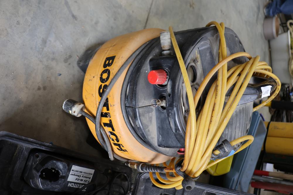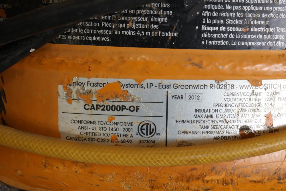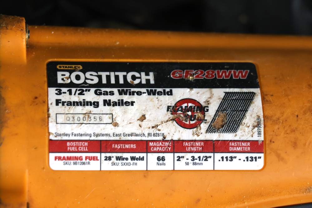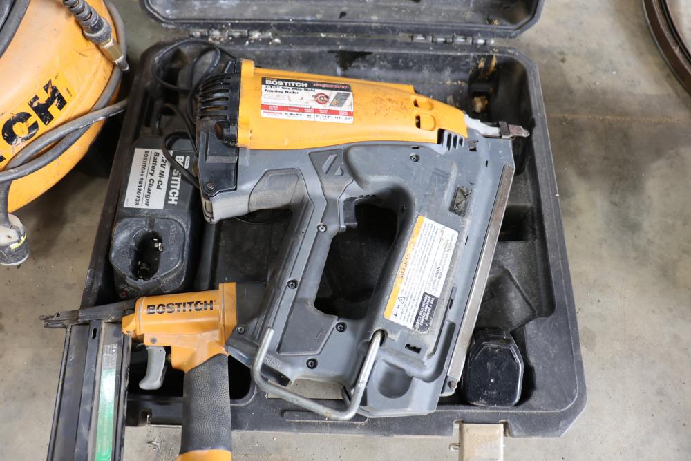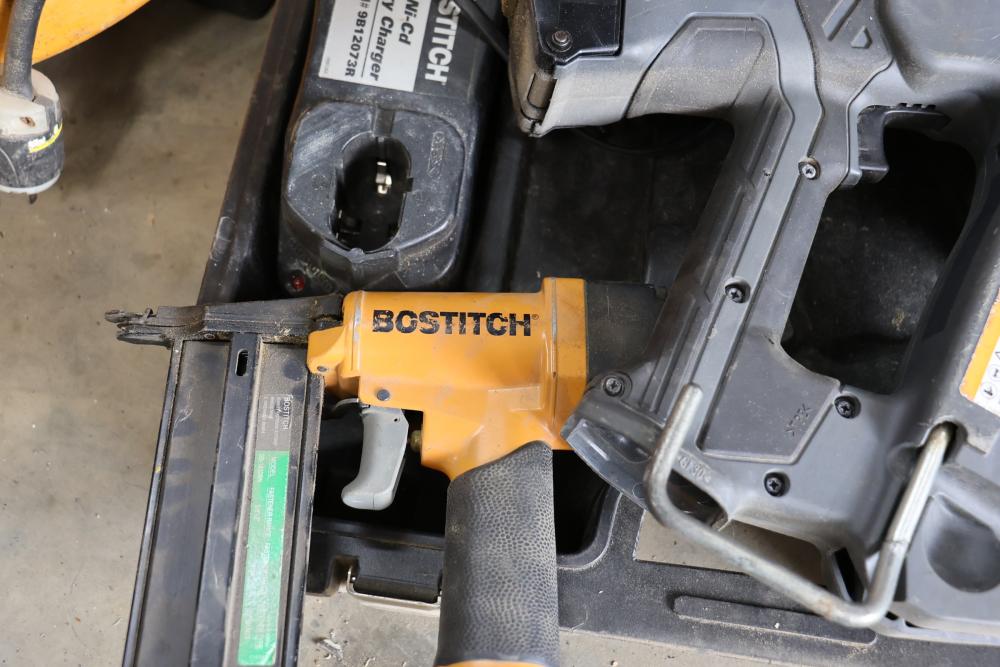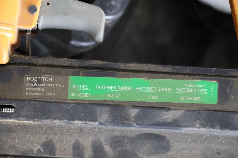 Bostitch nailers including model GF29WW 3-1/2" gas wire-weld framing nailer, model SB-1850BN 18ga BT Brad nailer, also includes Bostitch CAP2000P-OF portable air compressor.