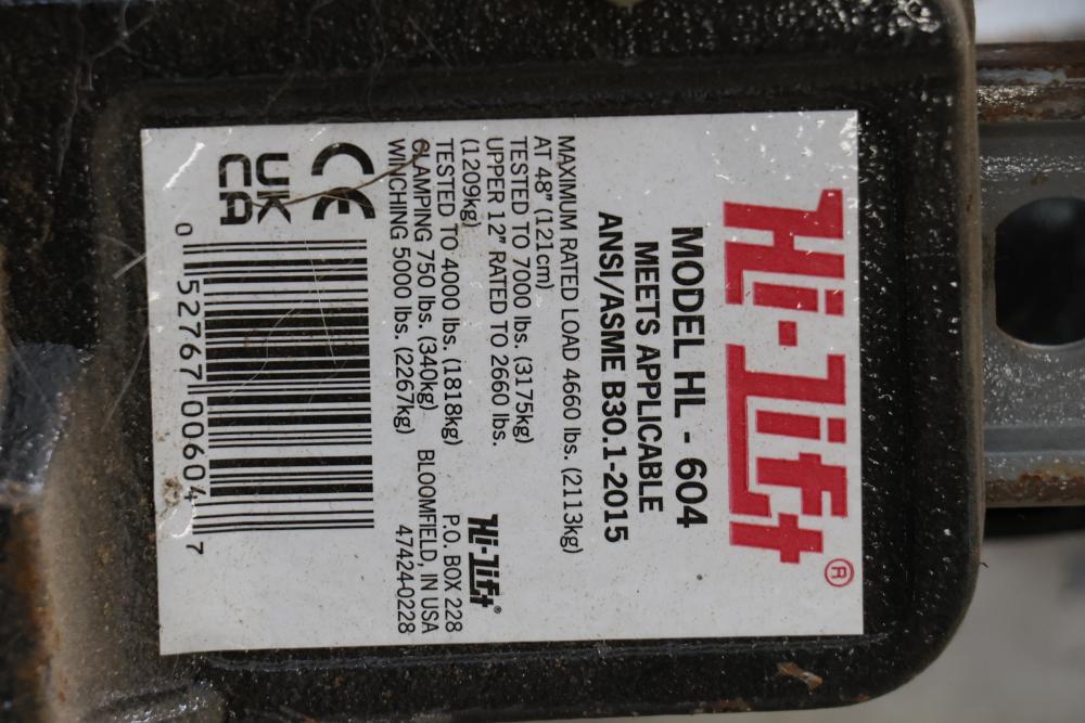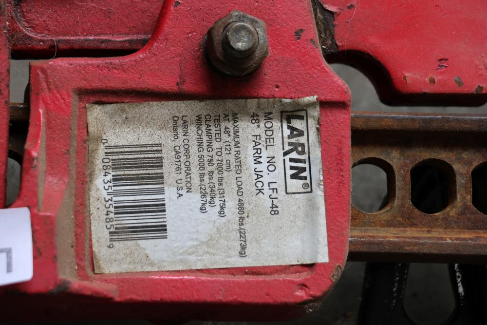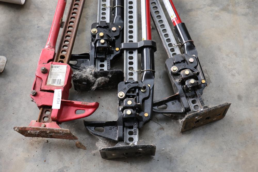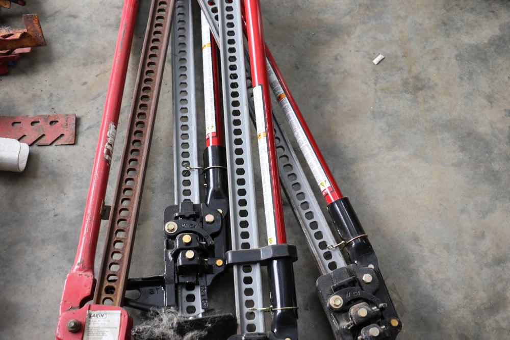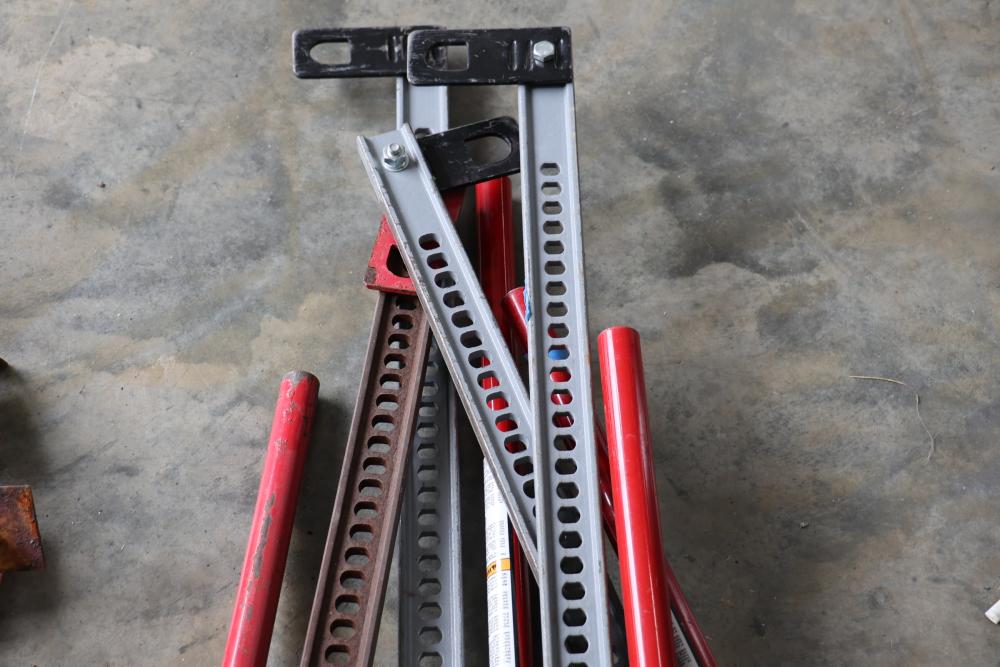 Four farm jacks including one Laric model LFJ-48 48" jack, and three Hi-Lift model HL-604, two aluminum ladder jacks, and steel ladder jacks.