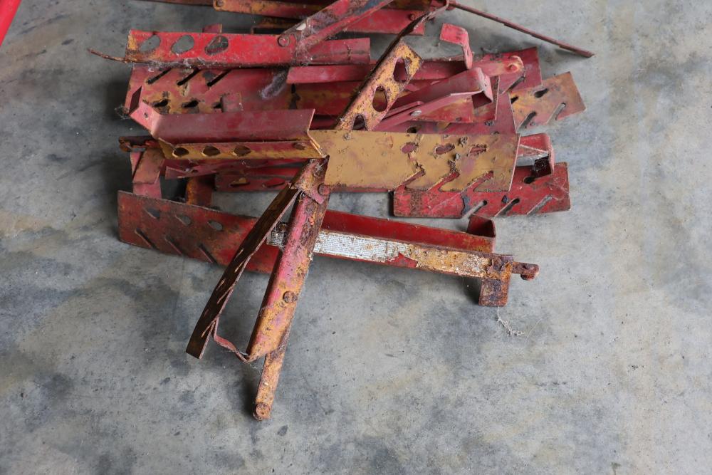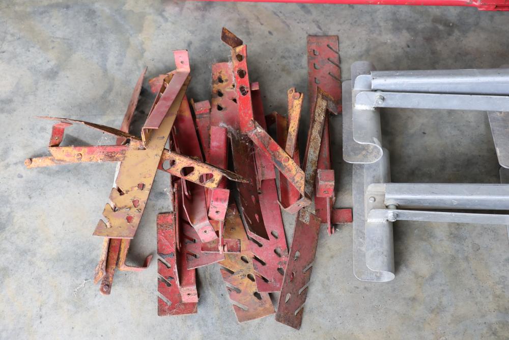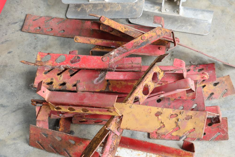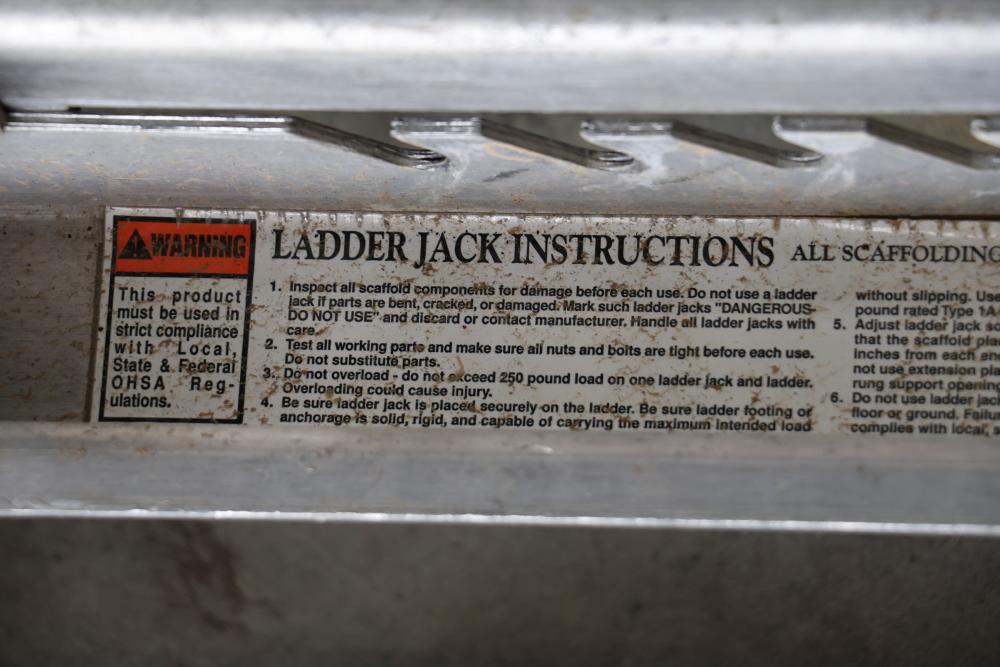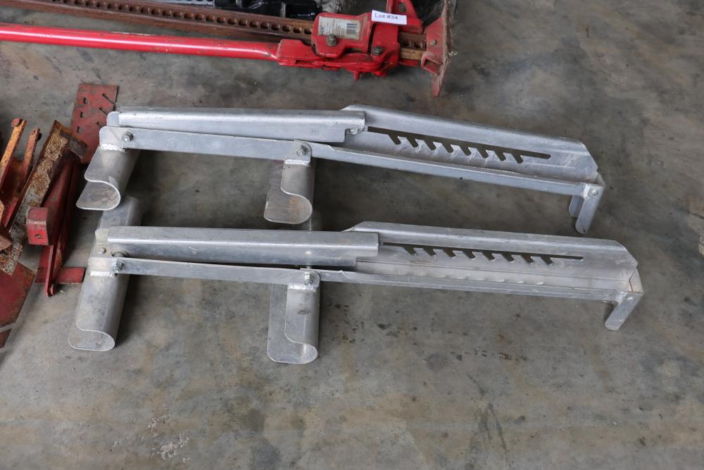 Four farm jacks including one Laric model LFJ-48 48" jack, and three Hi-Lift model HL-604, two aluminum ladder jacks, and steel ladder jacks.