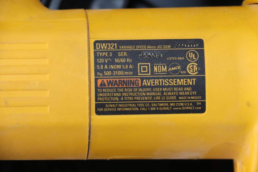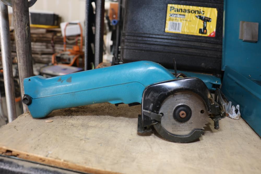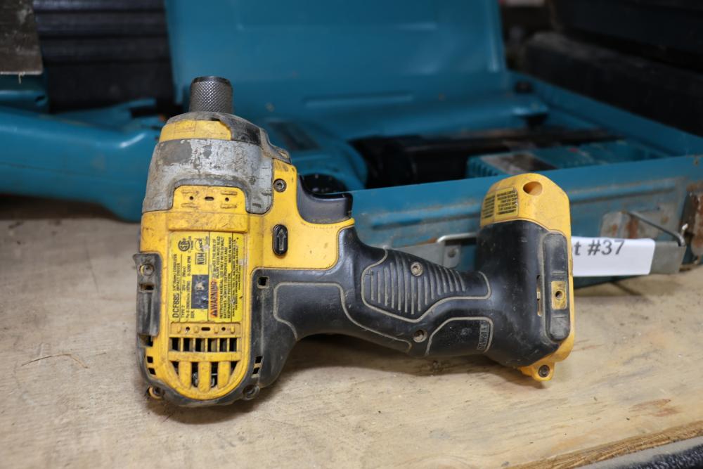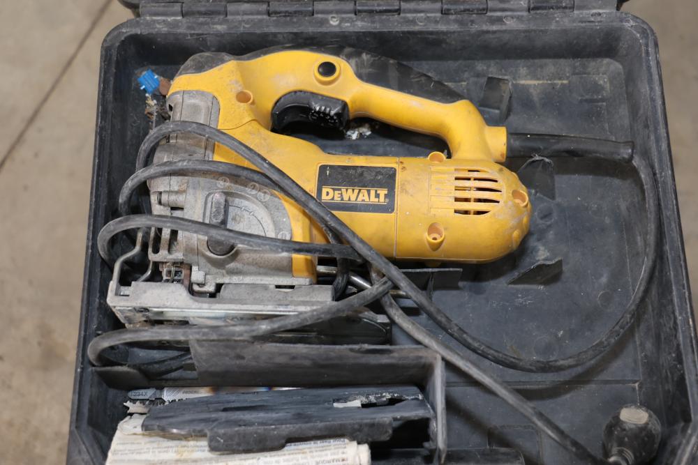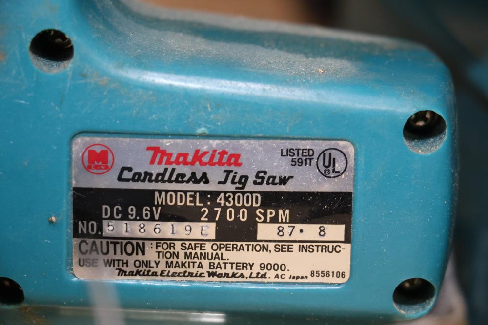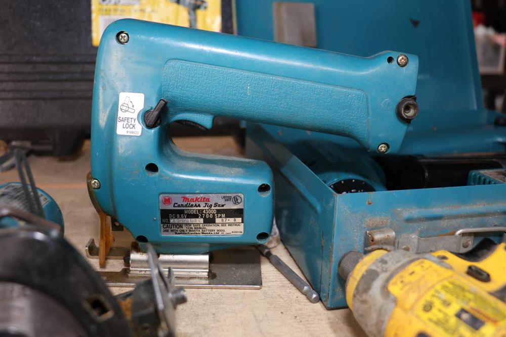 Power tools including DeWalt DCF885 1/4" 20V cordless impact driver, Makita 6093D 9.6V cordless driver drill, Makita 5090D 9.6V cordless circular saw, Makita 4300D 9.6V cordless jig saw, Panasonic EY6100 12V cordless drill and driver set, DeWalt DW321 variable speed 60mm jig saw, and a DeWalt DW331 variable speed orbital jig saw.