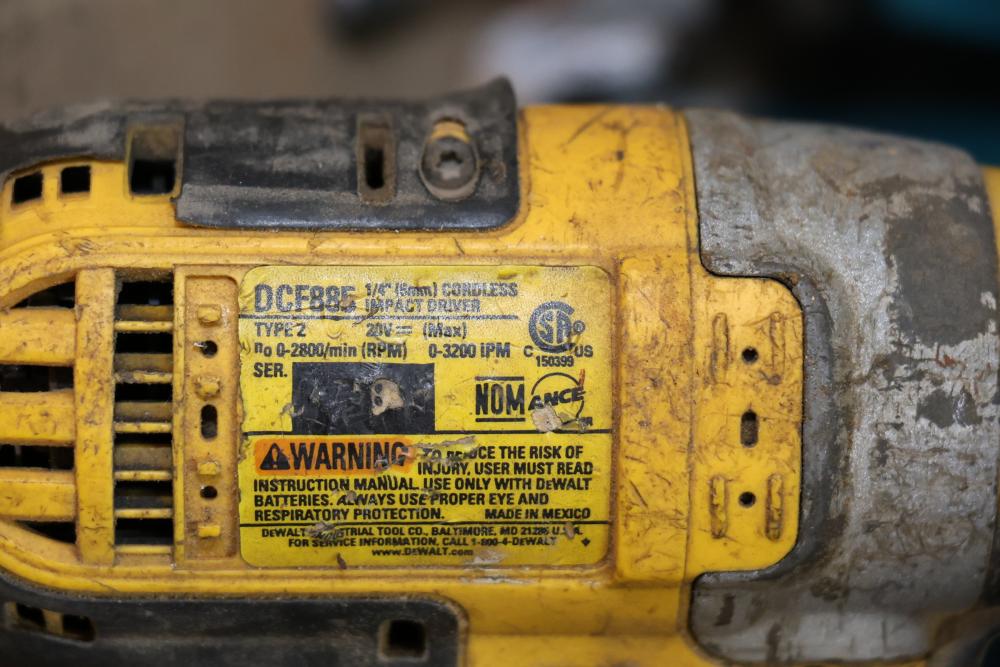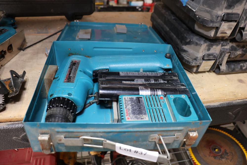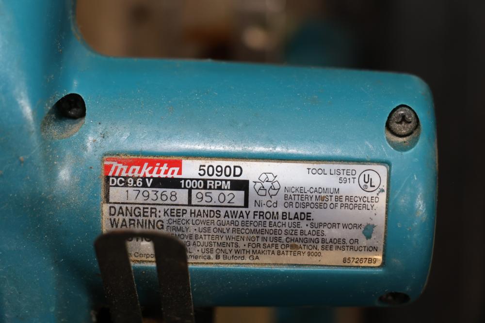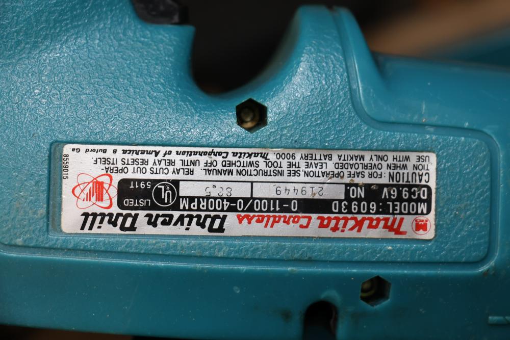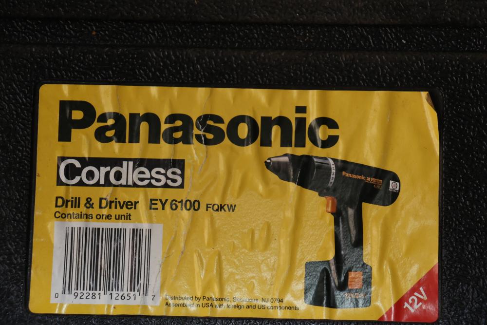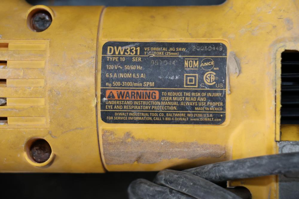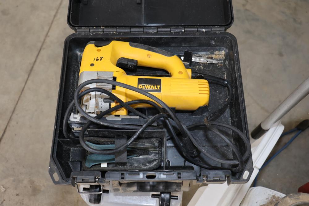 Power tools including DeWalt DCF885 1/4" 20V cordless impact driver, Makita 6093D 9.6V cordless driver drill, Makita 5090D 9.6V cordless circular saw, Makita 4300D 9.6V cordless jig saw, Panasonic EY6100 12V cordless drill and driver set, DeWalt DW321 variable speed 60mm jig saw, and a DeWalt DW331 variable speed orbital jig saw.