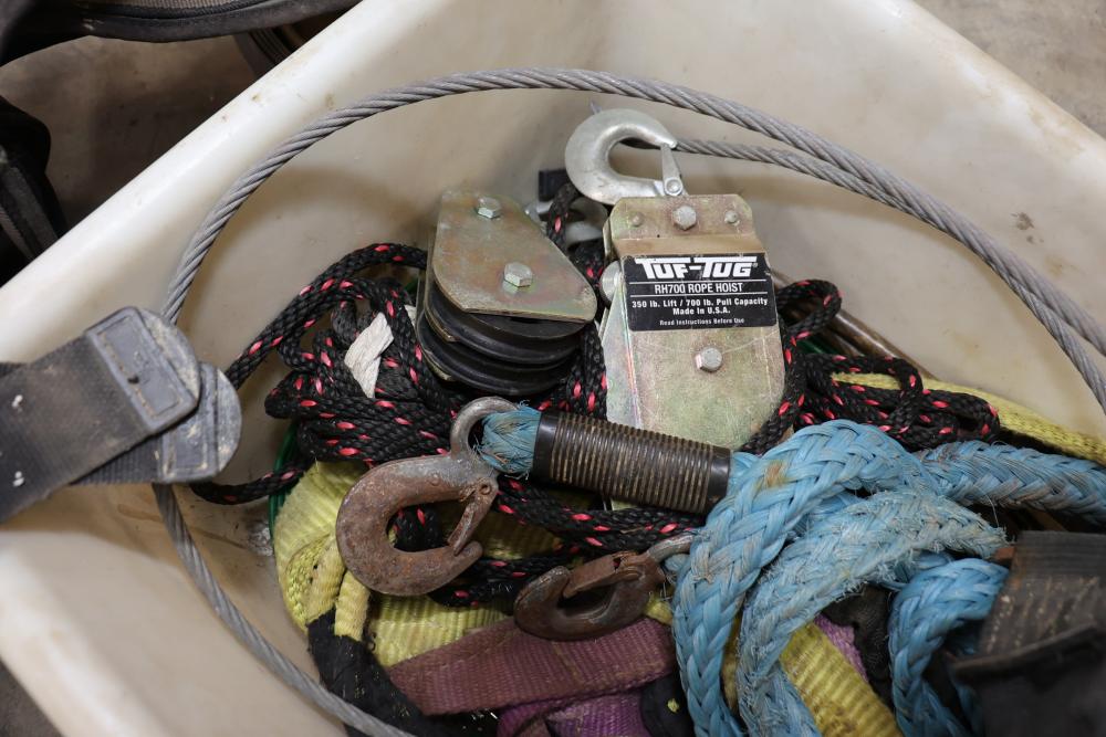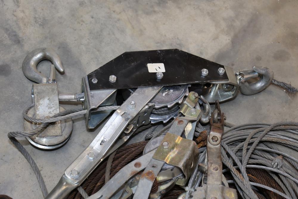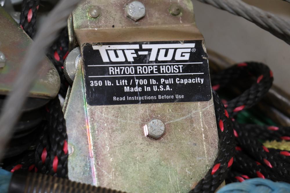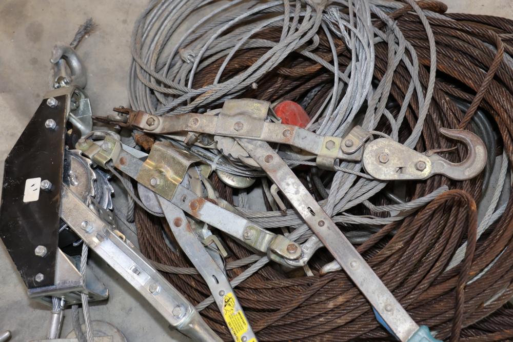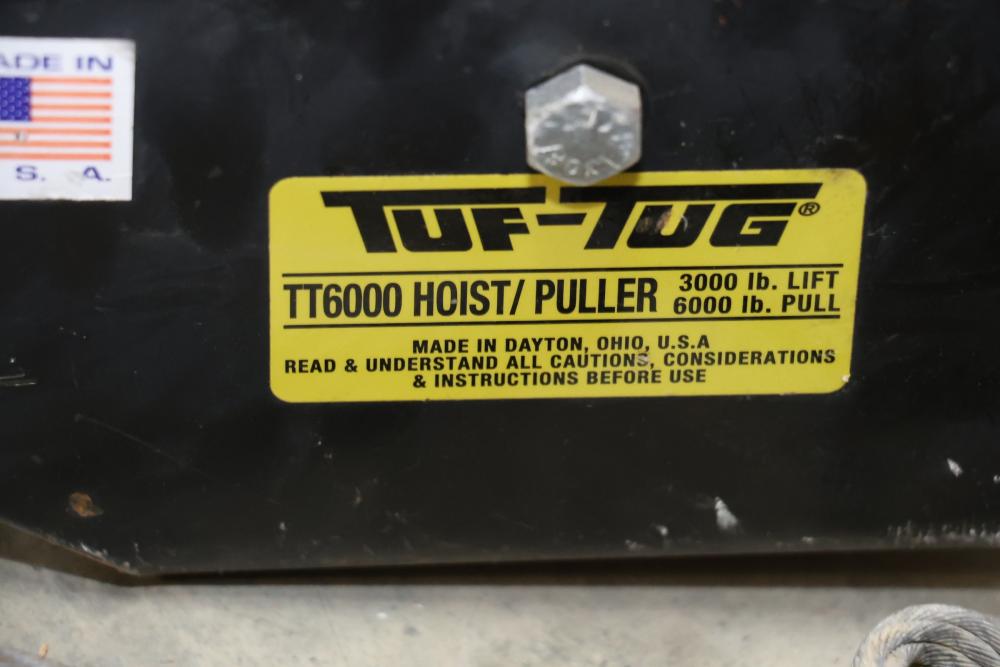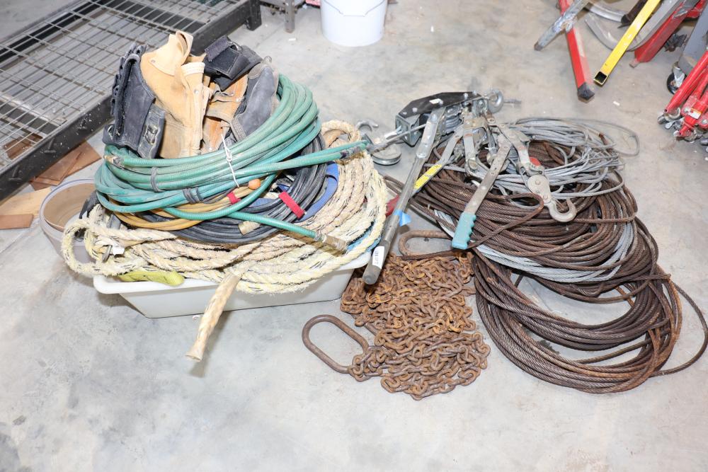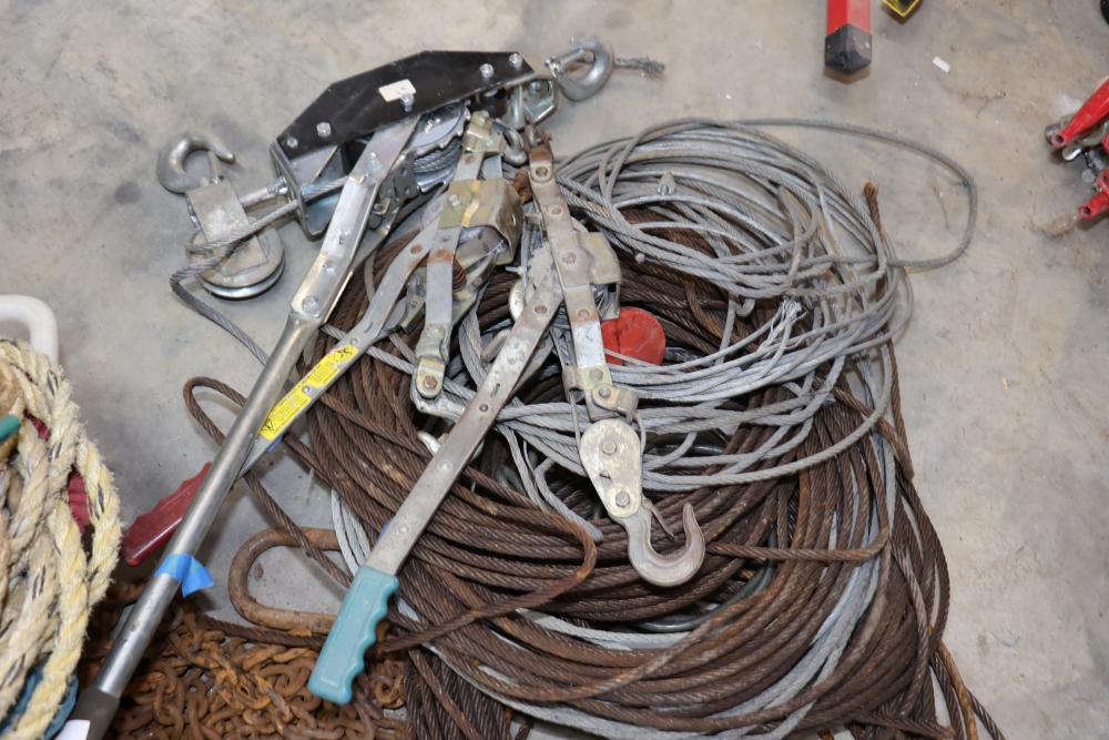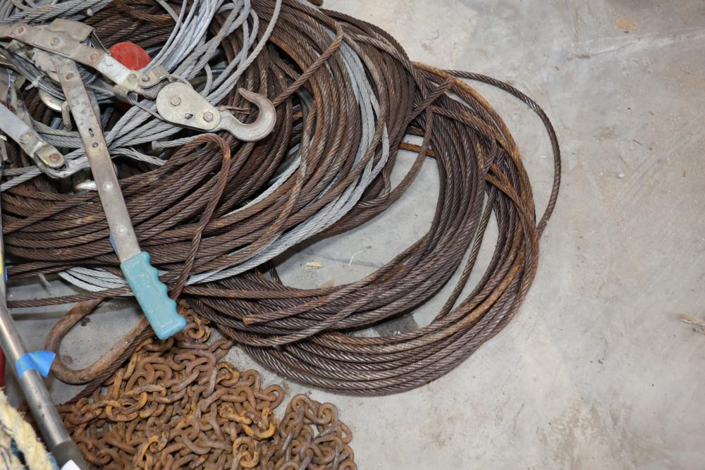 Cable, chain, and hoisting equipment including Tuf-Tug model TT6000 Hoist / Puller, assorted sized braided steel cable, chain, come-alongs, rope, etc.