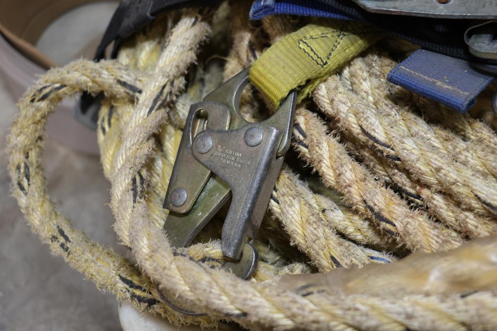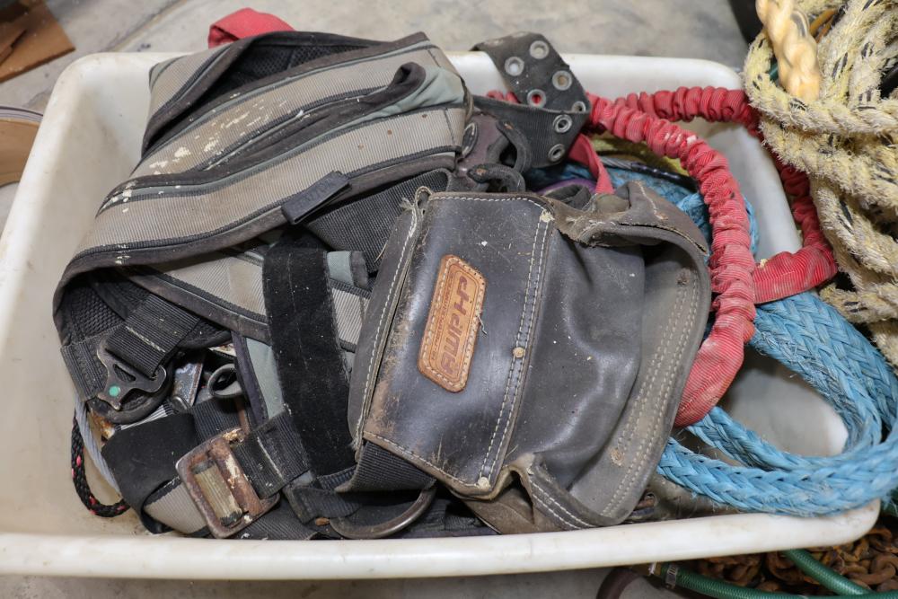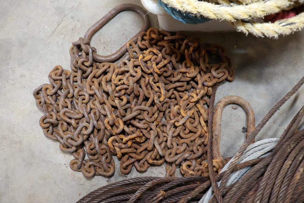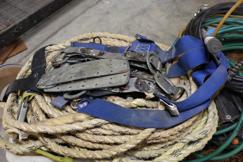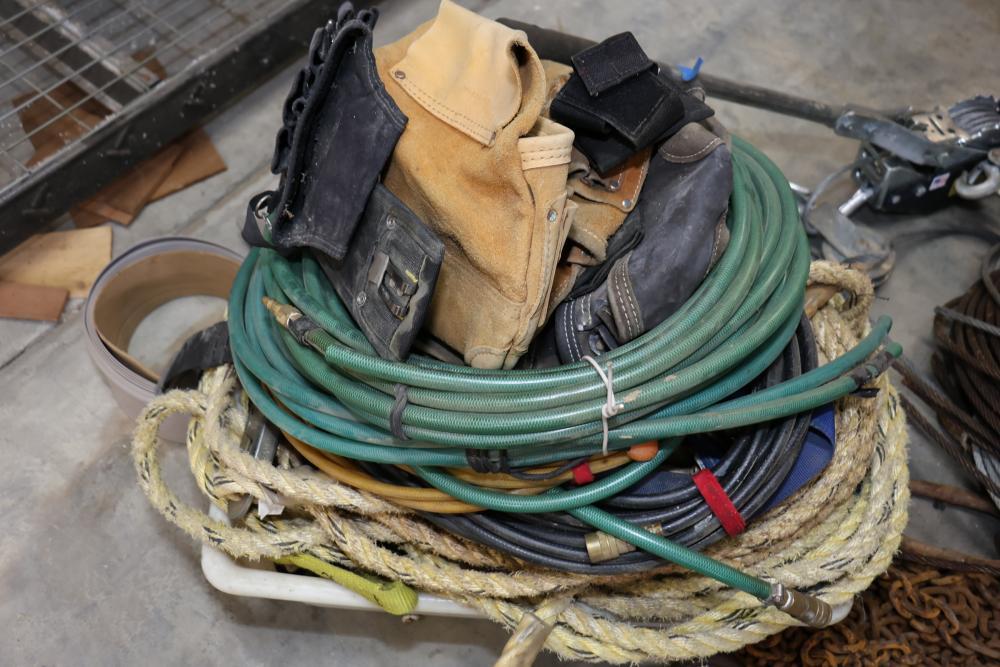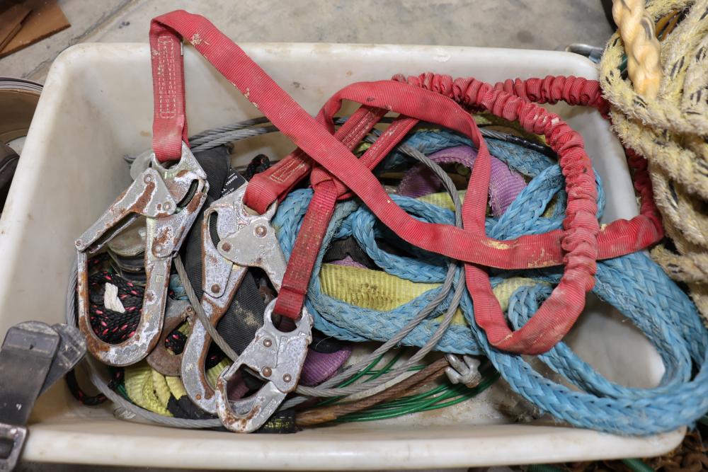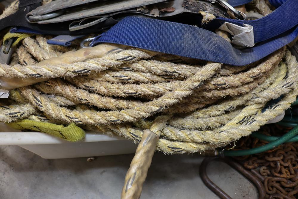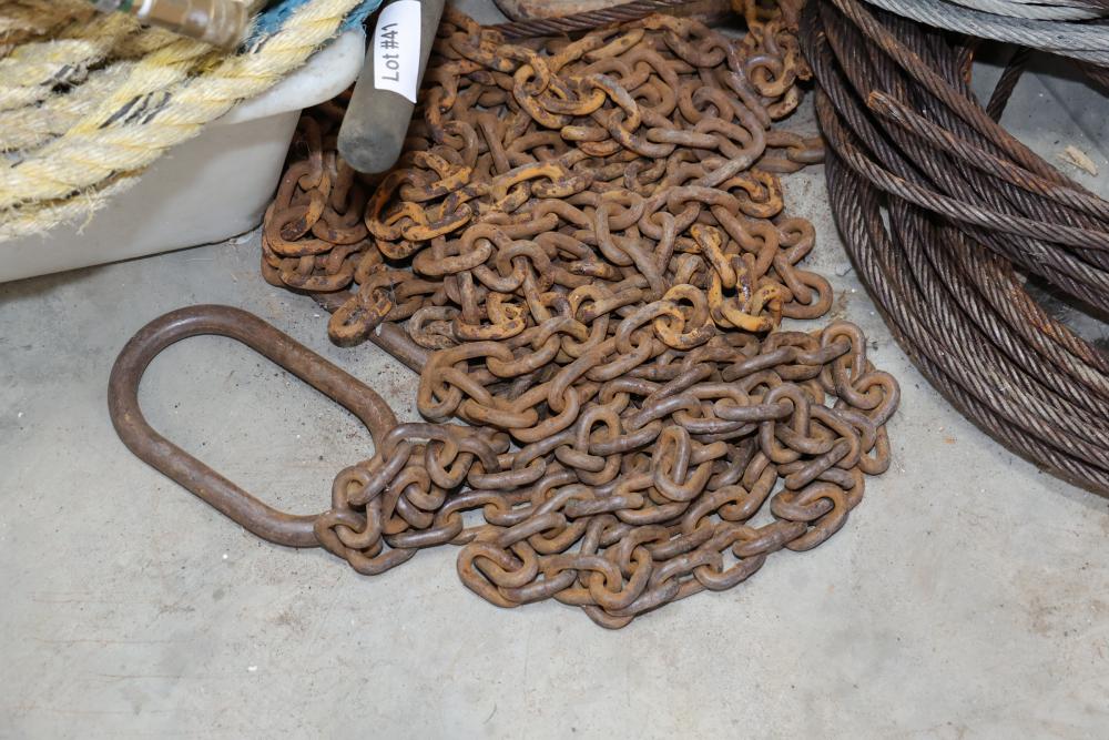 Cable, chain, and hoisting equipment including Tuf-Tug model TT6000 Hoist / Puller, assorted sized braided steel cable, chain, come-alongs, rope, etc.
