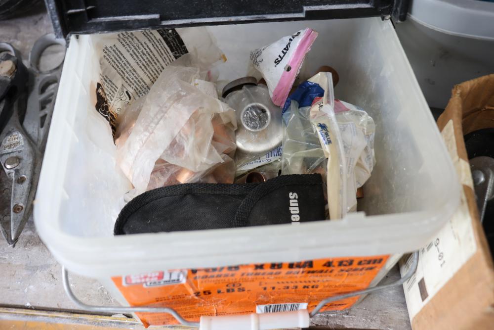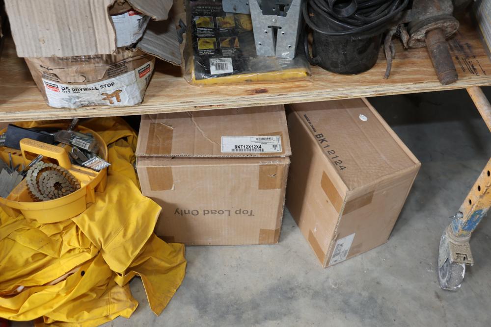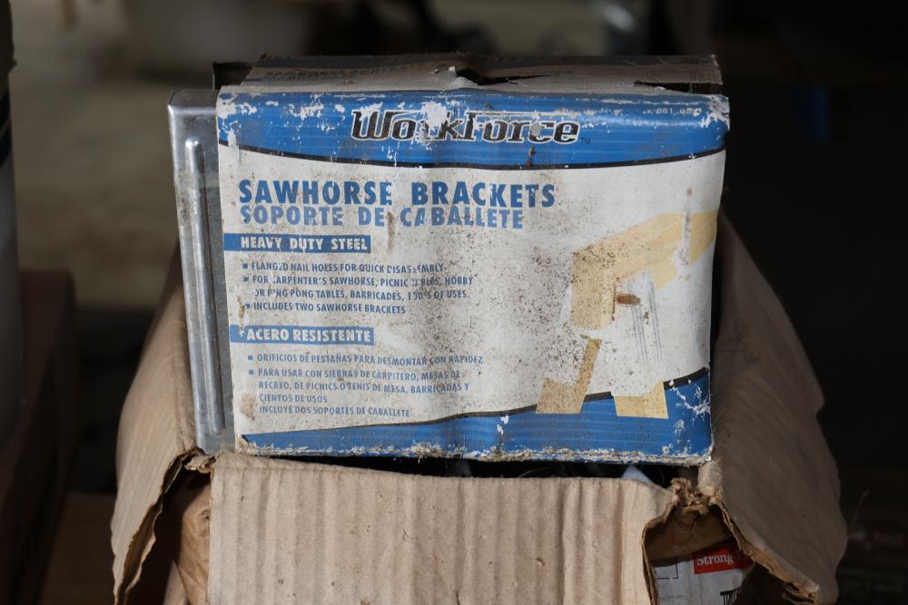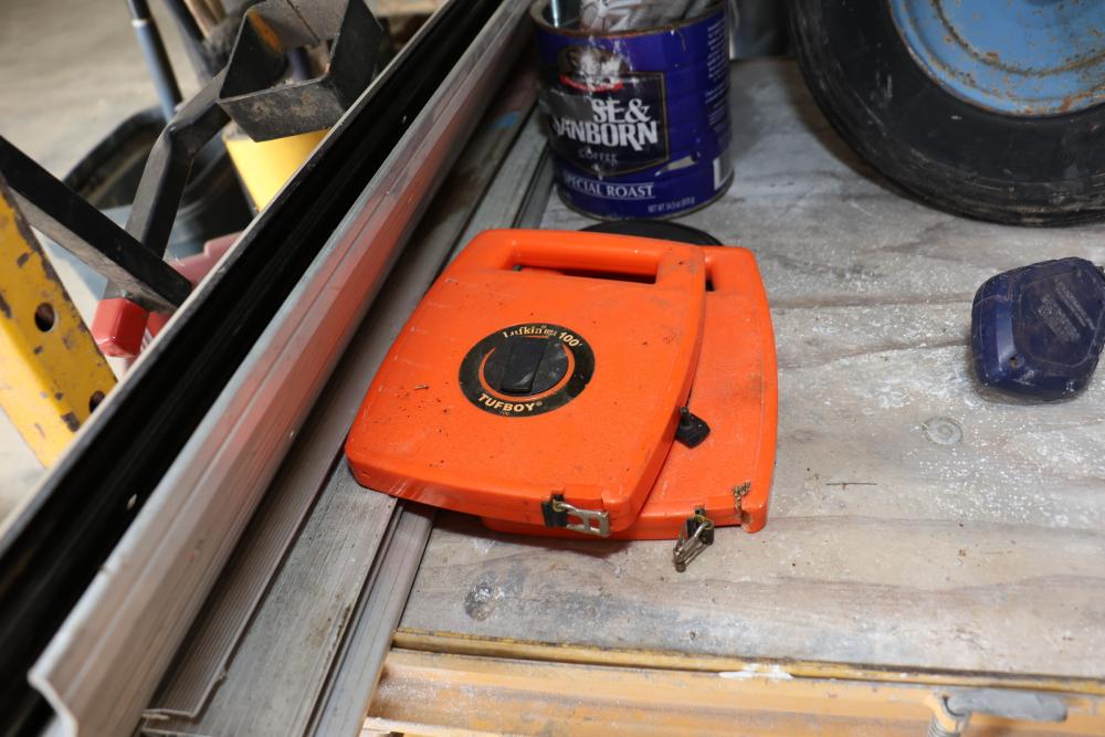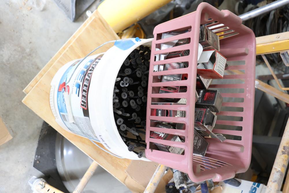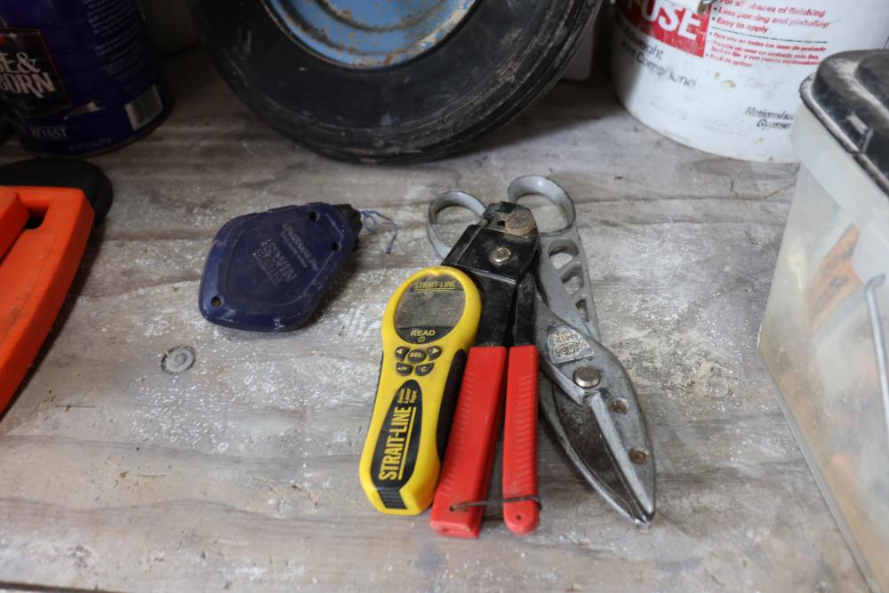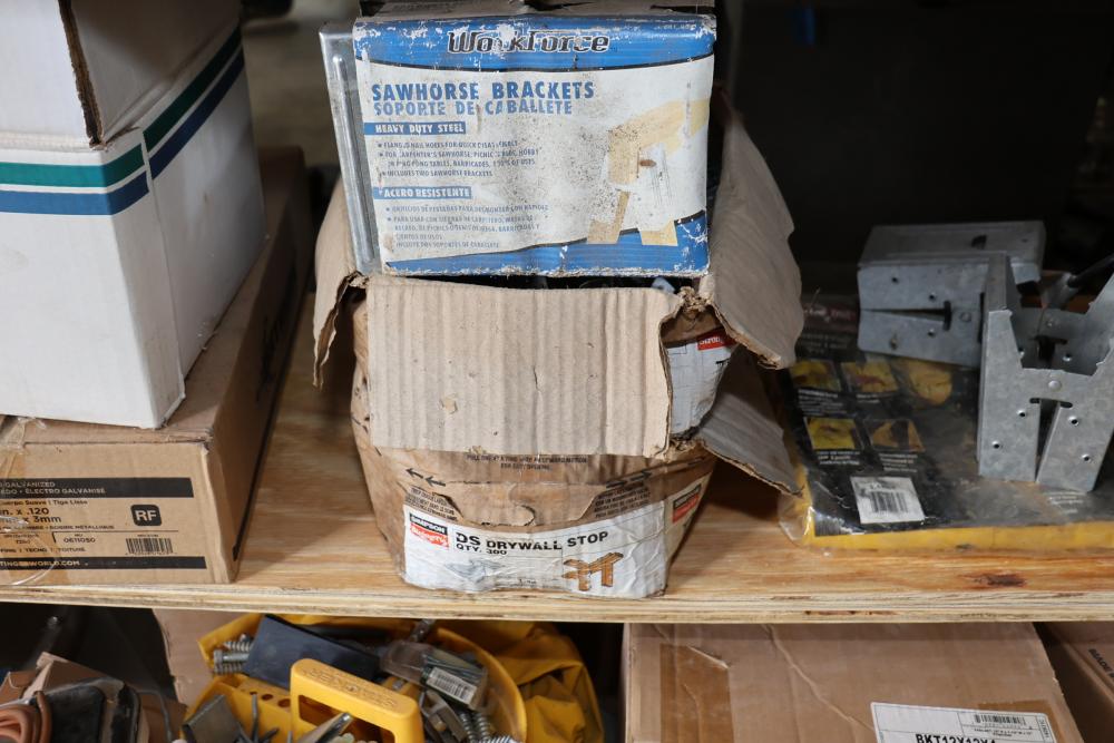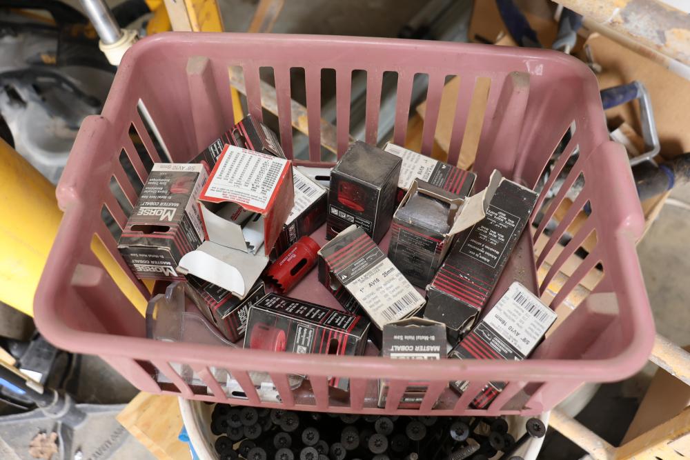 Hardware and tools including box of hole saws, bucket of long bolts, shears, strait-line sonic laser tape, two lurking USA 100' tufboy tape measures, Irwin strait-line chalk line guide tool, box of big d odor control fogger, DS drywall stop, Workforce sawhorse brackets, tape measures, chalk line, casters and more. Scaffolding not included.