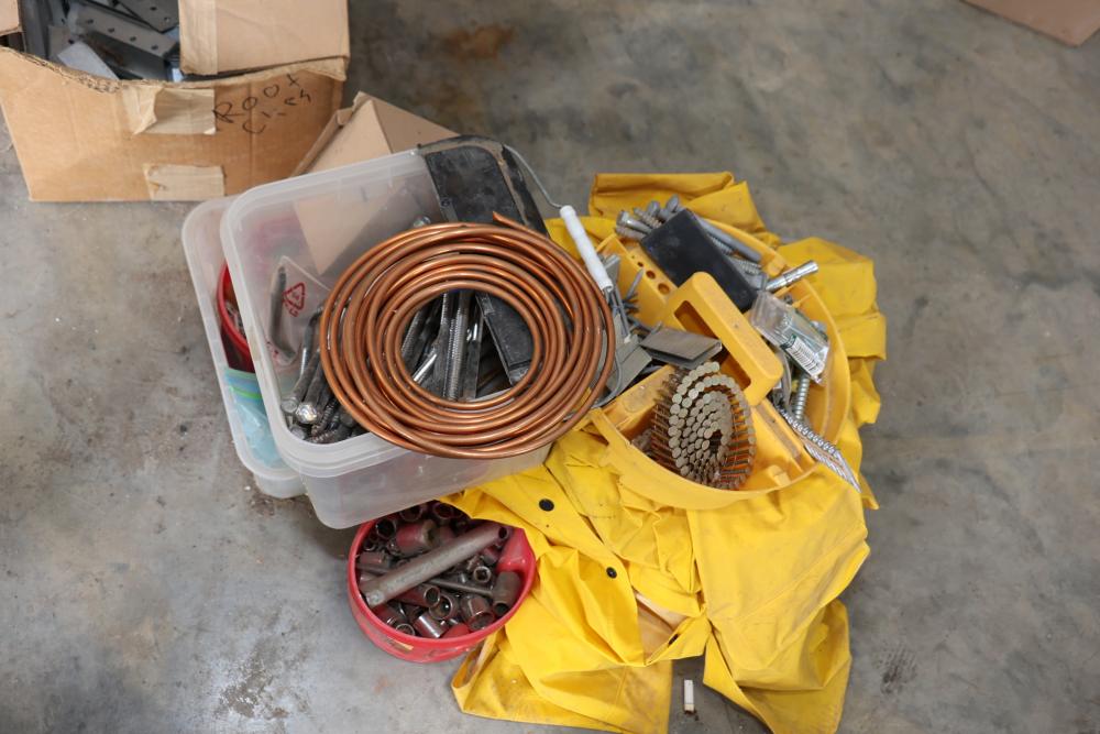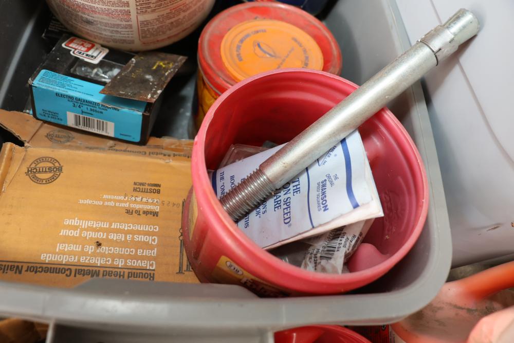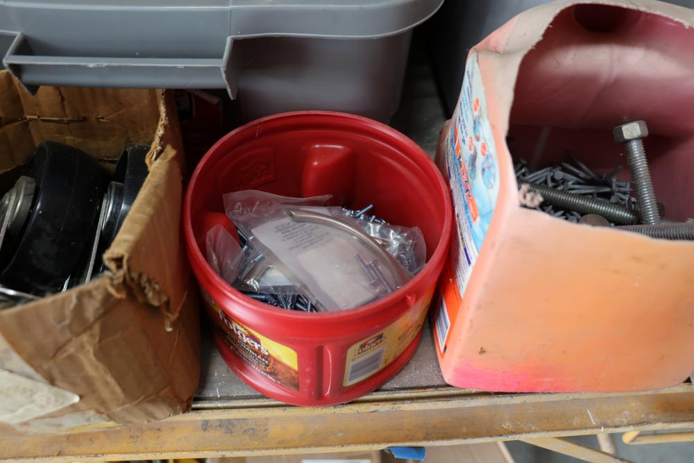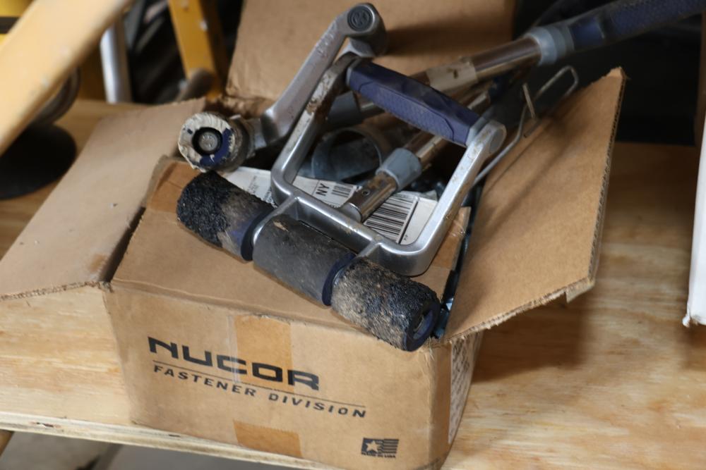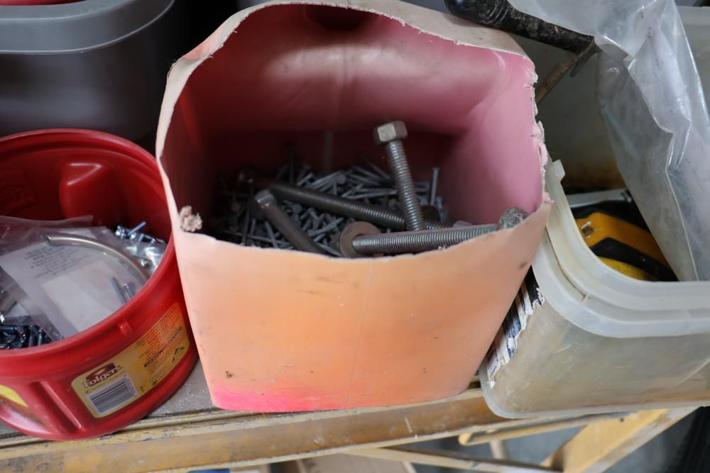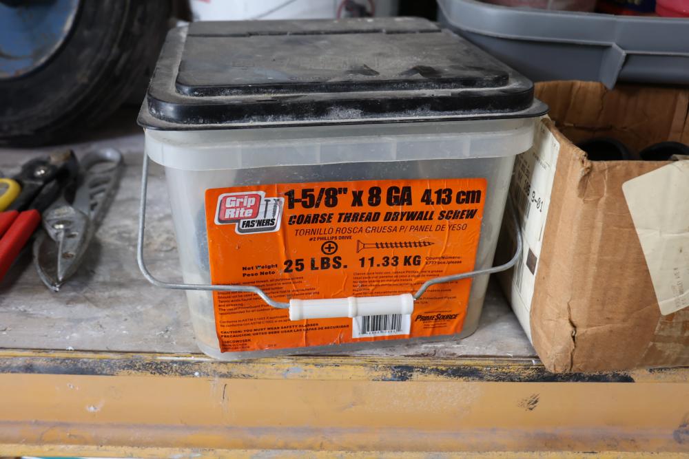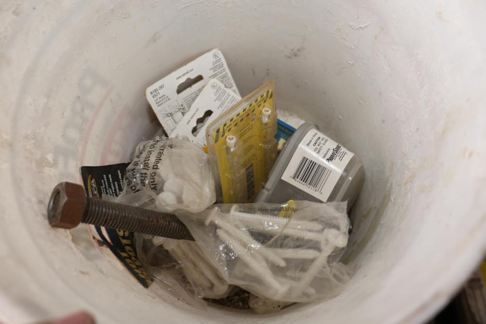 Hardware and tools including box of hole saws, bucket of long bolts, shears, strait-line sonic laser tape, two lurking USA 100' tufboy tape measures, Irwin strait-line chalk line guide tool, box of big d odor control fogger, DS drywall stop, Workforce sawhorse brackets, tape measures, chalk line, casters and more. Scaffolding not included.