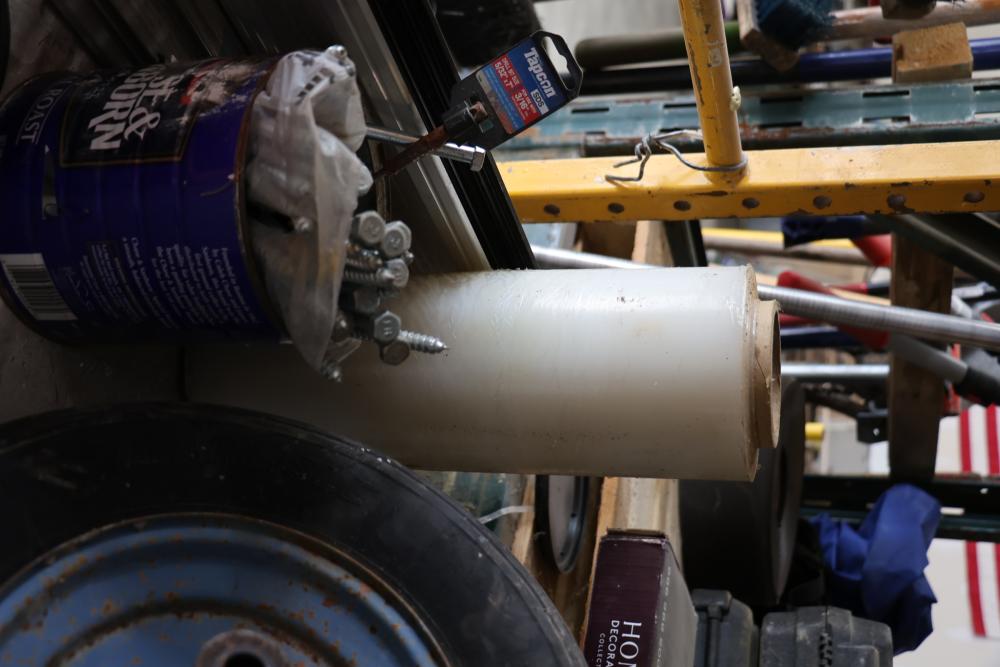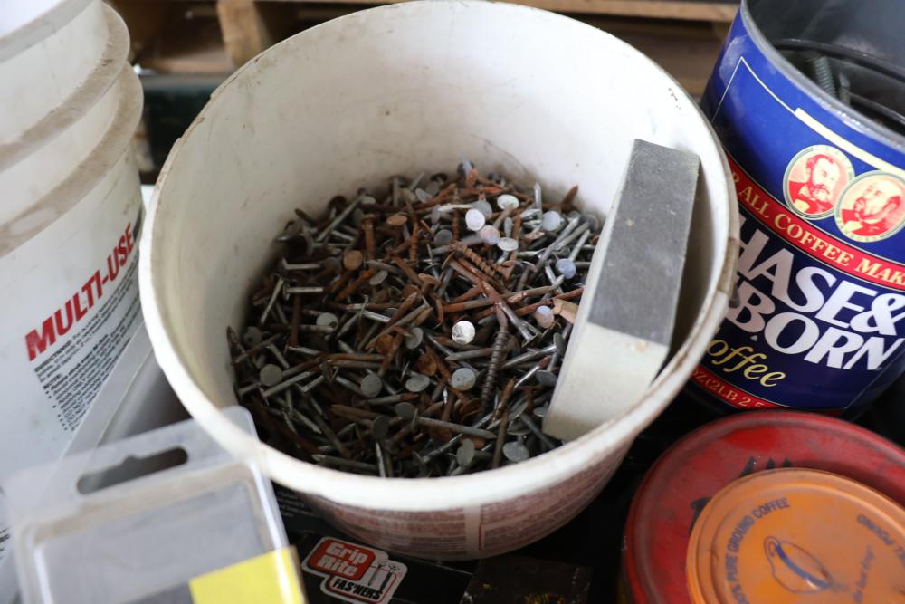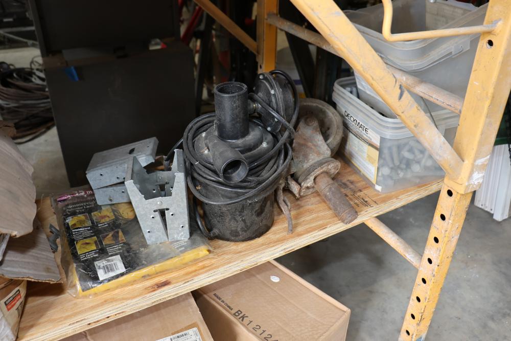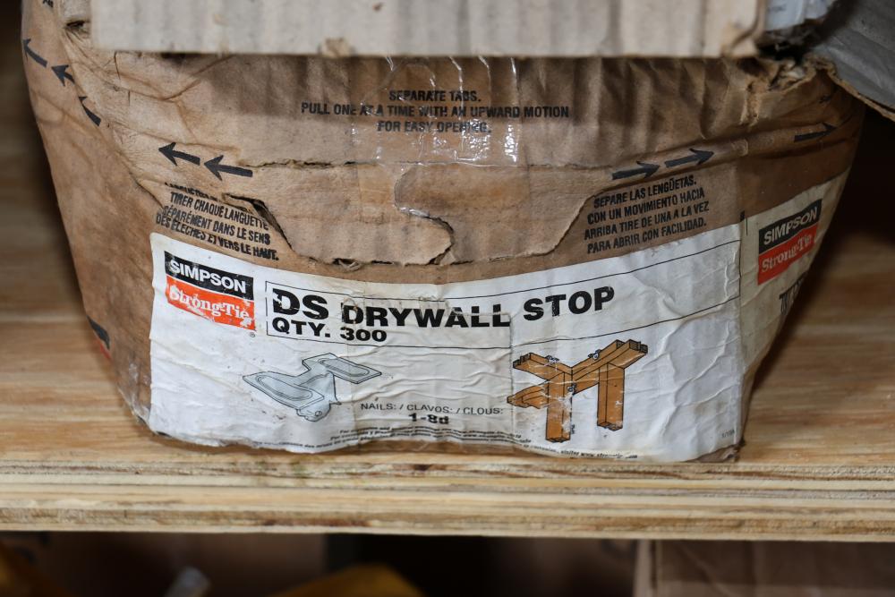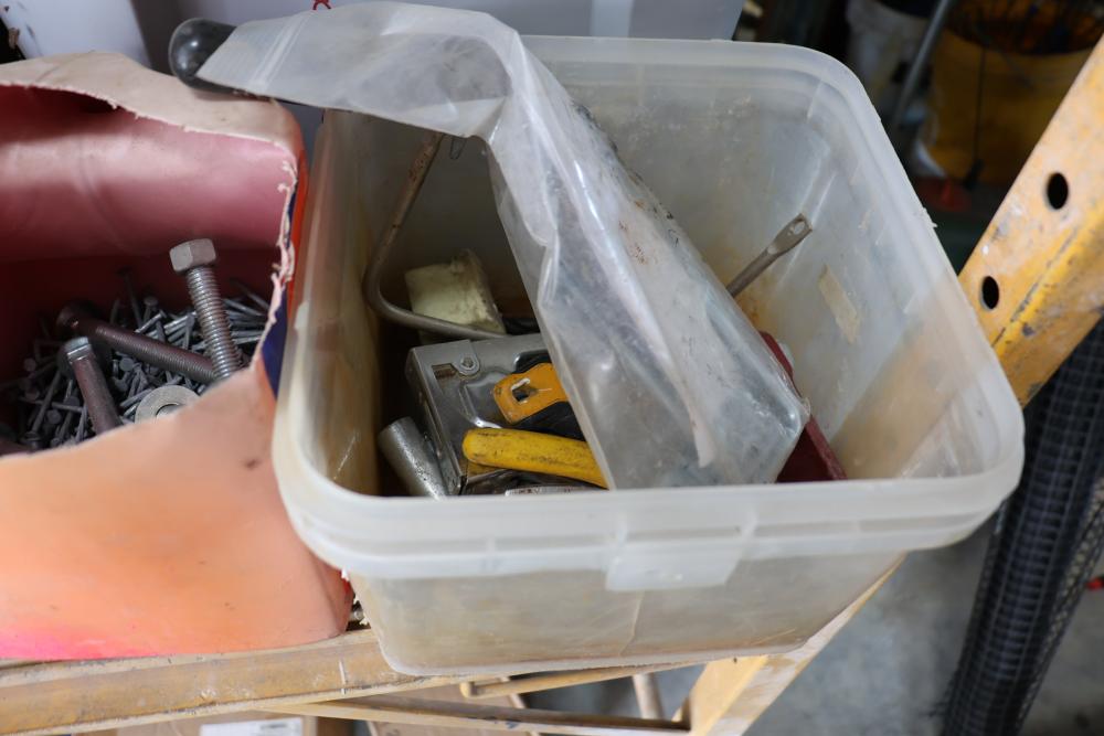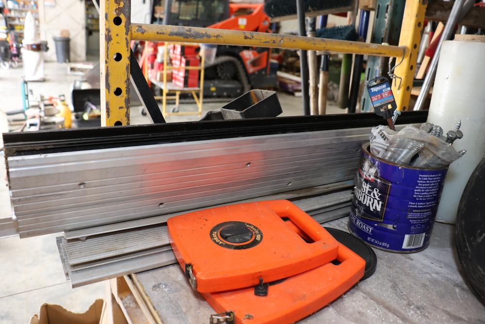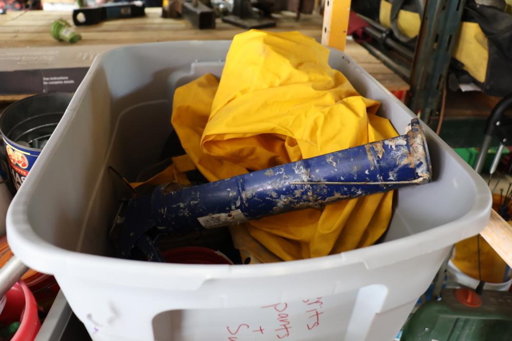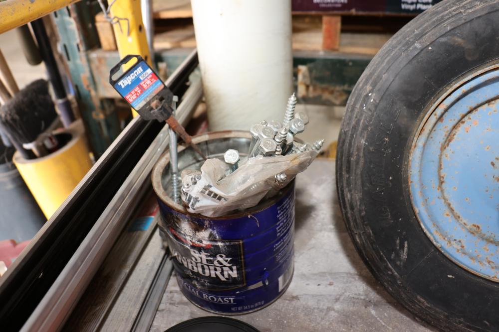 Hardware and tools including box of hole saws, bucket of long bolts, shears, strait-line sonic laser tape, two lurking USA 100' tufboy tape measures, Irwin strait-line chalk line guide tool, box of big d odor control fogger, DS drywall stop, Workforce sawhorse brackets, tape measures, chalk line, casters and more. Scaffolding not included.