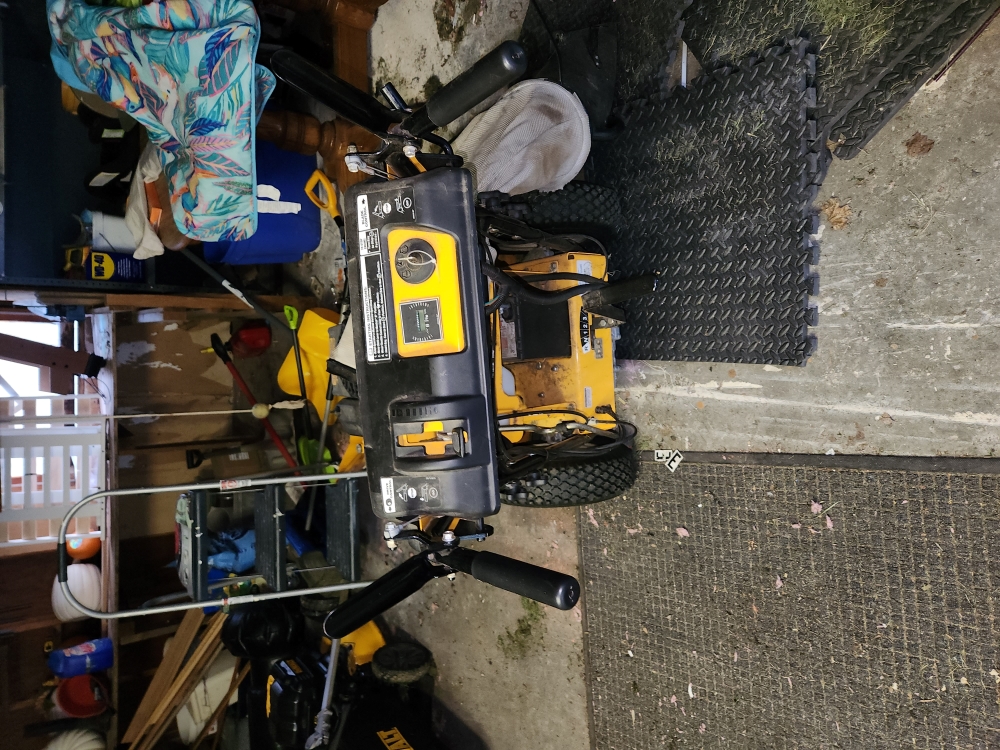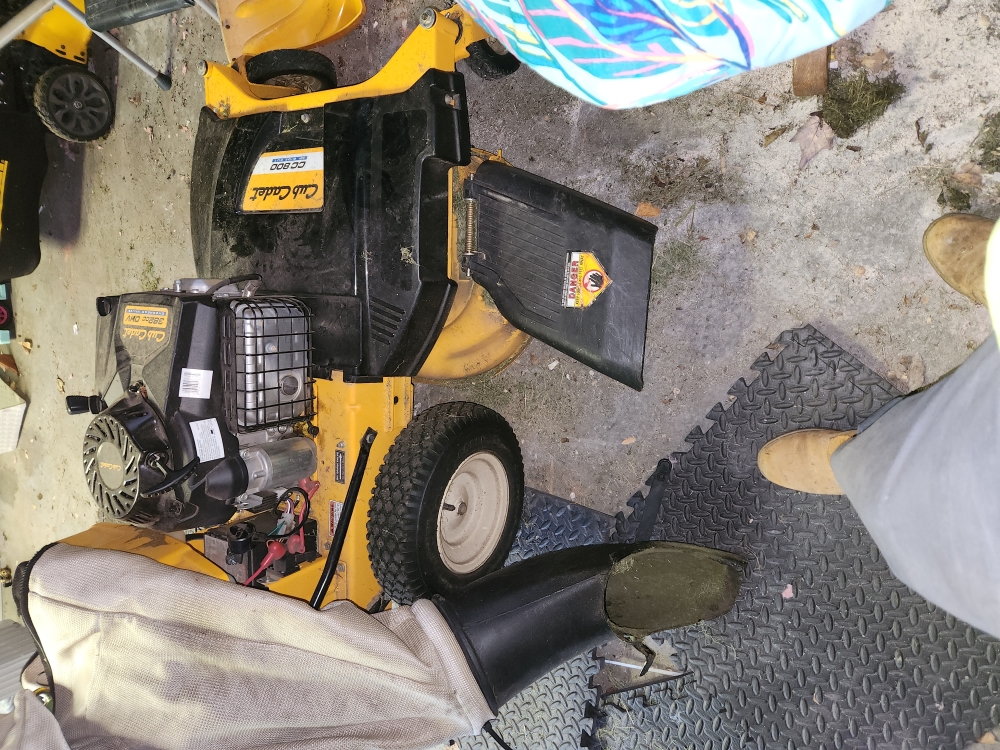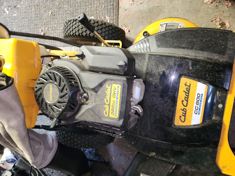 Cub Cadet model CC800 push mower with 33" wide cutting path, 382cc engine, electric start, seller reports runs great, hour meter reading 60 hours, needs air in tire and a battery.