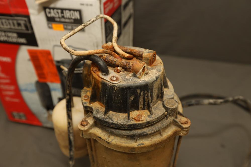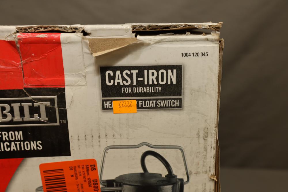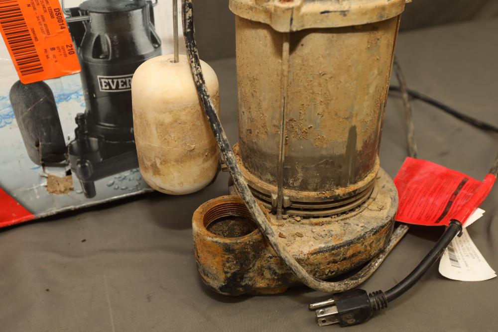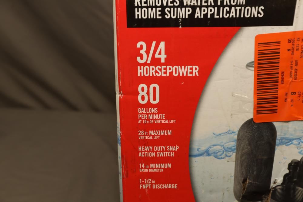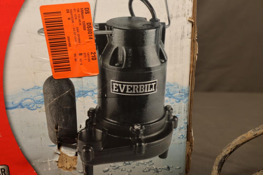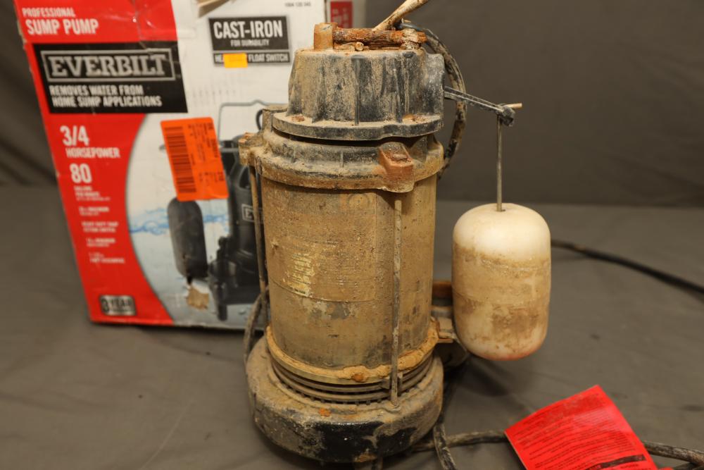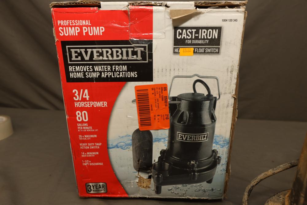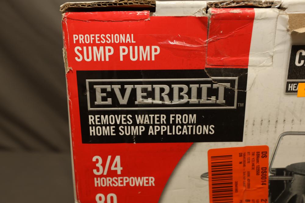 Everbilt snap action cast-iron 3/4 HP professional sump pump model HDS75 with capacity of 80gpm. Powers on when plugged-in.