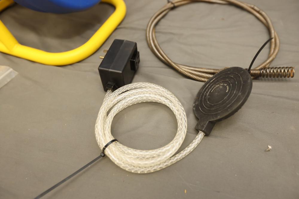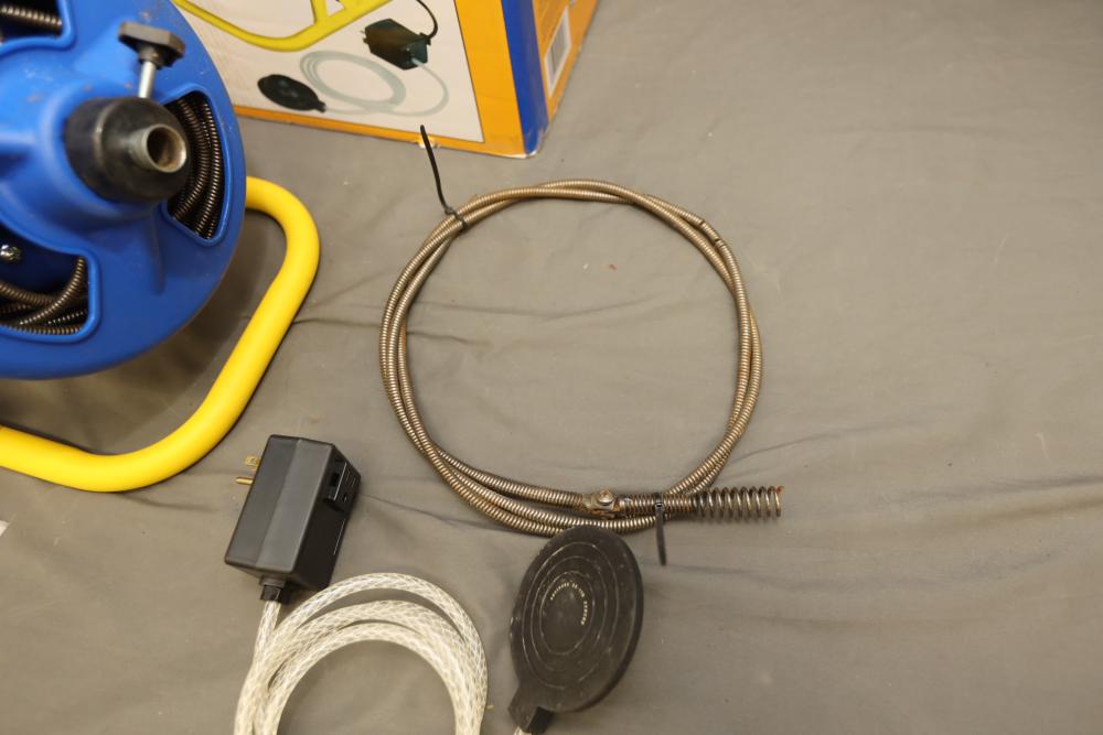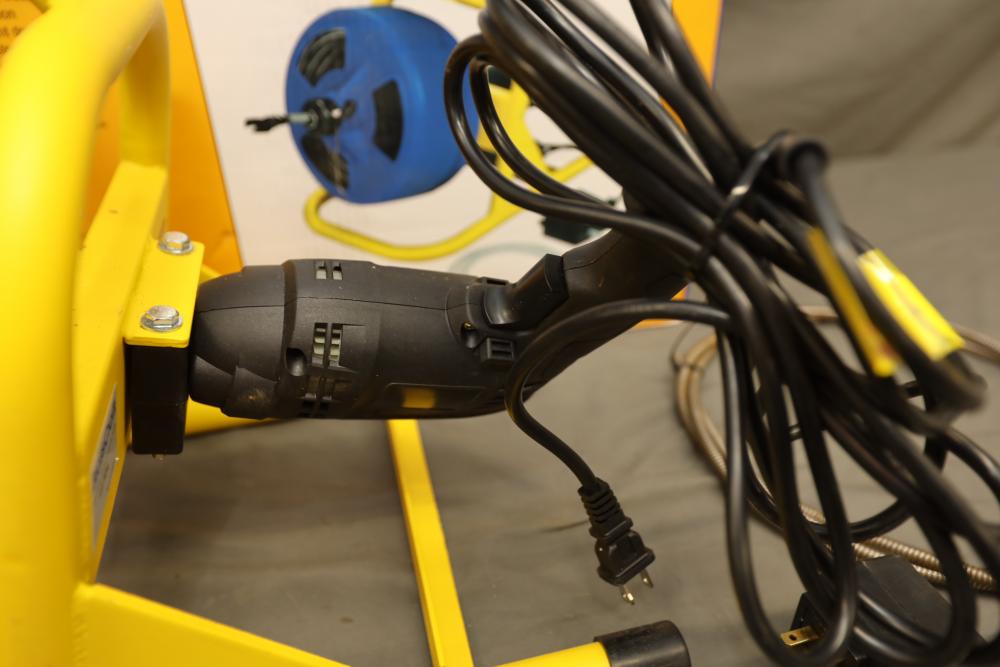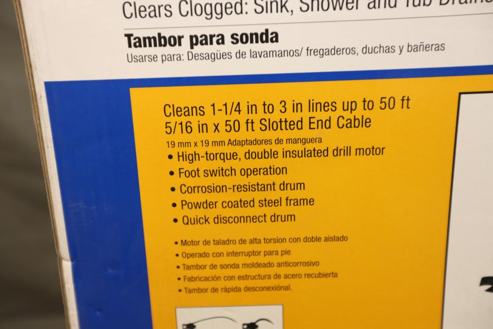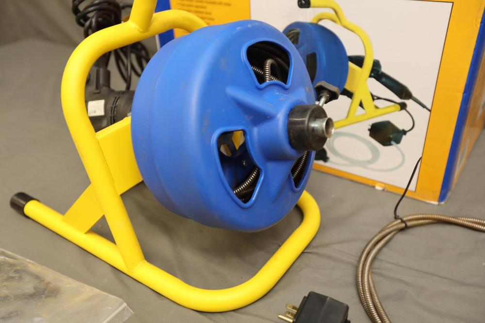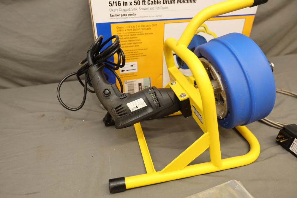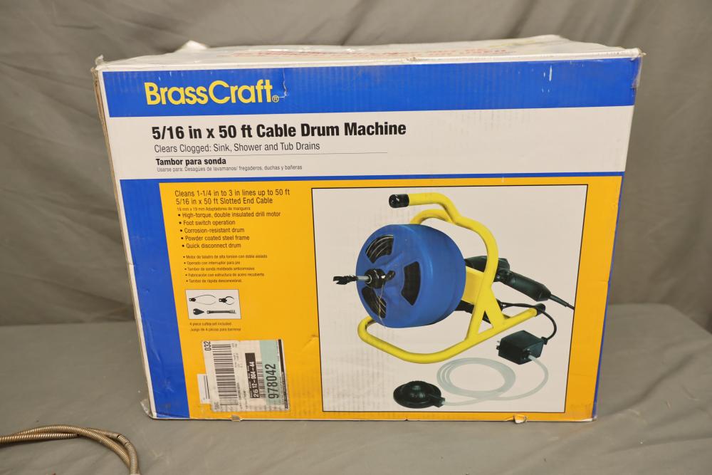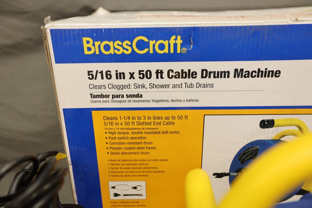 BrassCraft 5/16"x50' cable drum machine model BC260 with attachments. Runs and operates.