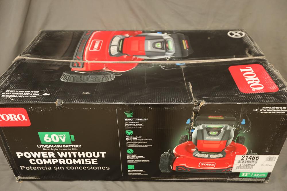 Toro Recycler 22" 60V battery self-propelled lawn mower kit model 21466 with battery and charger. Appears to be new in box.