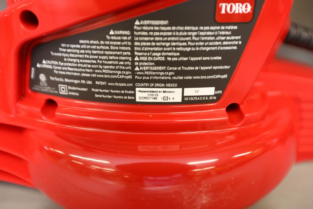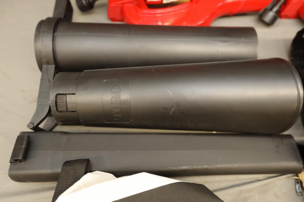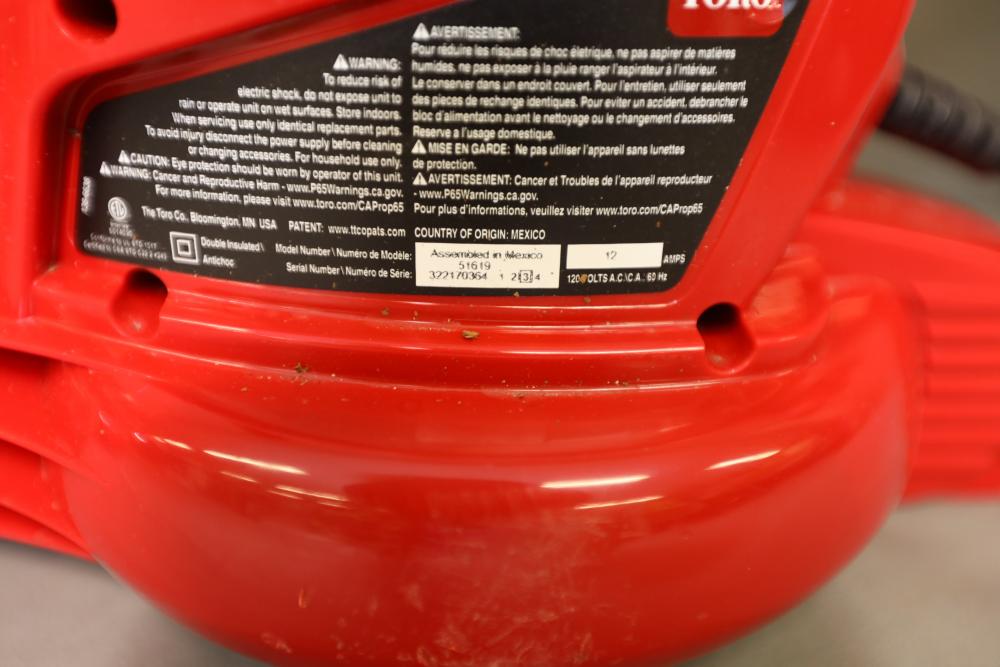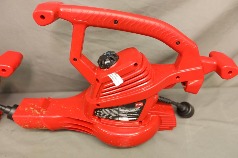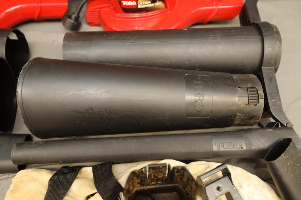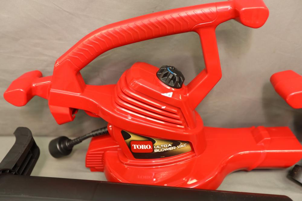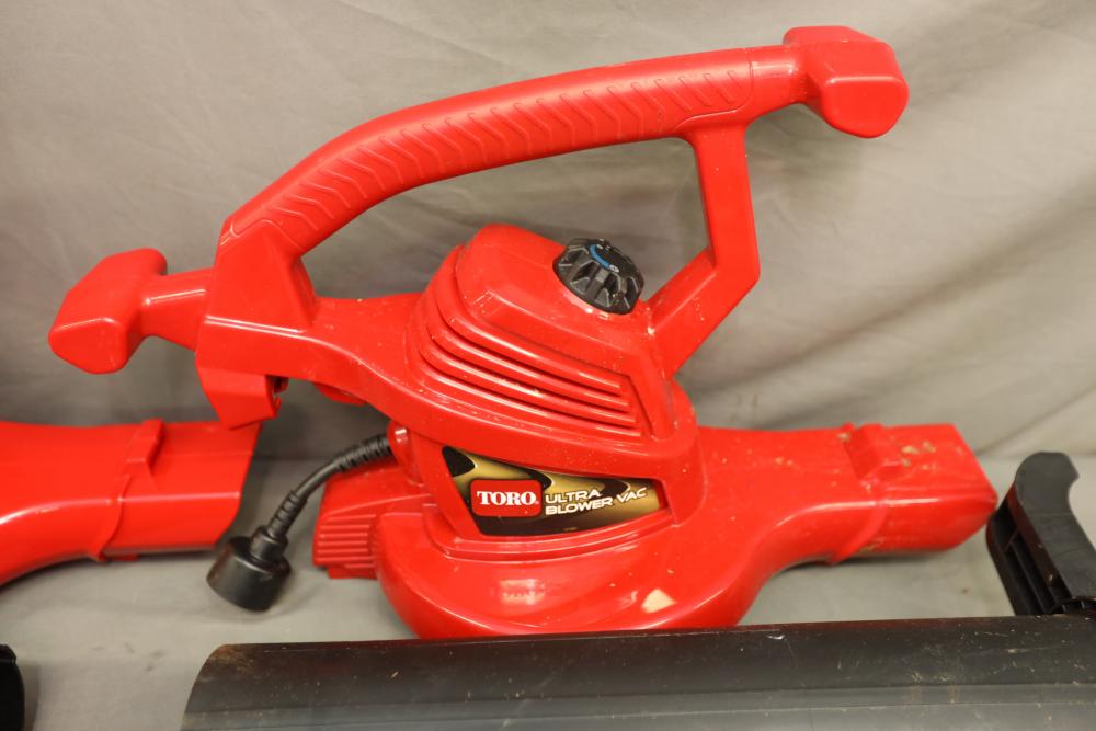 Two Toro electric ultra-blower 3 in 1 vac model 51619, high speed vacuum, leaf shredder, and blower with attachments. Both blowers are non-operational.