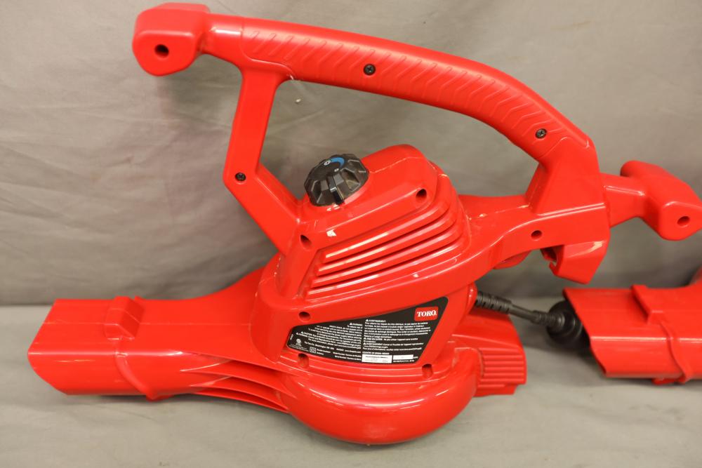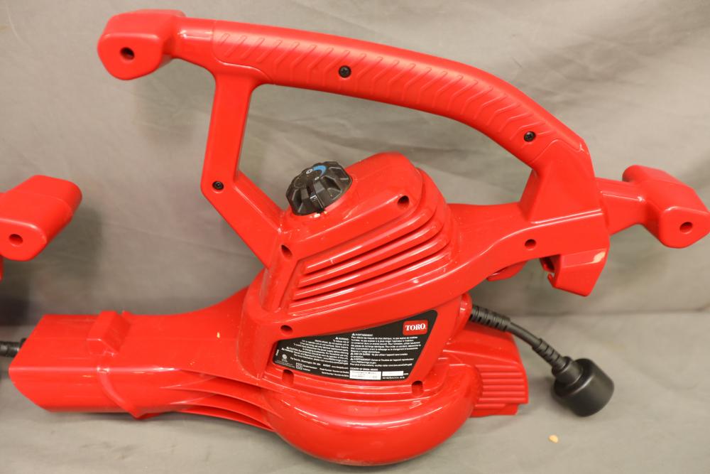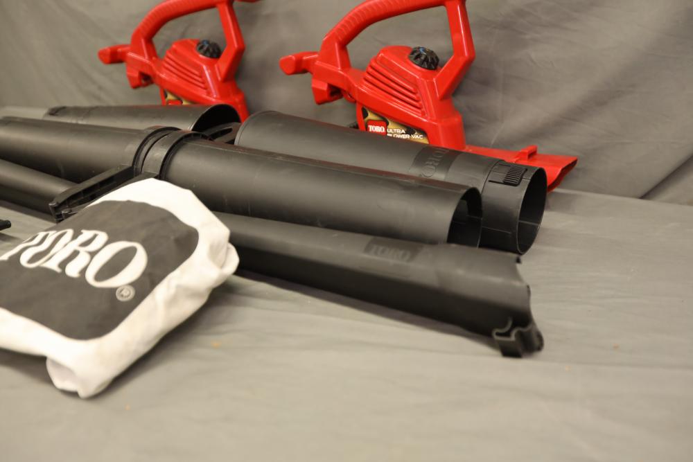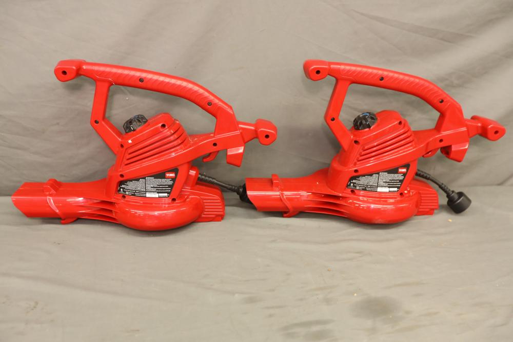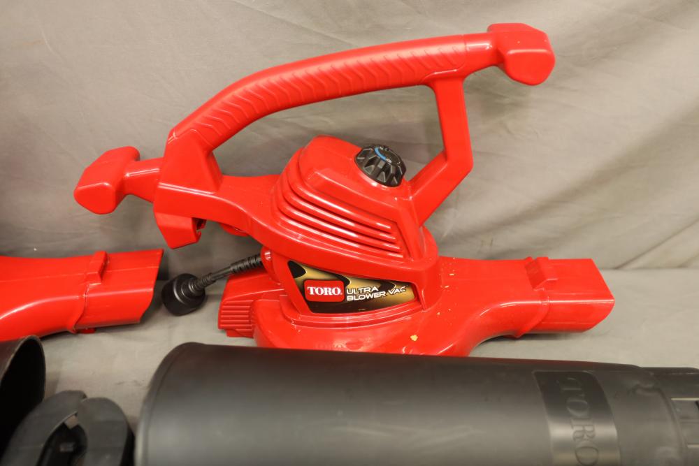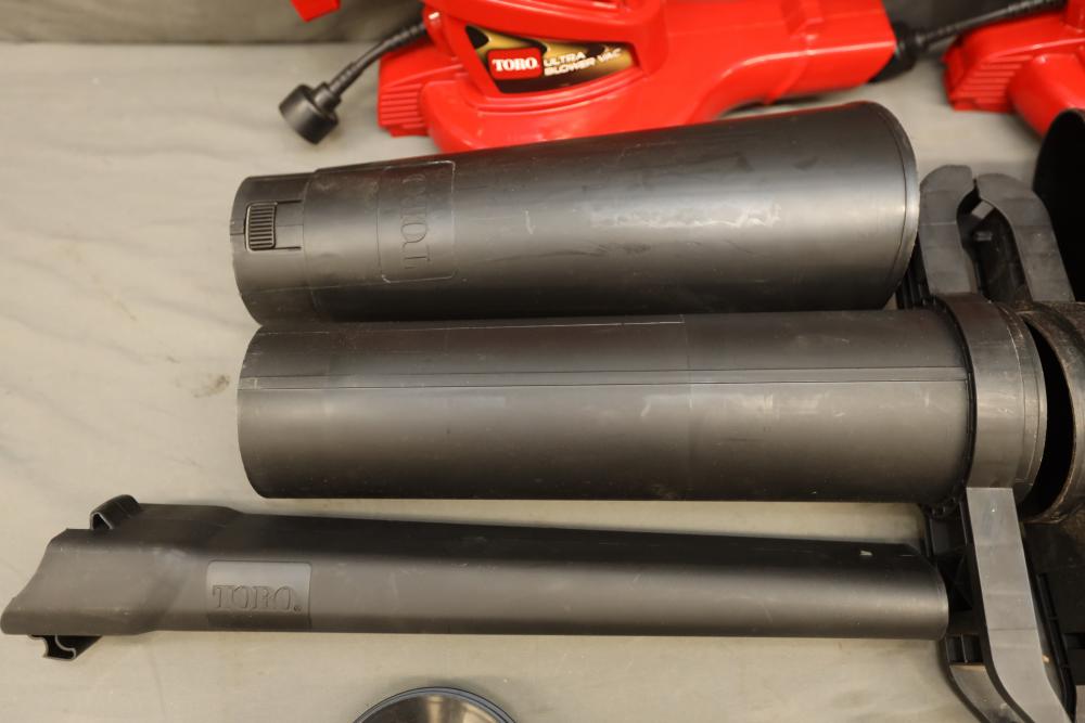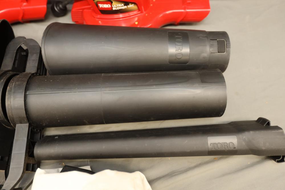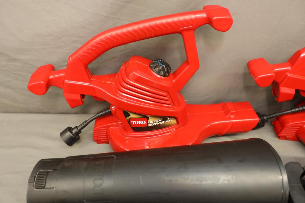 Two Toro electric ultra-blower 3 in 1 vac model 51619, high speed vacuum, leaf shredder, and blower with attachments. Both blowers are non-operational.