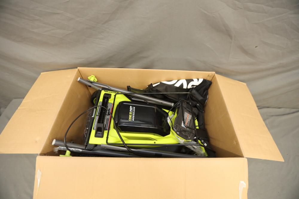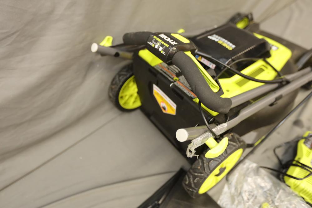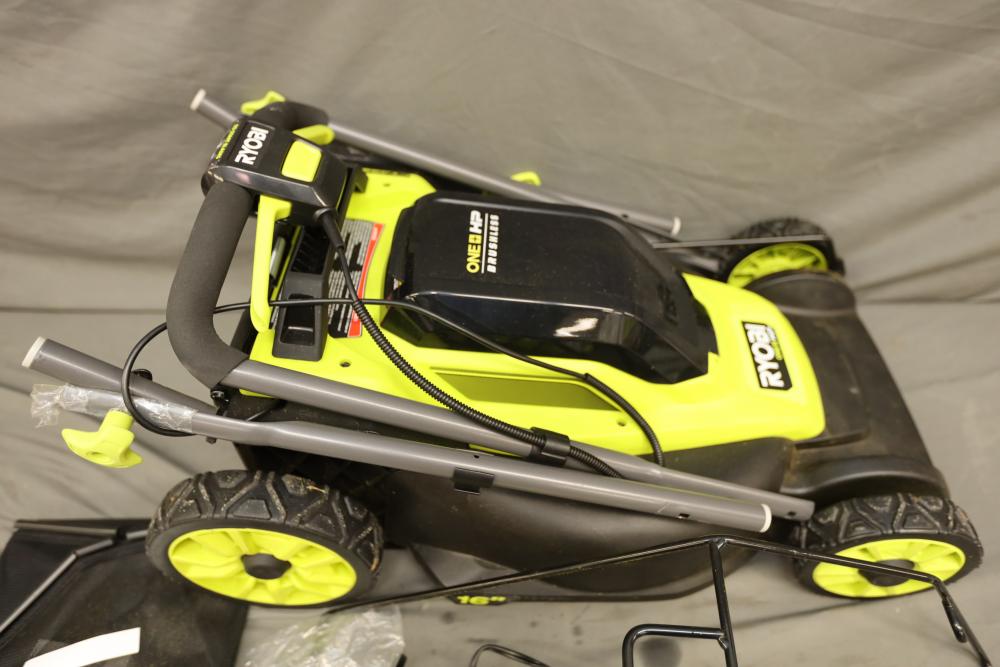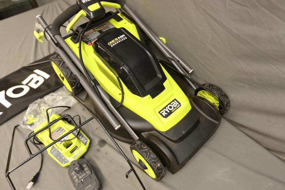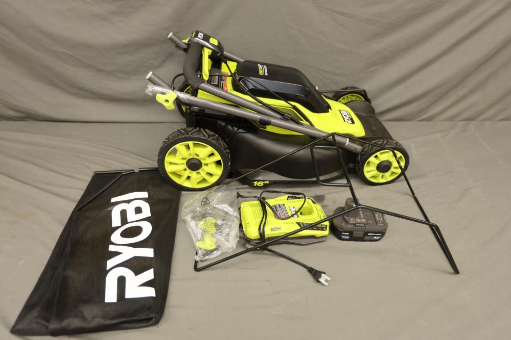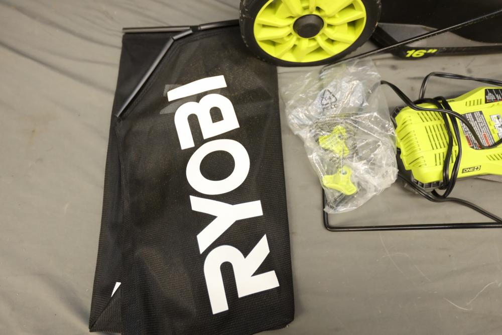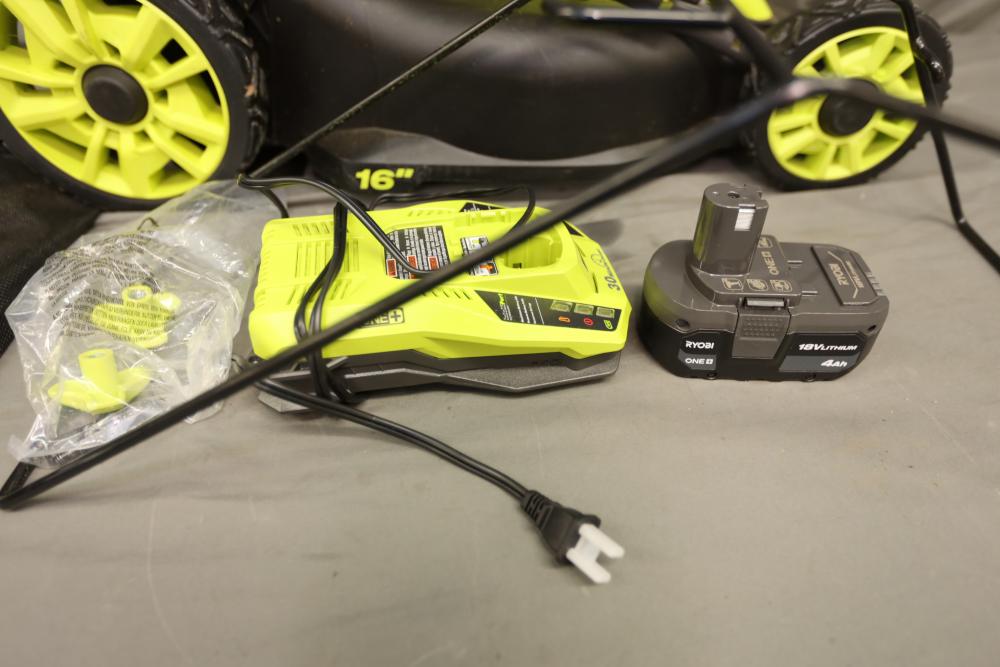Ryobi ONE+ 18 volt brushless 16" cordless battery walk behind push mower with battery and charger. Runs and operates.