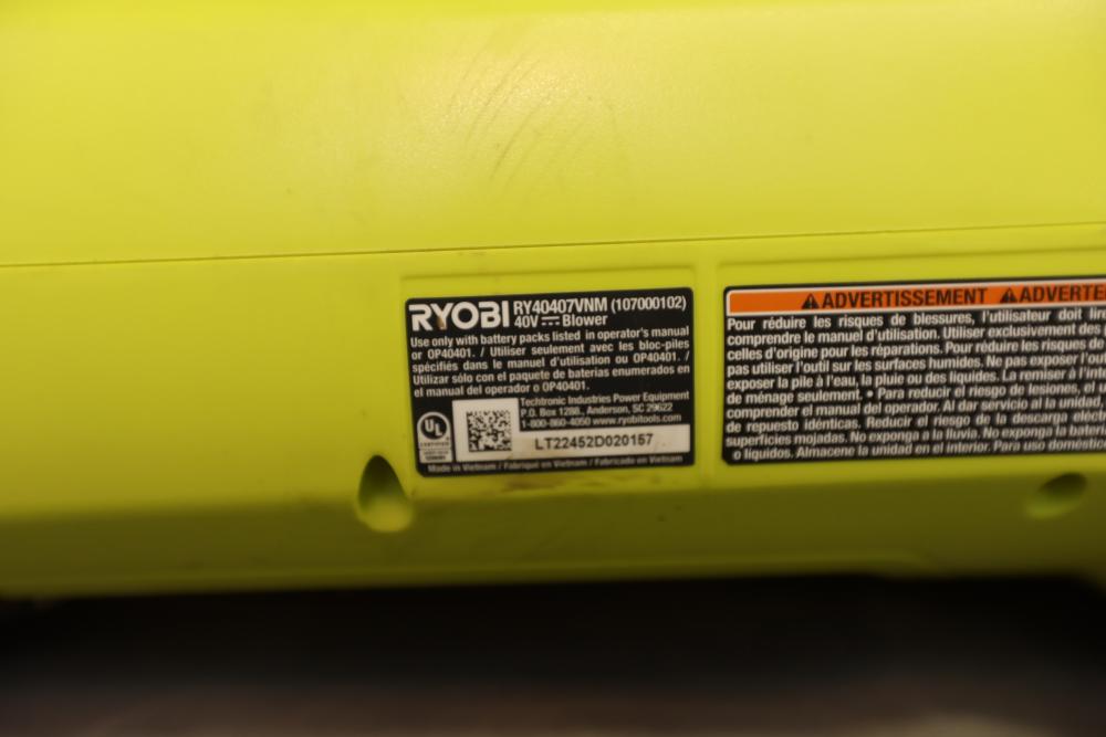 Ryobi whisper-series 40V jet-blower with brushless motor model RY40407VNM. Runs and operates but does not come with battery.