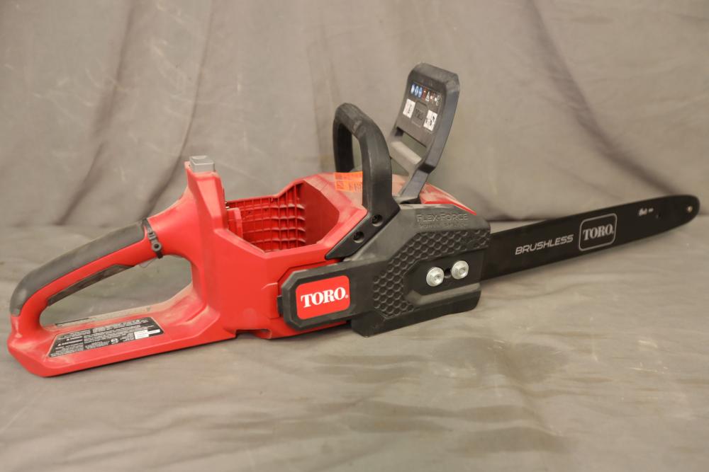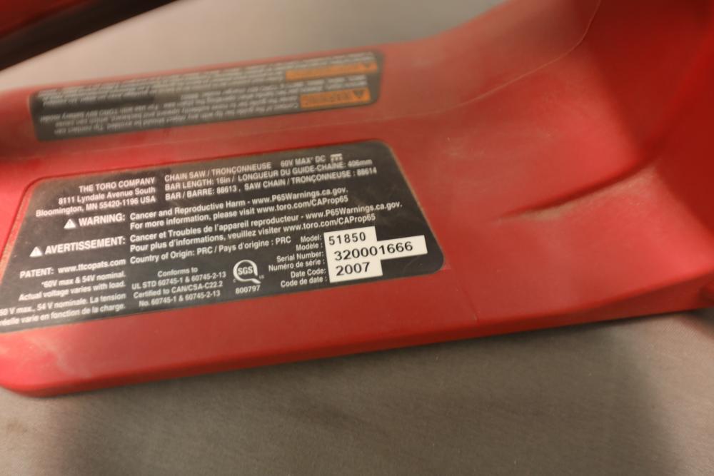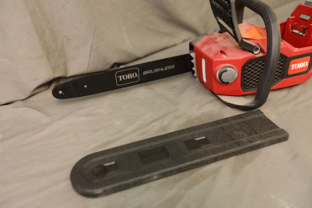 Toro 60V Max 16" cordless electric brushless chainsaw model 51850. Runs and operates but does not include chain, battery or charger.