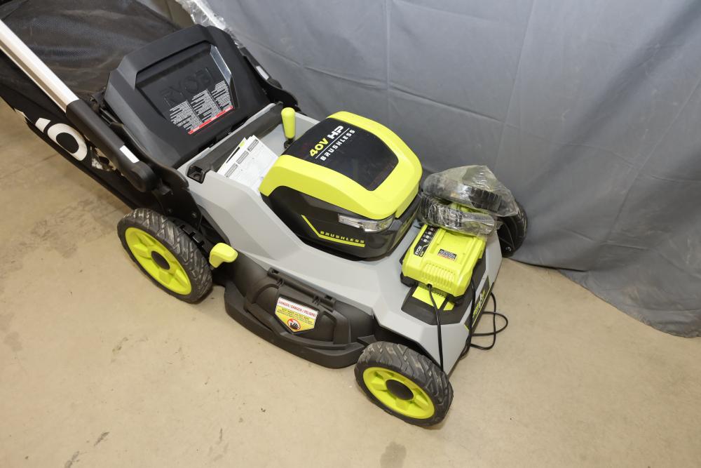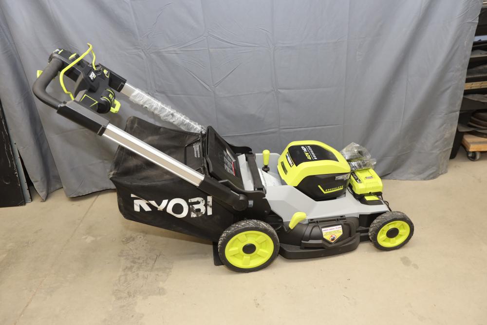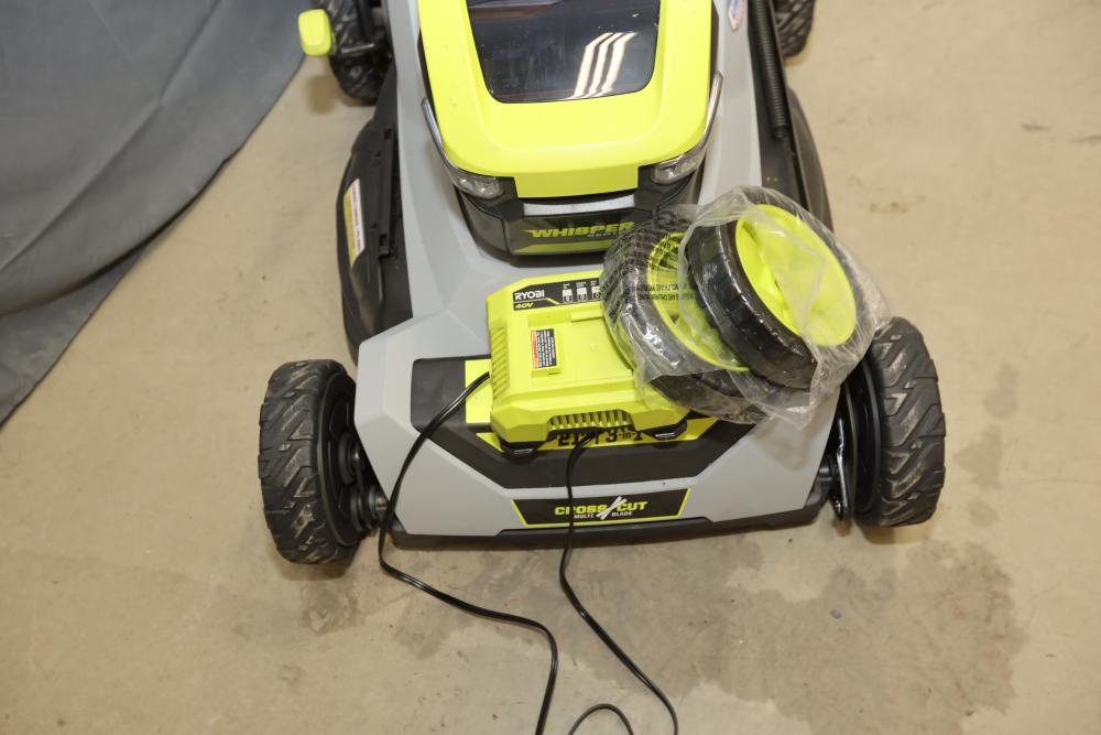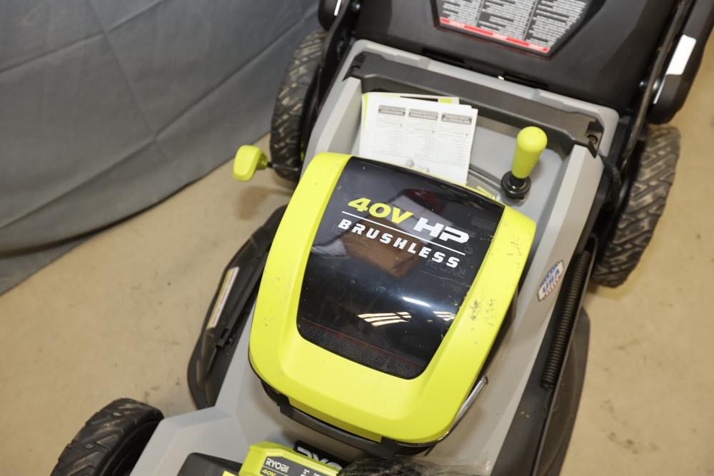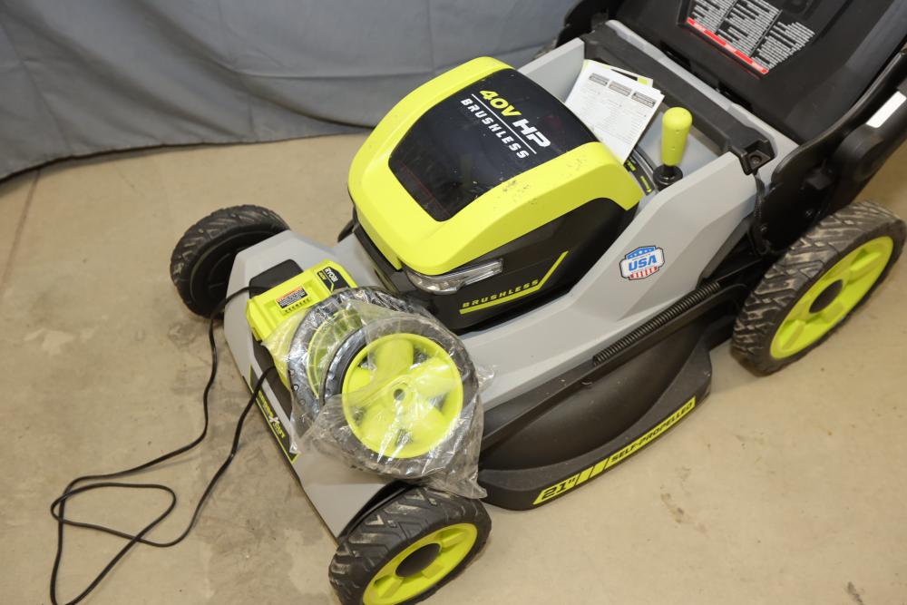 Ryobi 21" AWD walk-behind self-propelled electric mower model RY401021 with two 40-volt batteries, charger and spare front wheels.