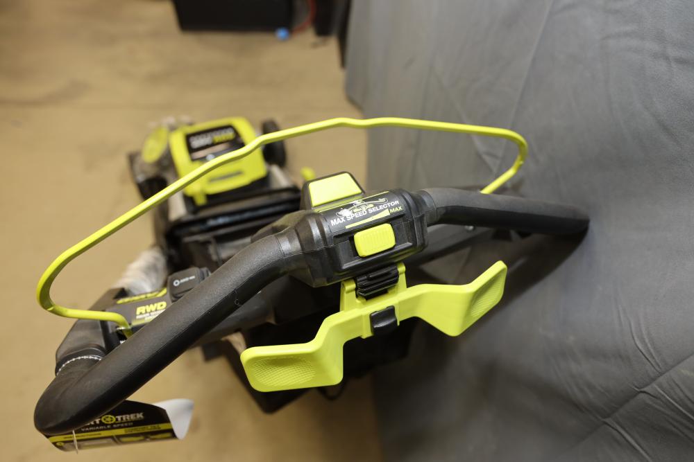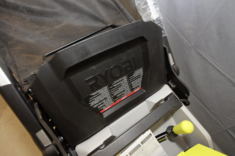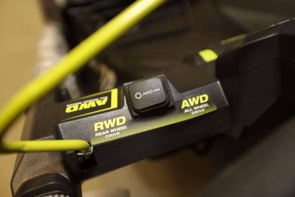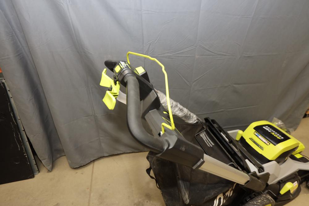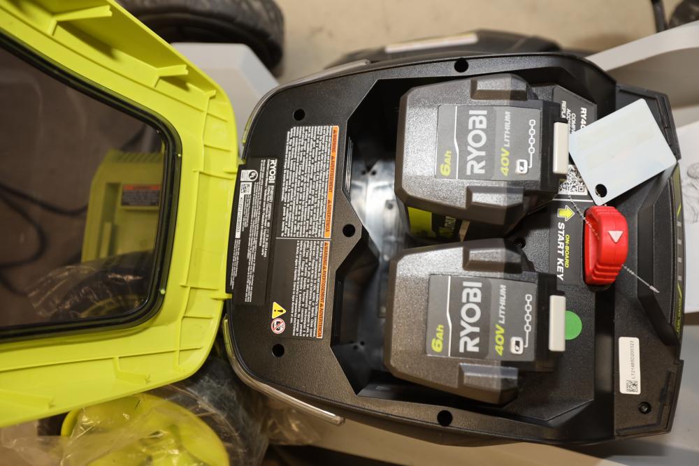 Ryobi 21" AWD walk-behind self-propelled electric mower model RY401021 with two 40-volt batteries, charger and spare front wheels.